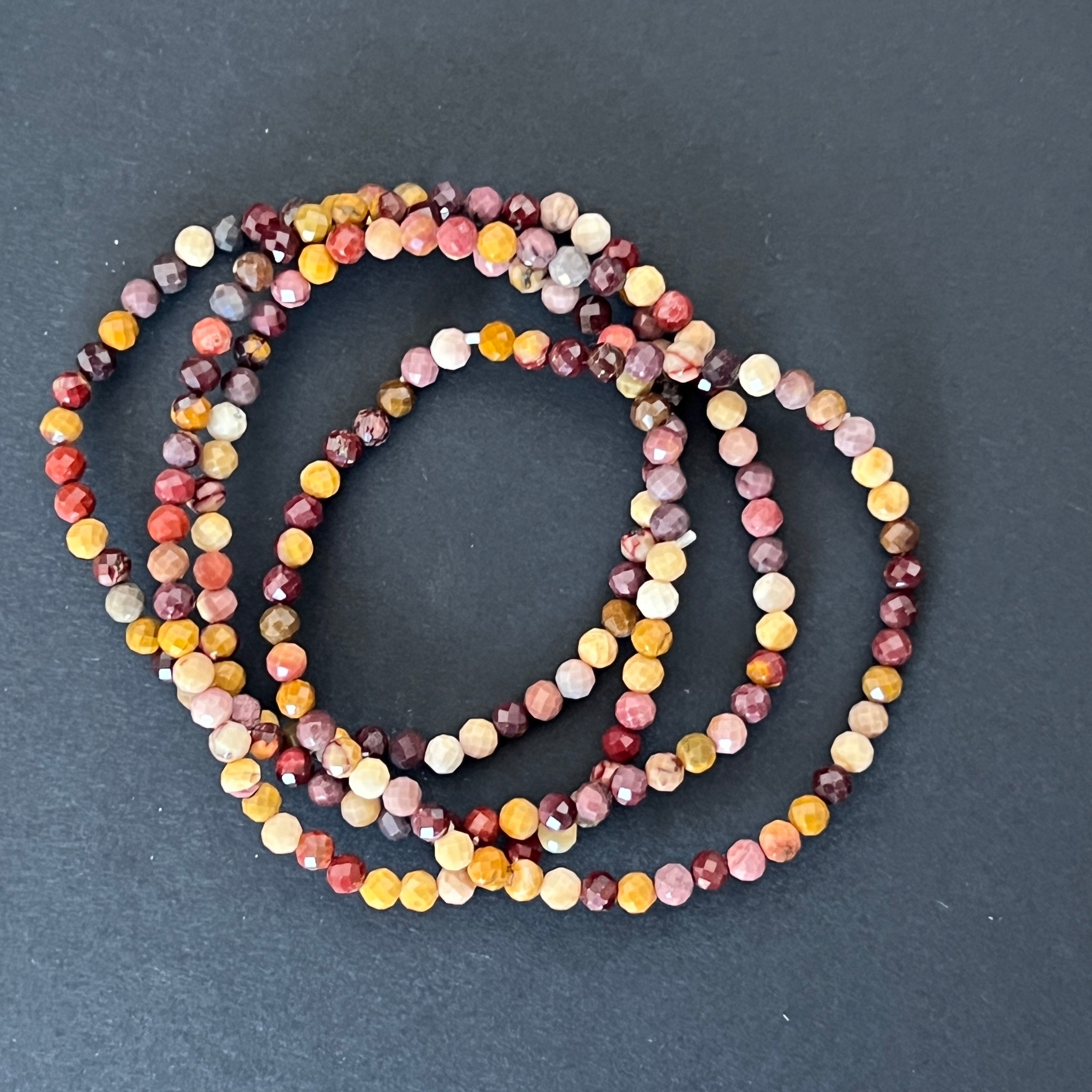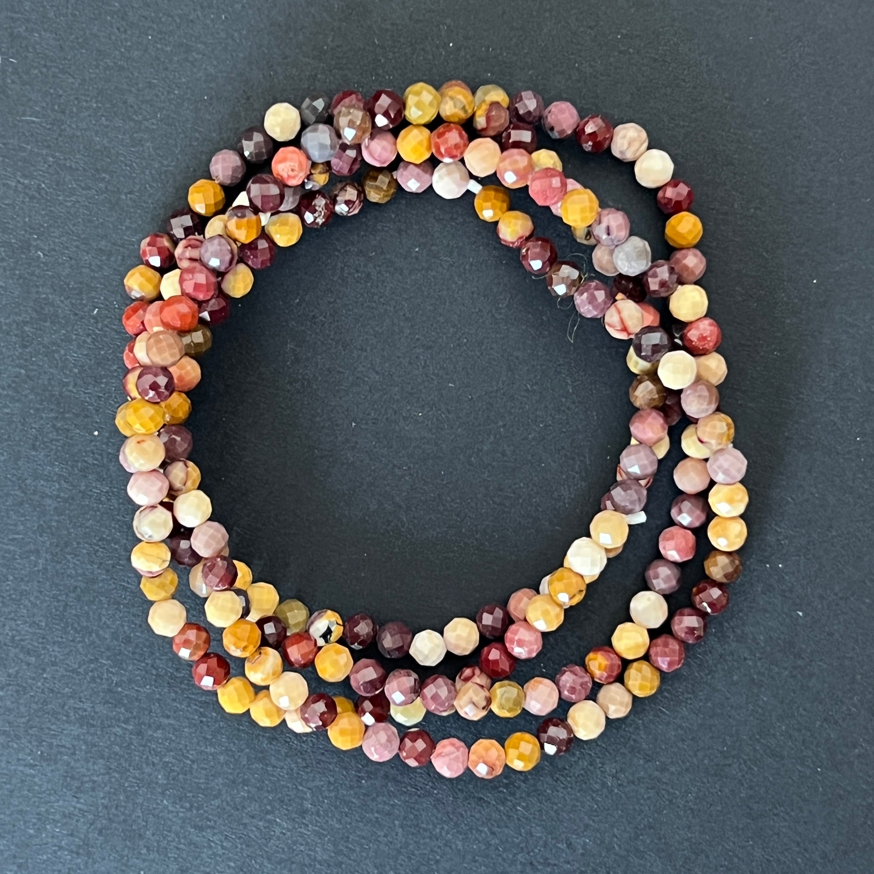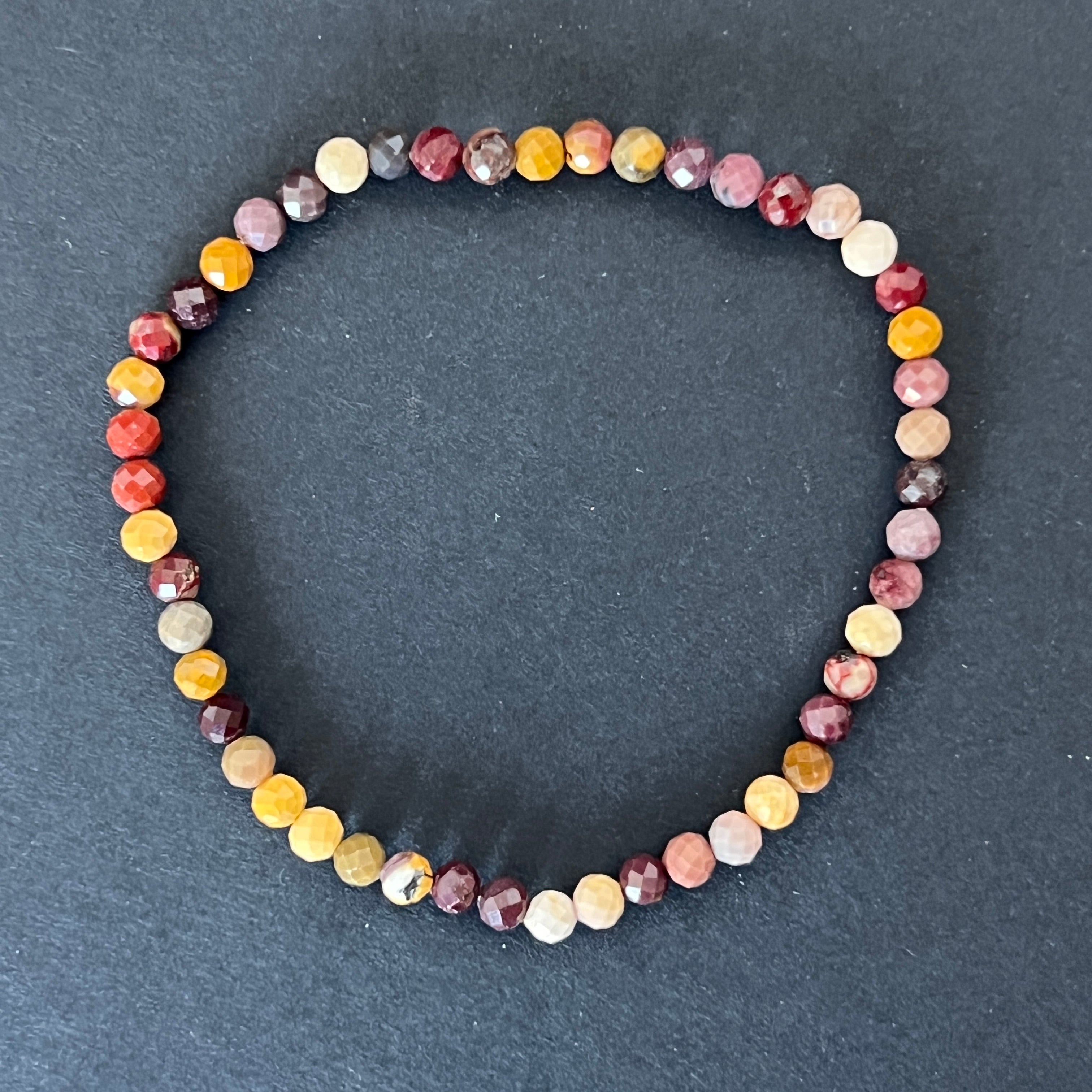 Тази фасетирана гривна от мукаит, съставена от мъниста с размер 4 мм, е деликатно бижу, но пълно с цвят и жизненост. Фасетните отражения подчертават естествената красота на мукаита, австралийски камък, известен с разнообразната си палитра от земни и слънчеви нюанси.