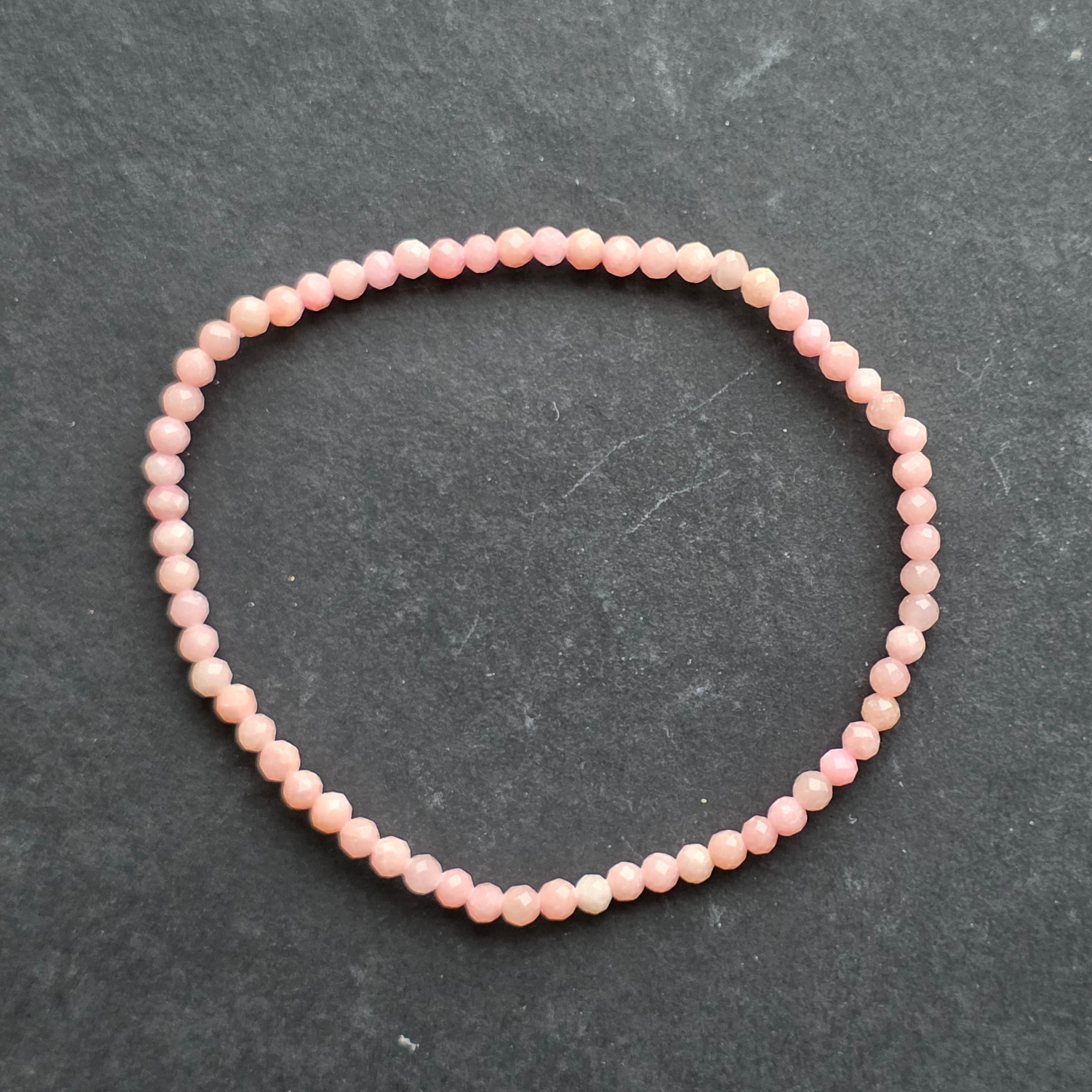 Нежна гривна като обещание за светлина. Мънистата фасетиран естествен розов опал, с диаметър от 3 мм, блестят в прозрачни нюанси на бледо розово, кремаво и топло бежово, образувайки фина игра на цветове, които излъчват женственост и хармония. Това е фин скъпоценен камък със спокойна и защитна енергия, предназначен да внесе мир в сърцето и увереност в пътя.