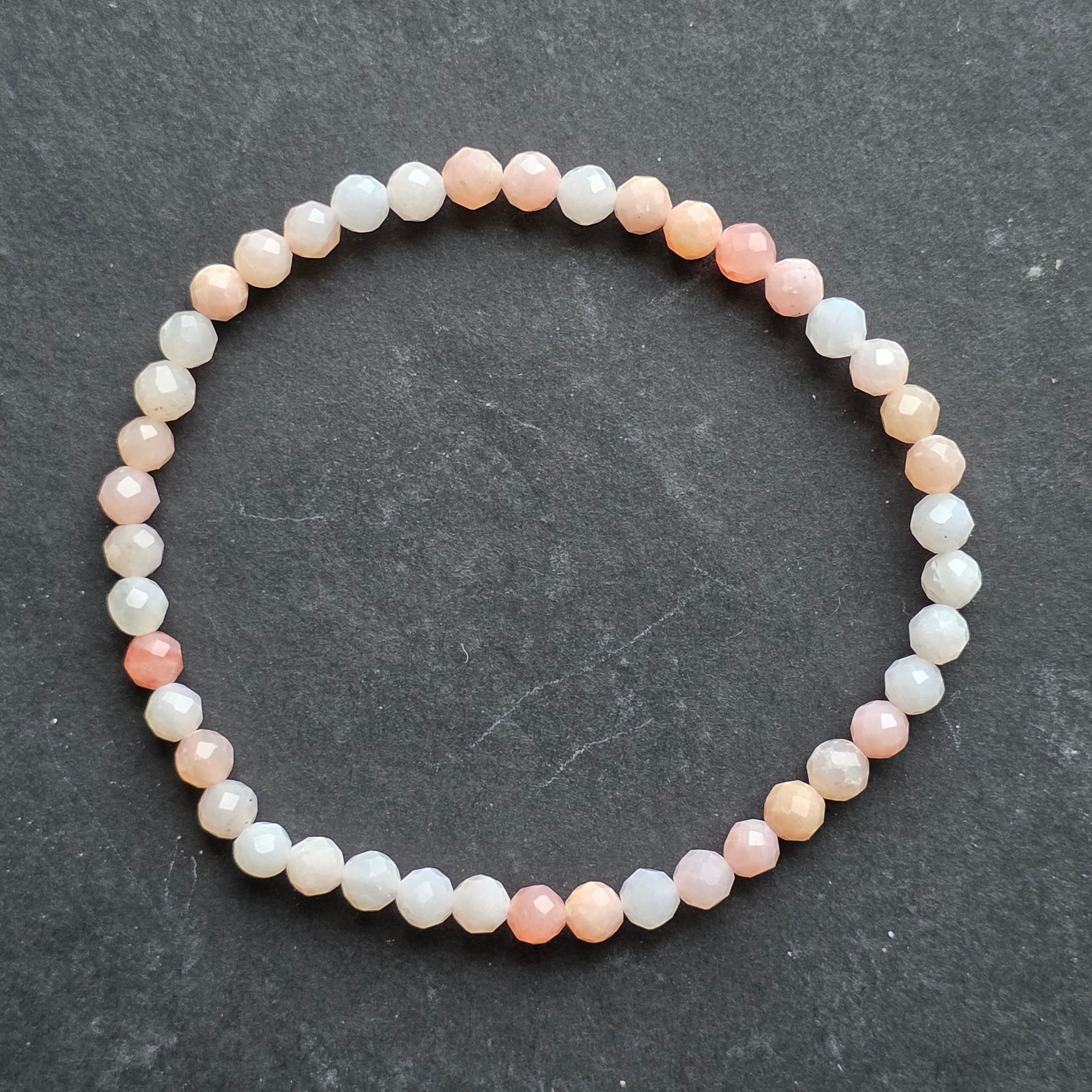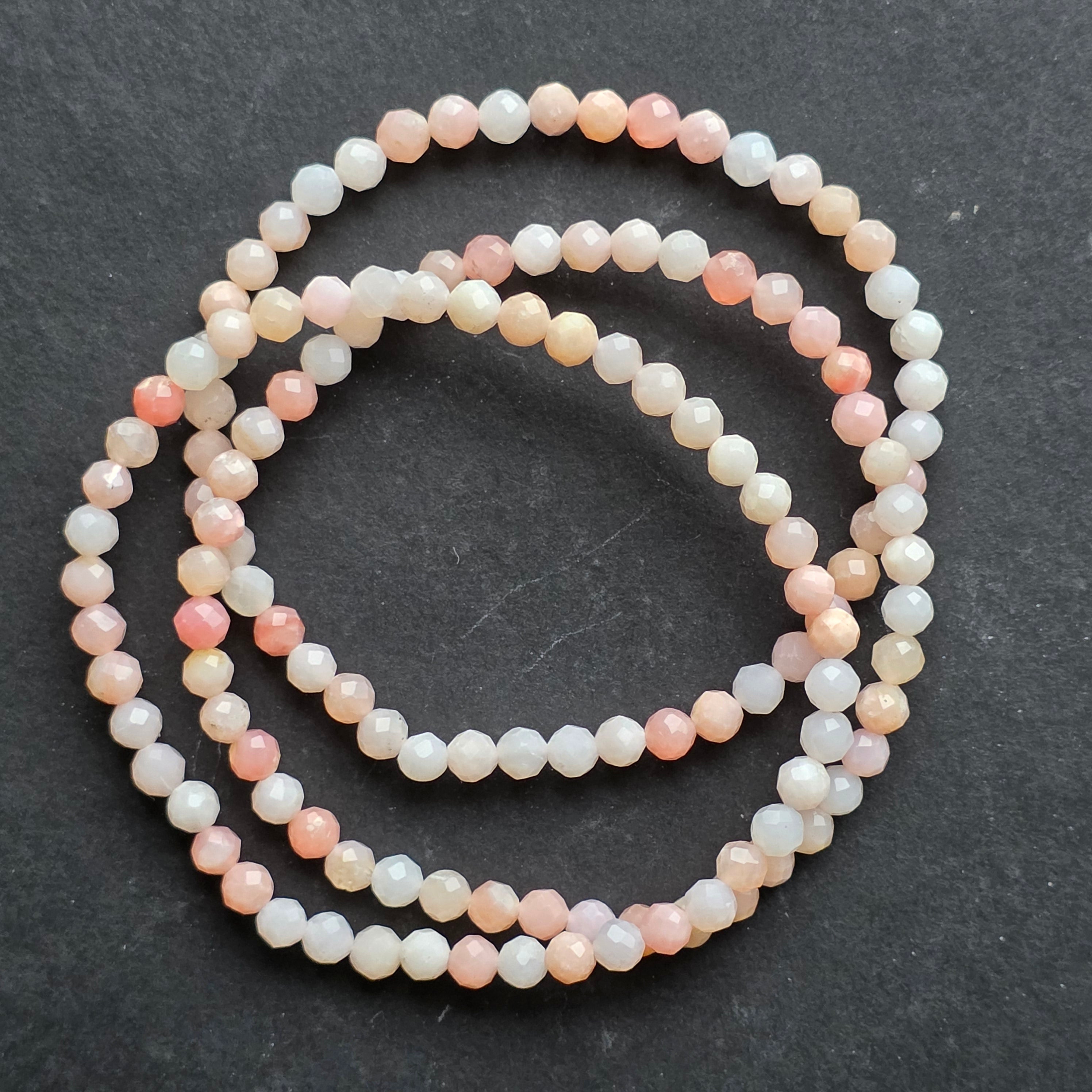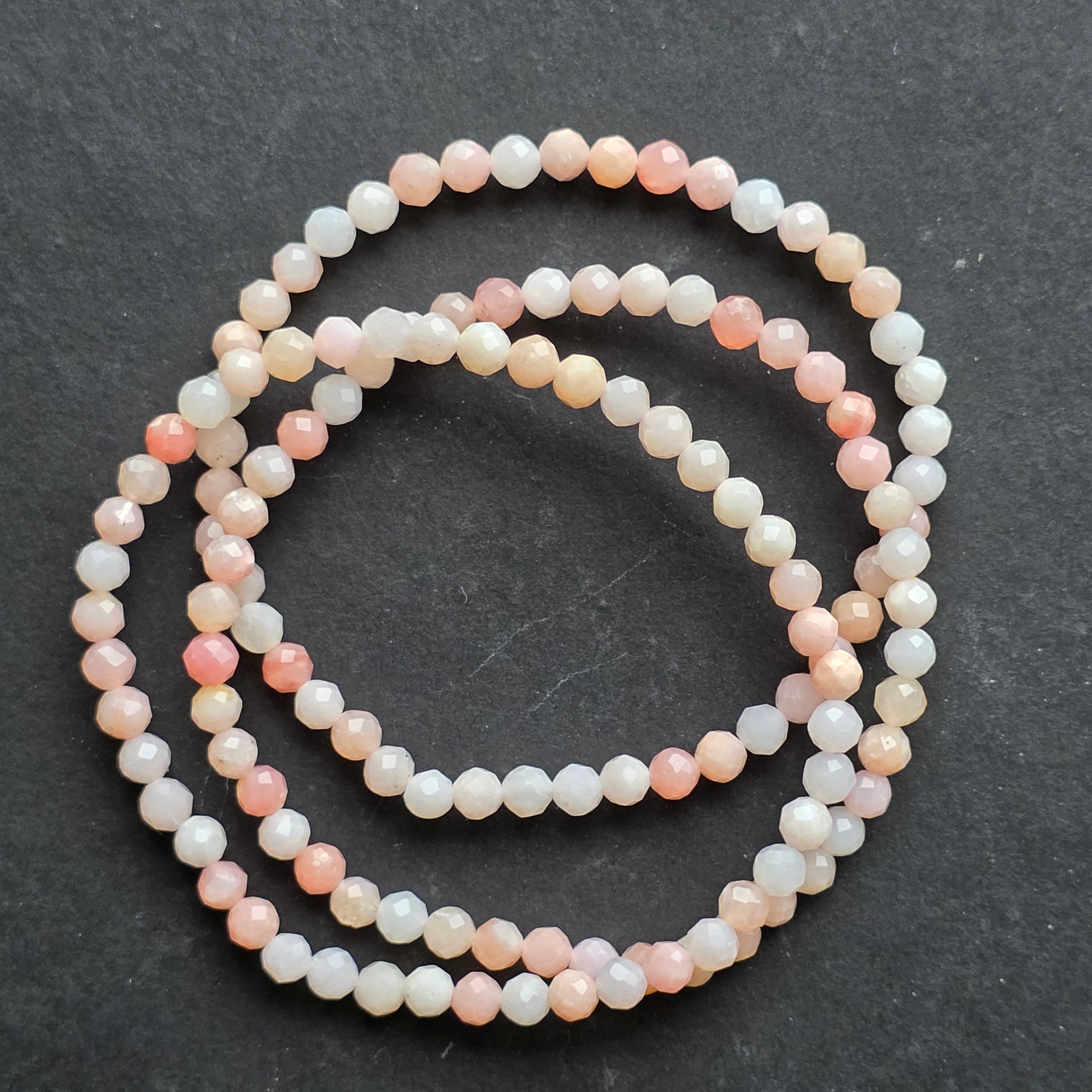 Нежна гривна като обещание за светлина. Мънистата фасетиран естествен розов опал, с диаметър 4 мм, блестят в прозрачни нюанси на бледо розово, кремаво и топло бежово, образувайки фина игра на цветове, които излъчват женственост и хармония. Това е фино бижу с спокойна и защитна енергия, предназначено да донесе спокойствие и увереност по вашия собствен път.