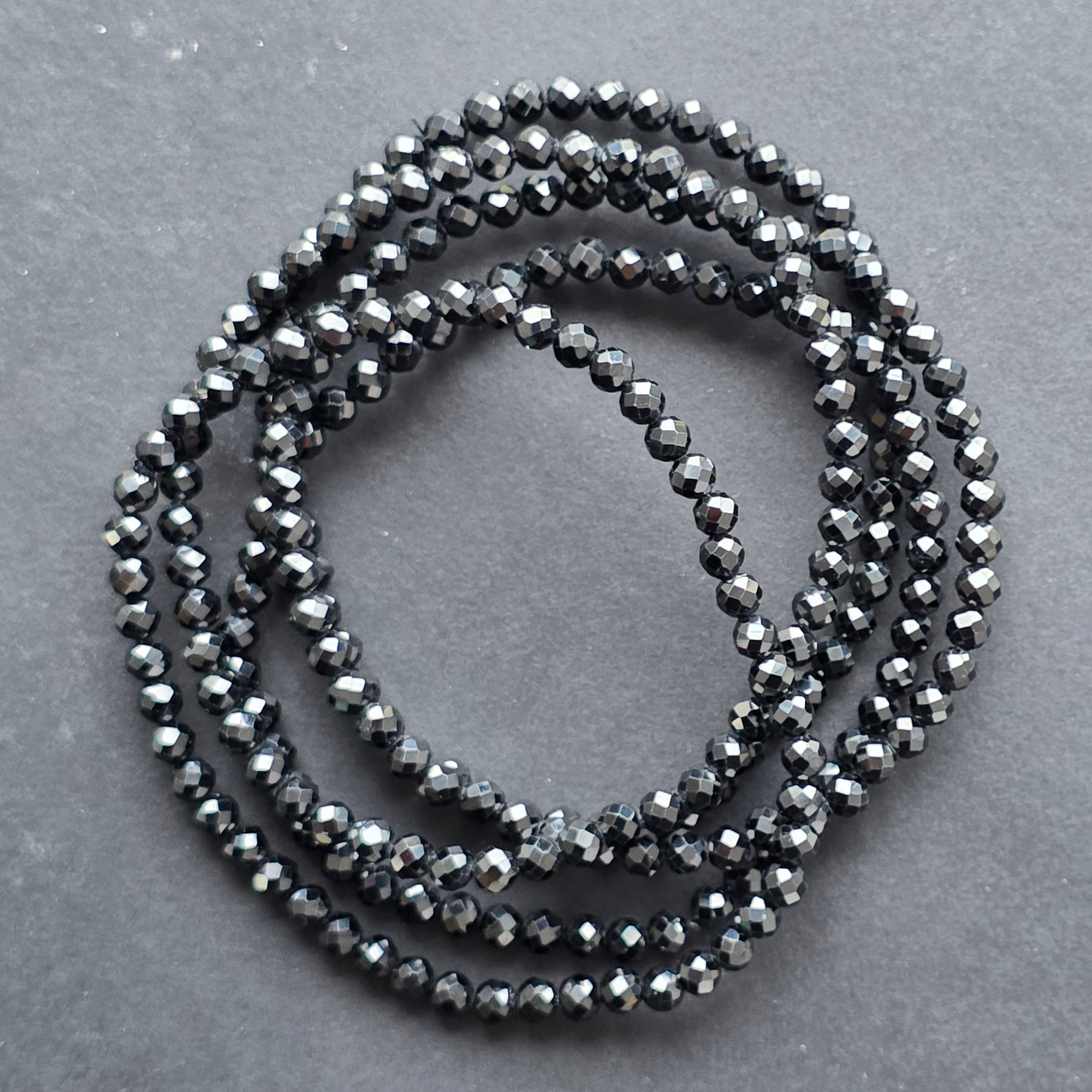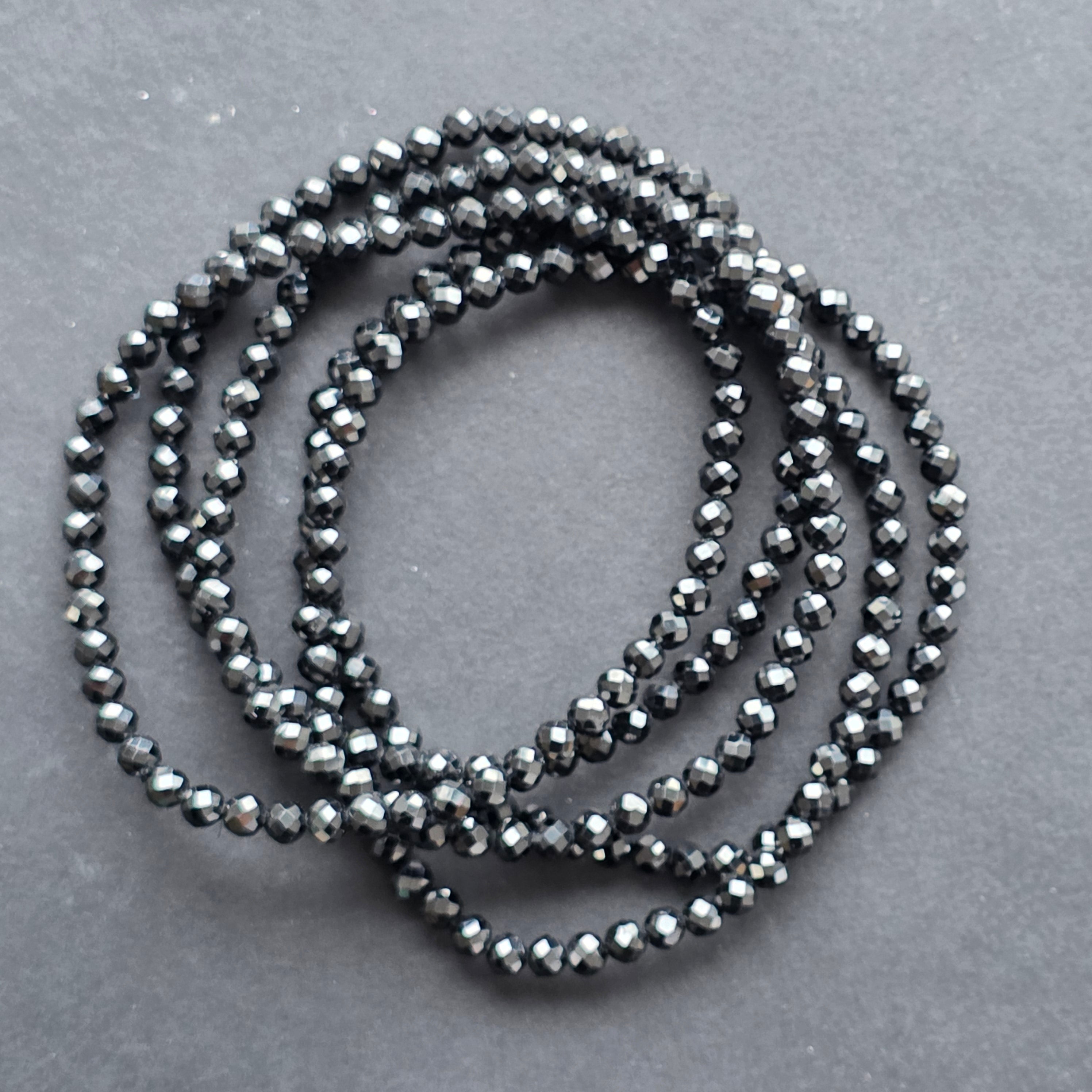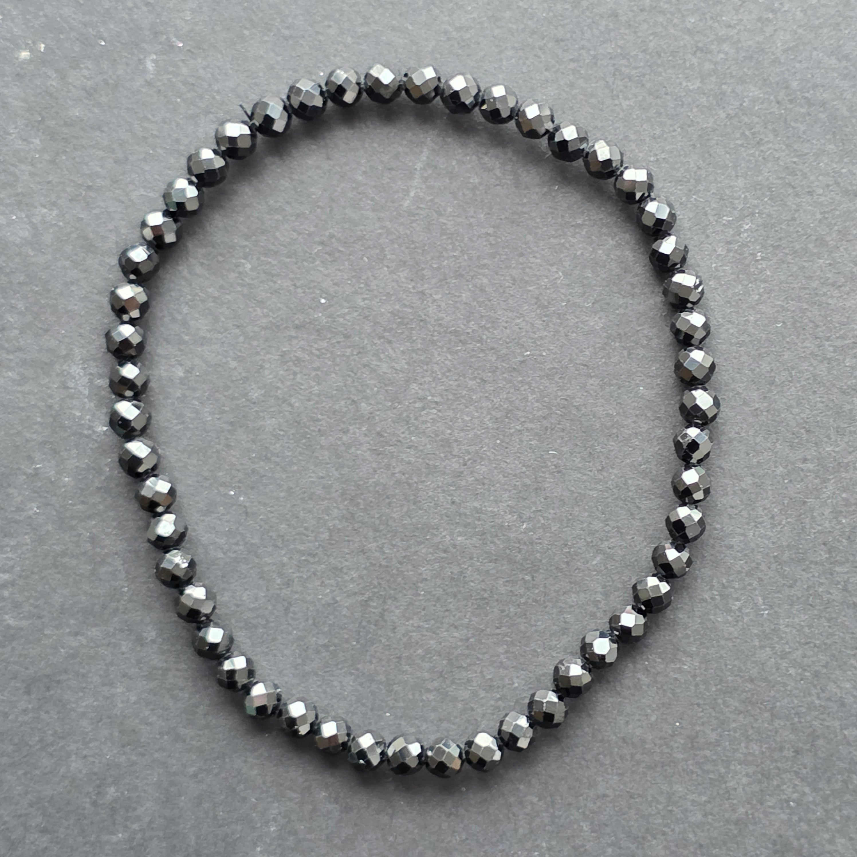 Фино бижу, но с мощно присъствие – тази гривна от натурален спинел, с мъниста фасетирани 4 мм, разкрива дълбок, мистериозен блясък, подобен на нощно небе, върху което се отразява светлината на звездите. Всяка фасета улавя светлината по различен начин, създавайки фин игра на сенки и сребристи отблясъци.