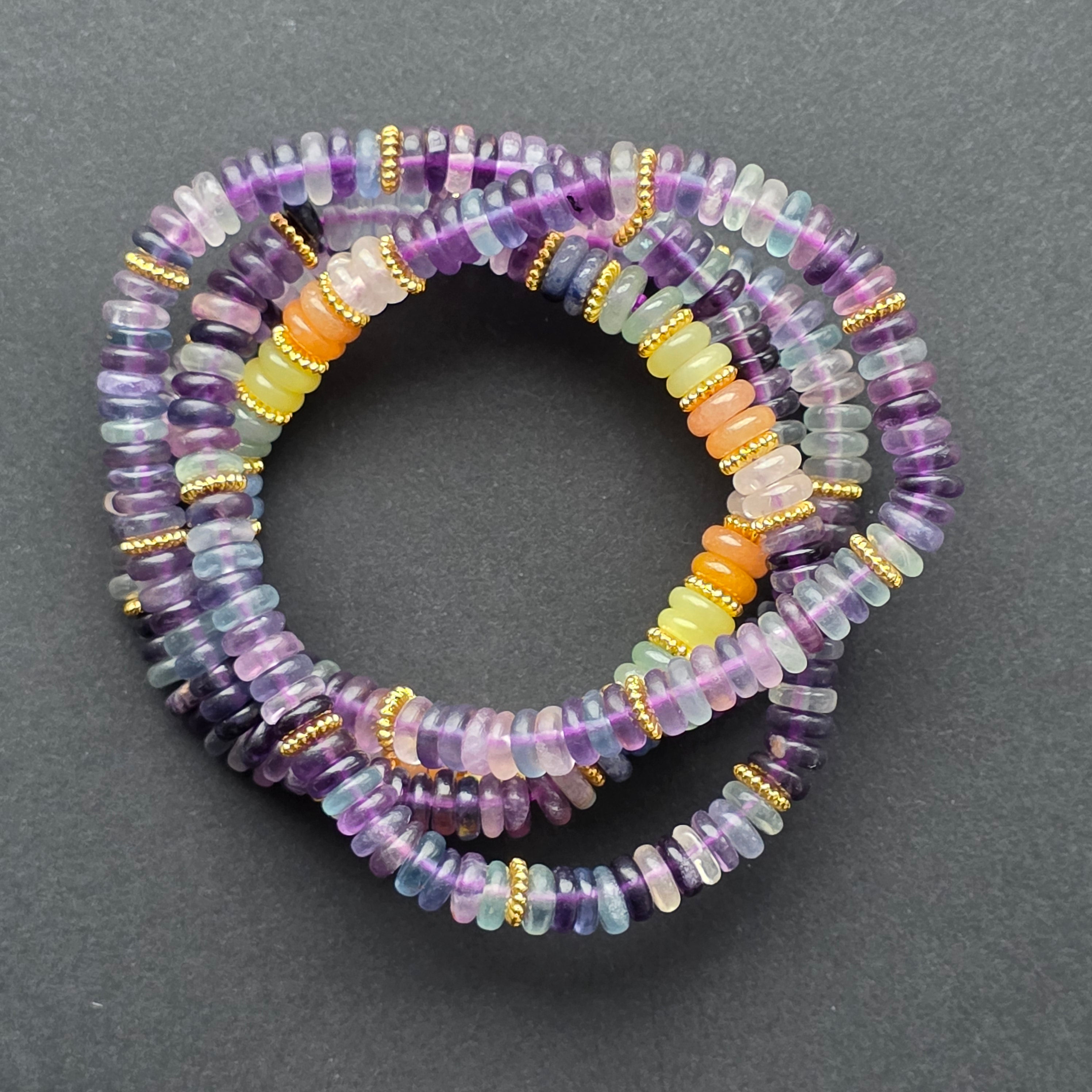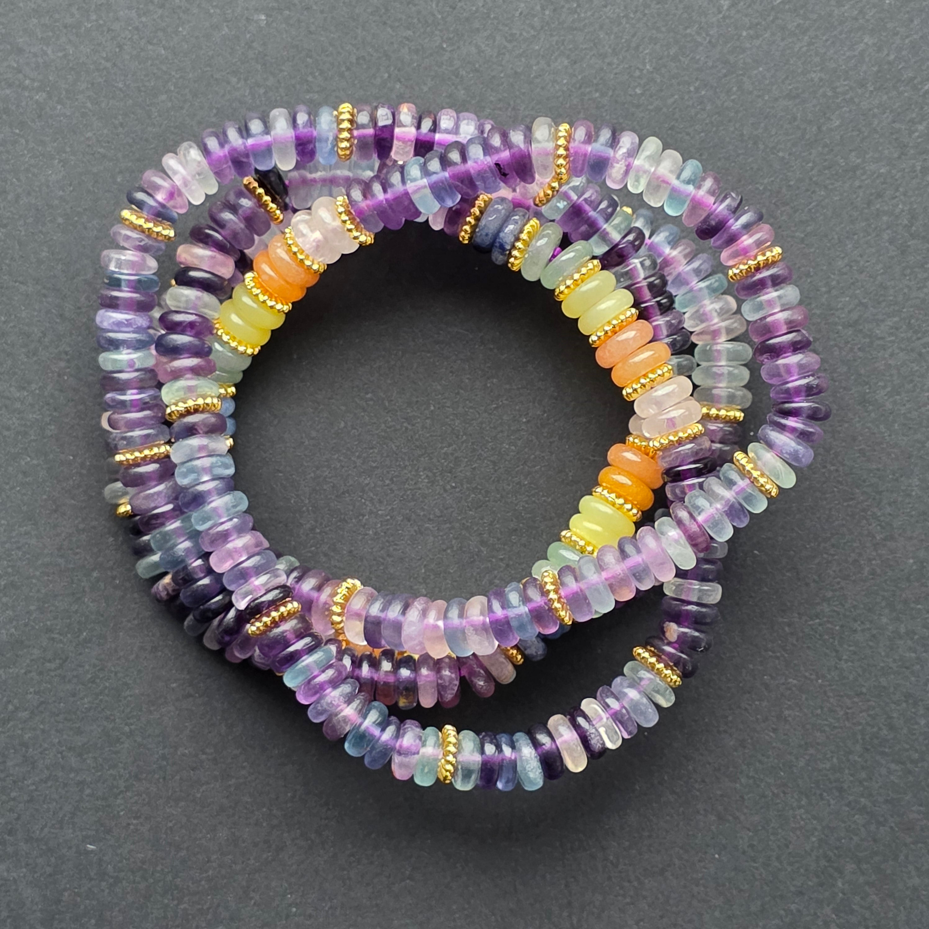 Гривната, изработена от лилав флуорит се отличава със своята леко мистериозна прозрачност, с нюанси, колебаещи се между люляк, дълбок лилав и студени тонове на аметист. Тънките дискове формират елегантна, финна структура, която носи спокойна и балансирана естетика на китката.