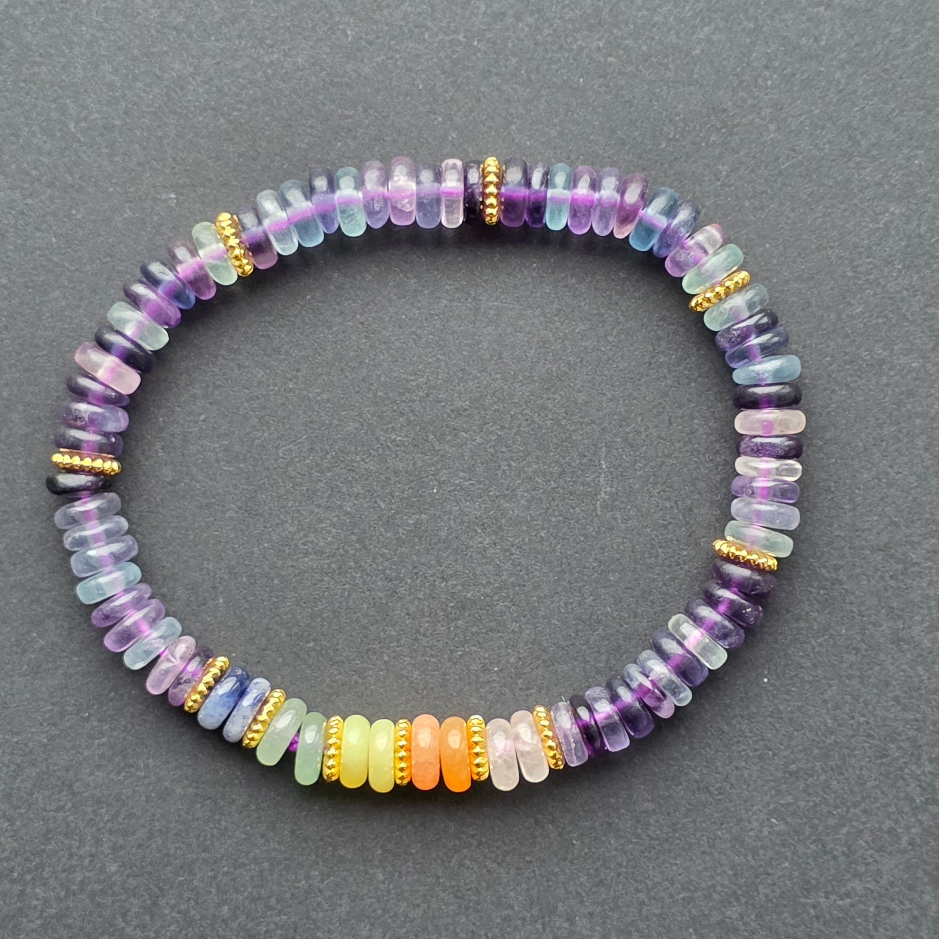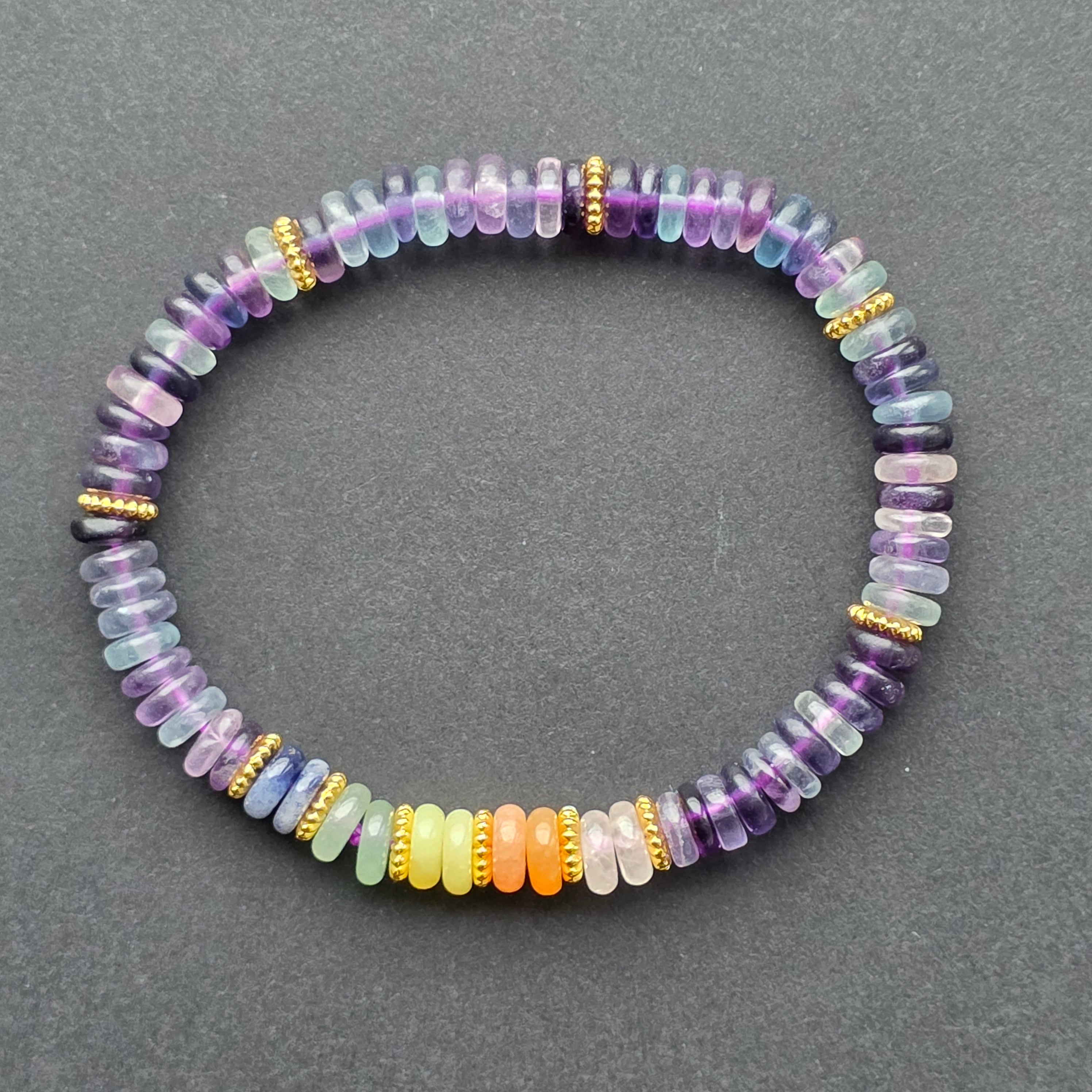 В централната зона се намира сегмент, посветен на 7-те чакри, създаден от многоцветни камъни, добавящ ярък и символичен акцент. Този контраст между ефирния лилав на флуорита и топлите цветове на чакрите създава гривна, която излъчва хармония, изразителност и визуална чувствителност.