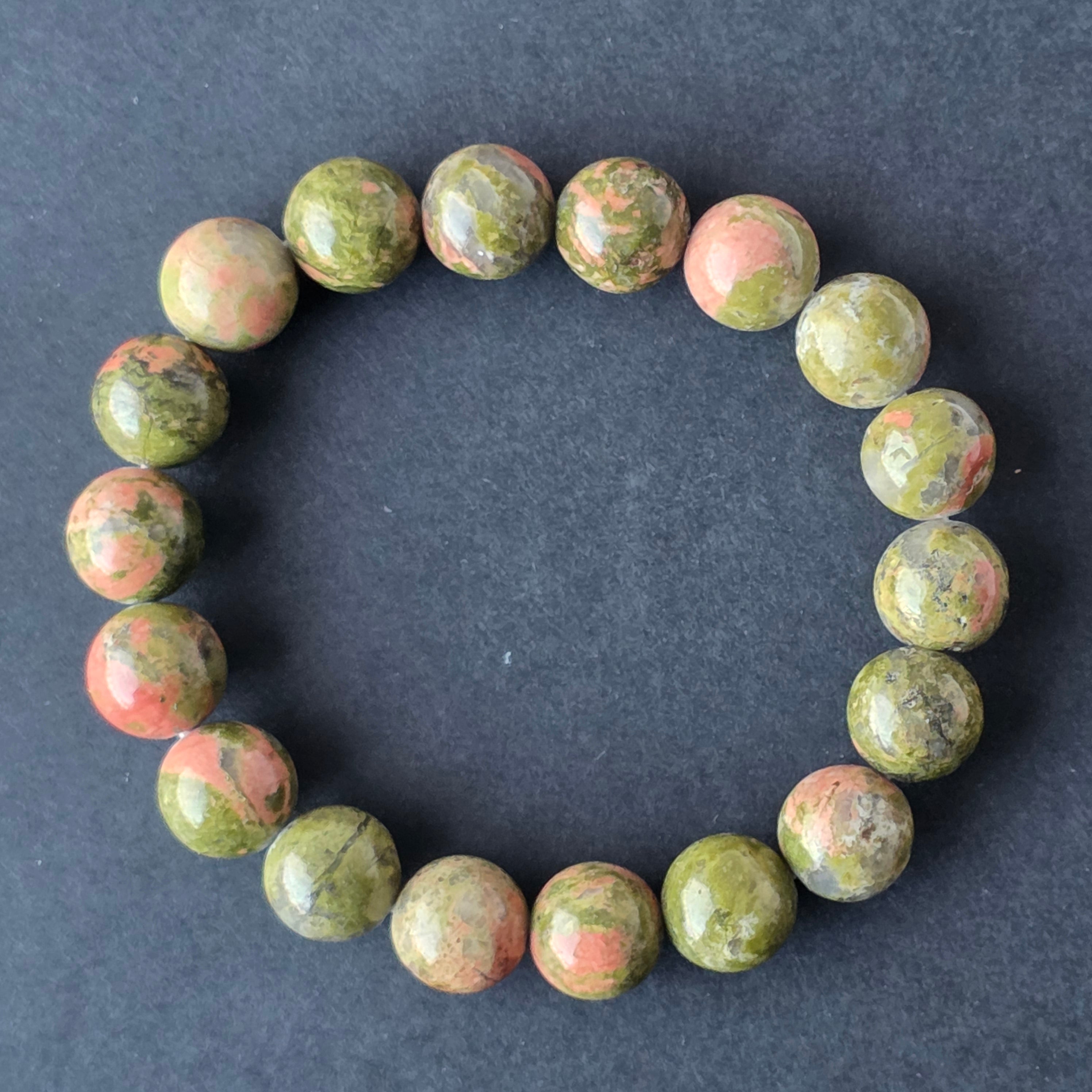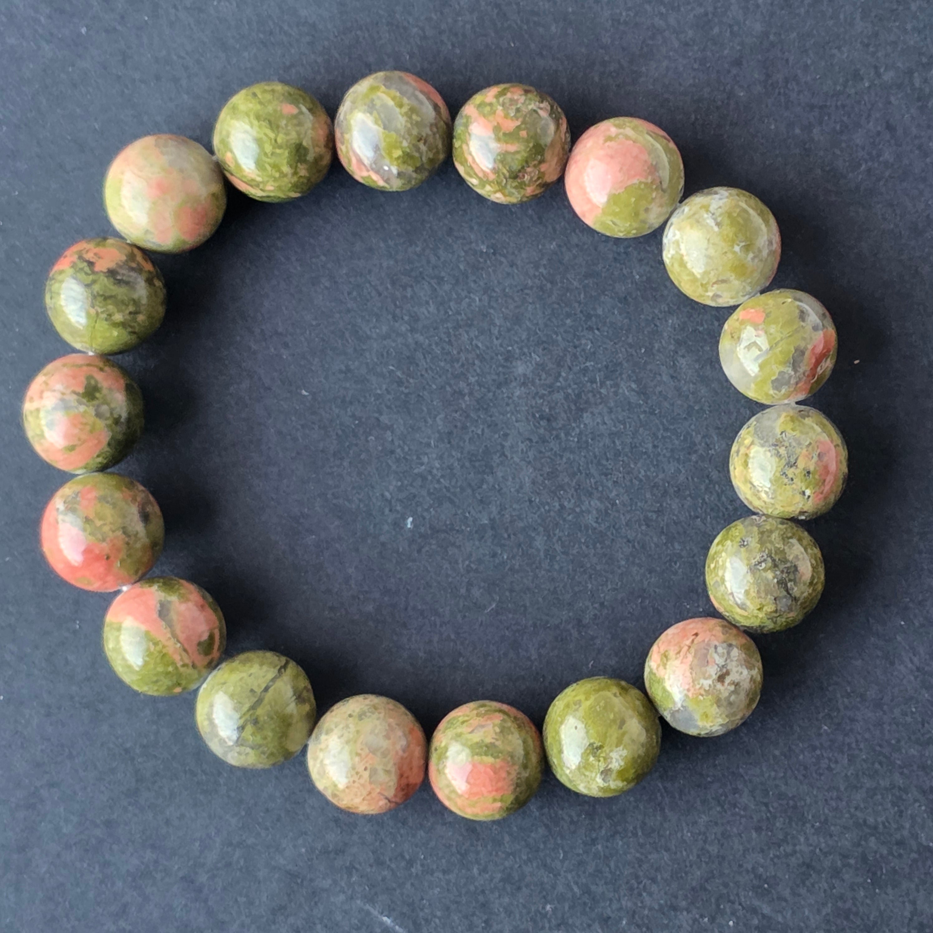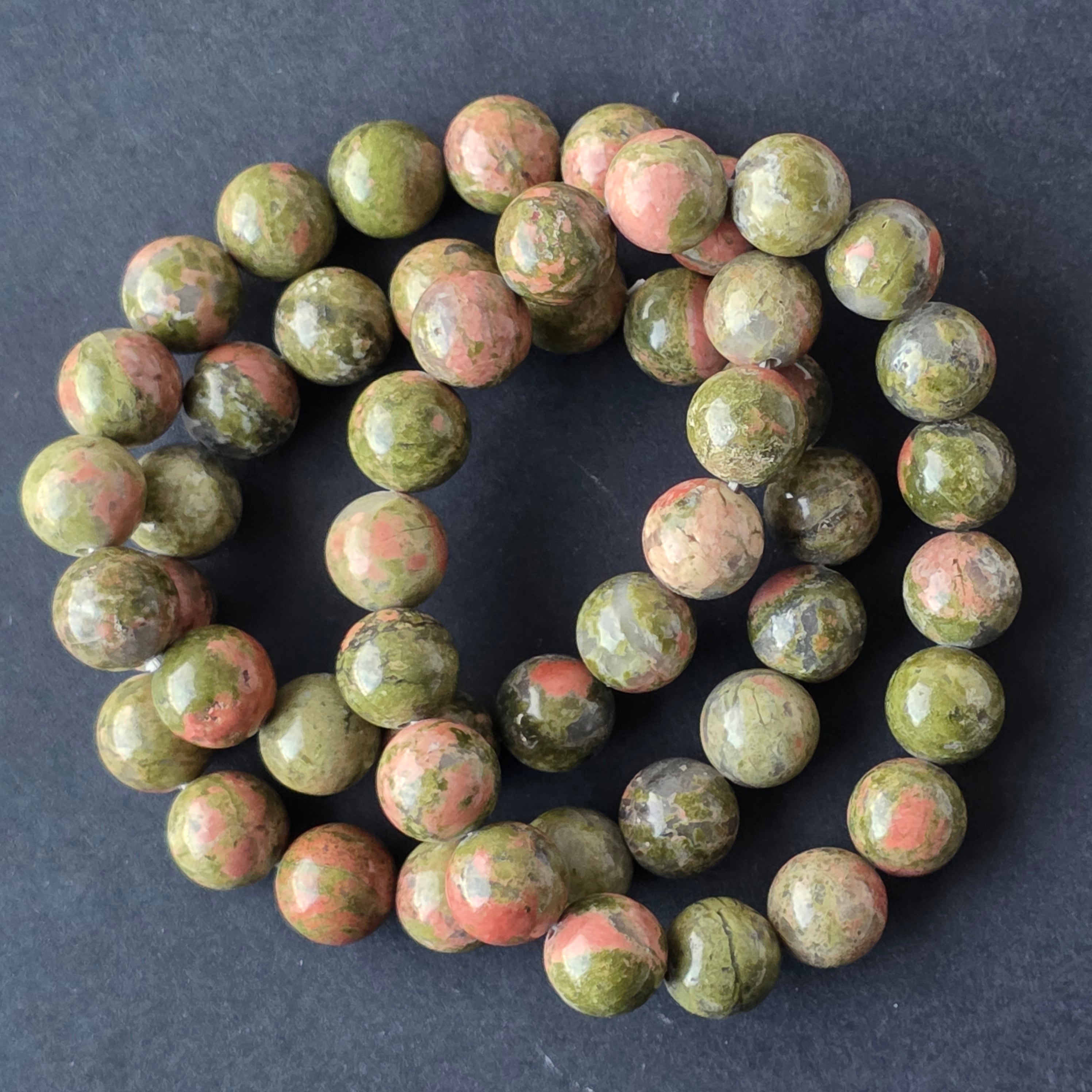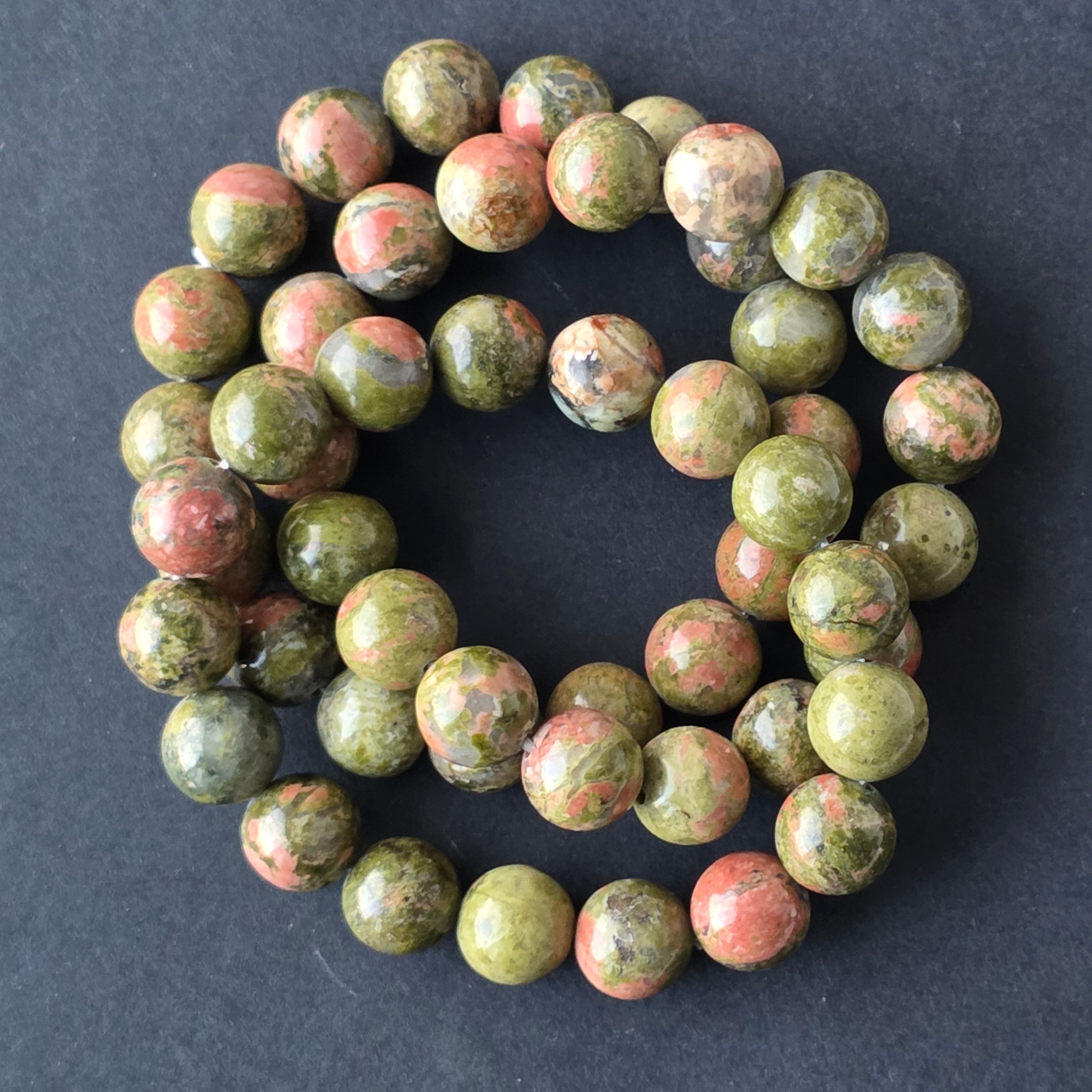• Камък: натурален унакит – сферични мъниста 10–11 мм