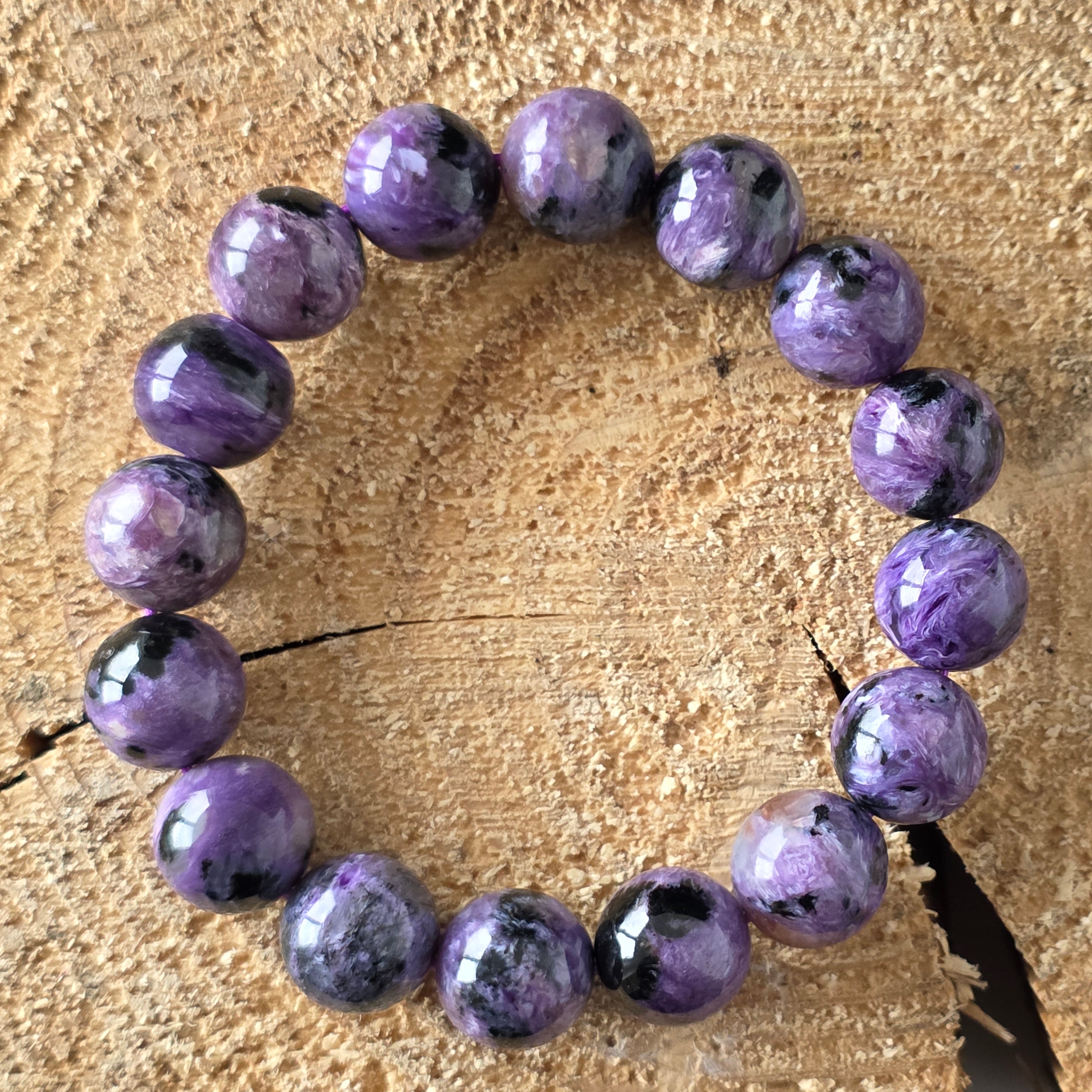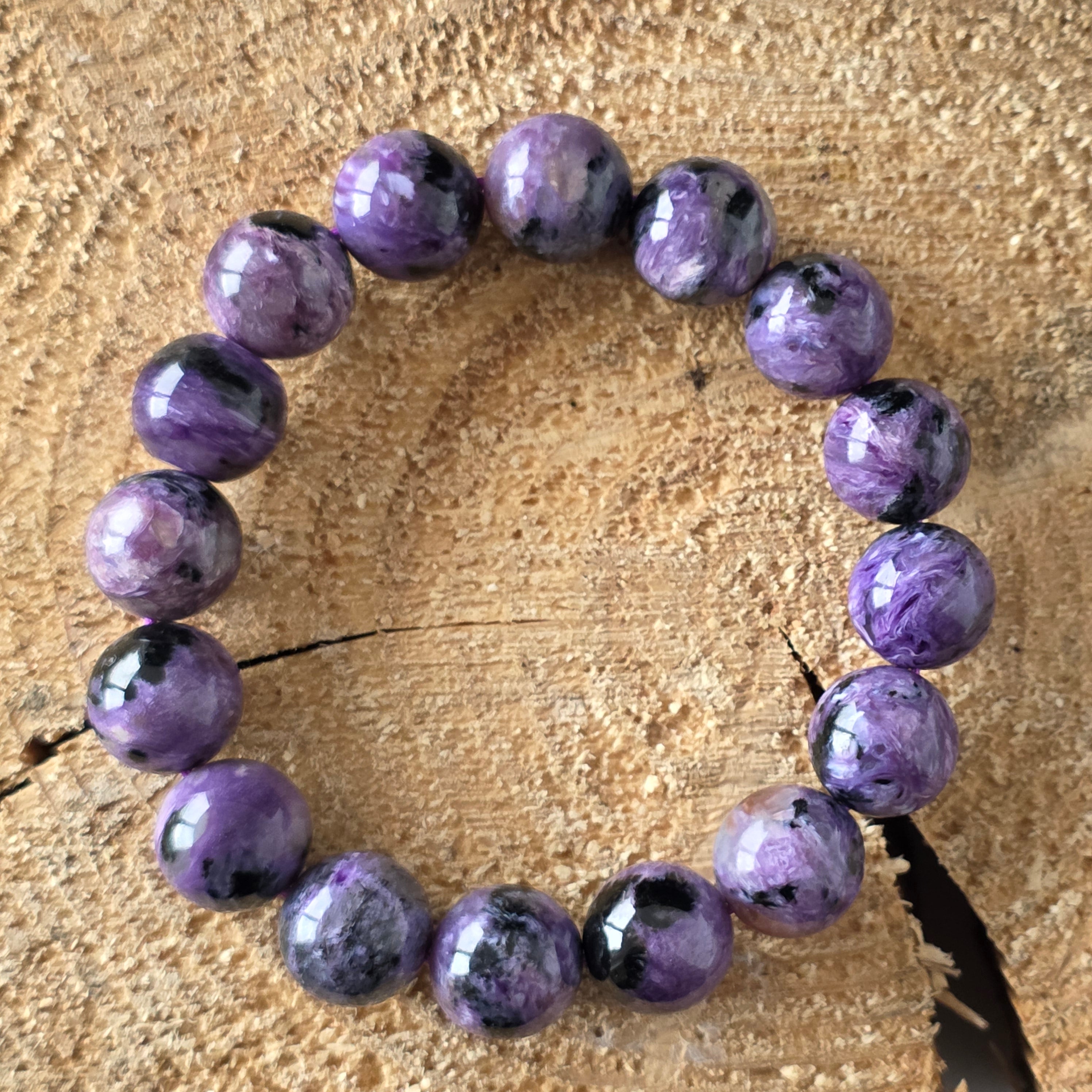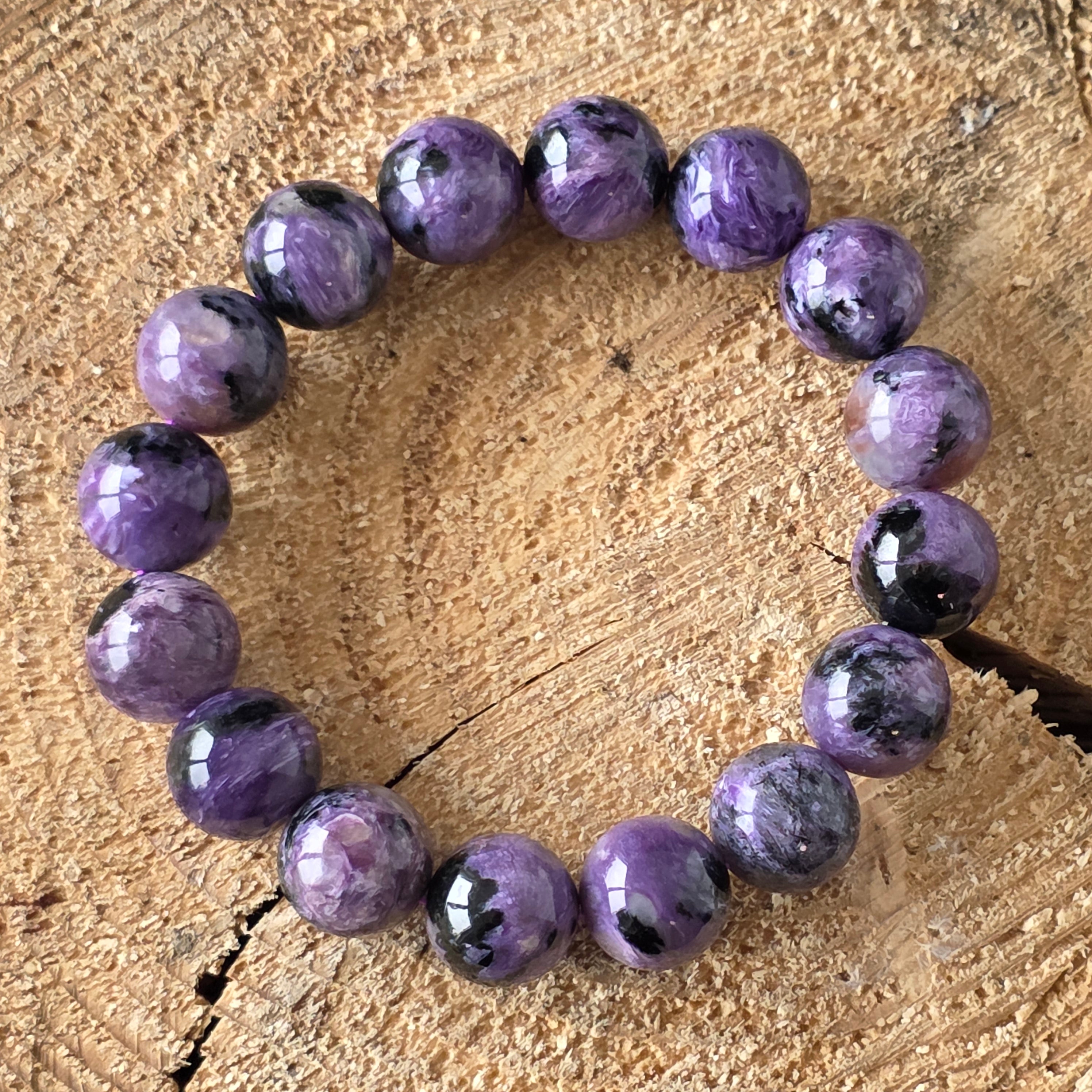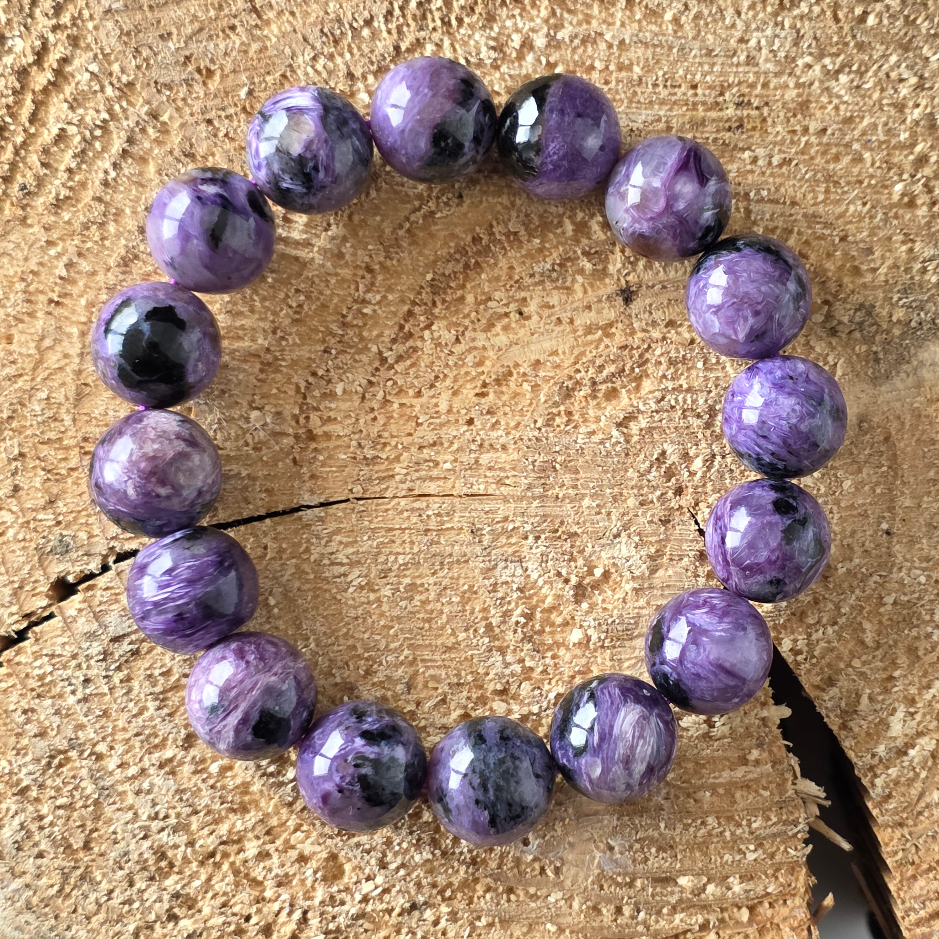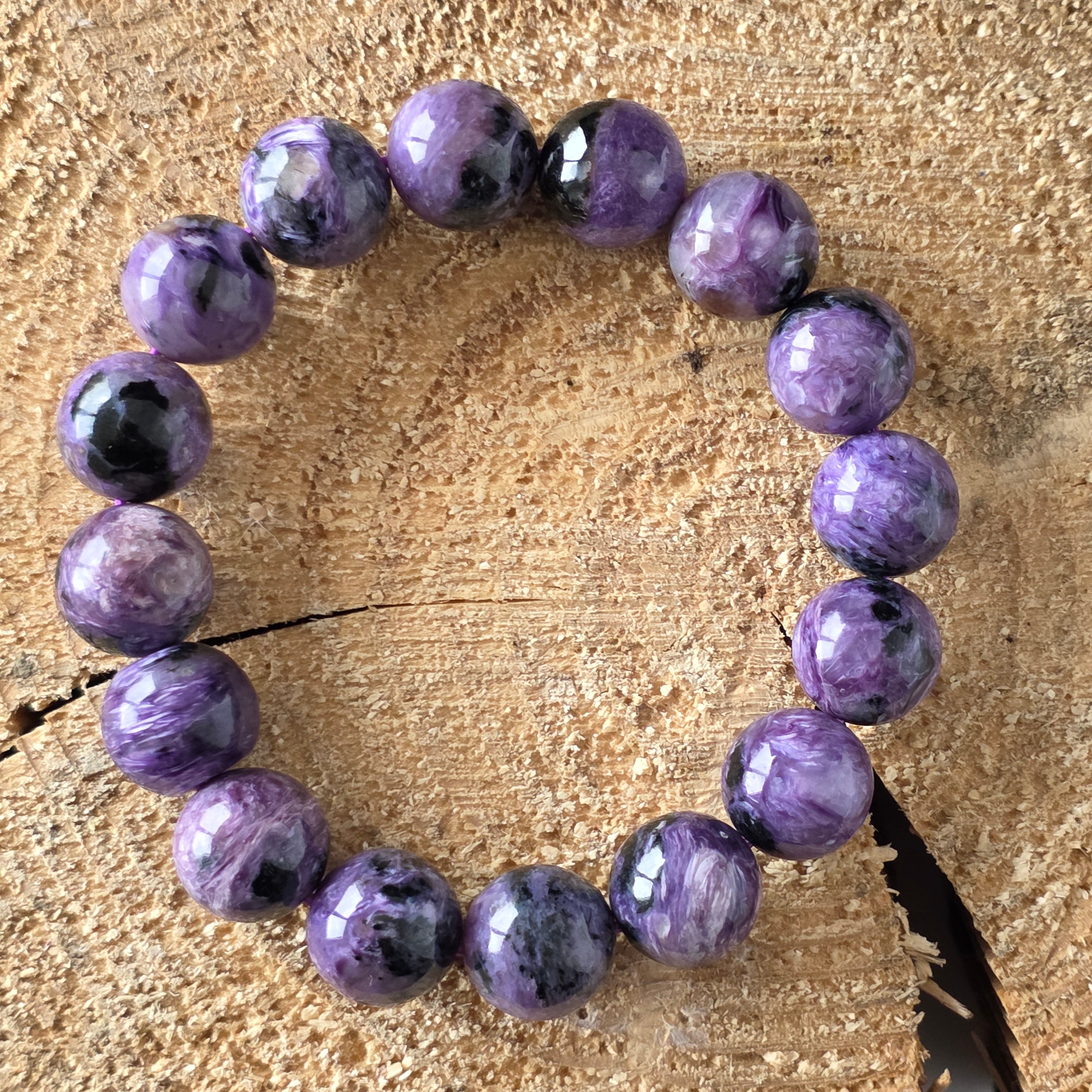 Ефектна гривна, носеща в себе си мистерията на северния здрач. Мънистата 12 мм кръгъл естествен чароит, ръчно шлифовани до копринен блясък, разкриват хипнотизиращи вихри от лилаво, лавандулово, перлено сиво и дълбоко черно. Всеки камък е свят сам по себе си, с течни текстури и иридесценция, които сякаш танцуват на светлината – истинско произведение на природата, уникално по свой начин.