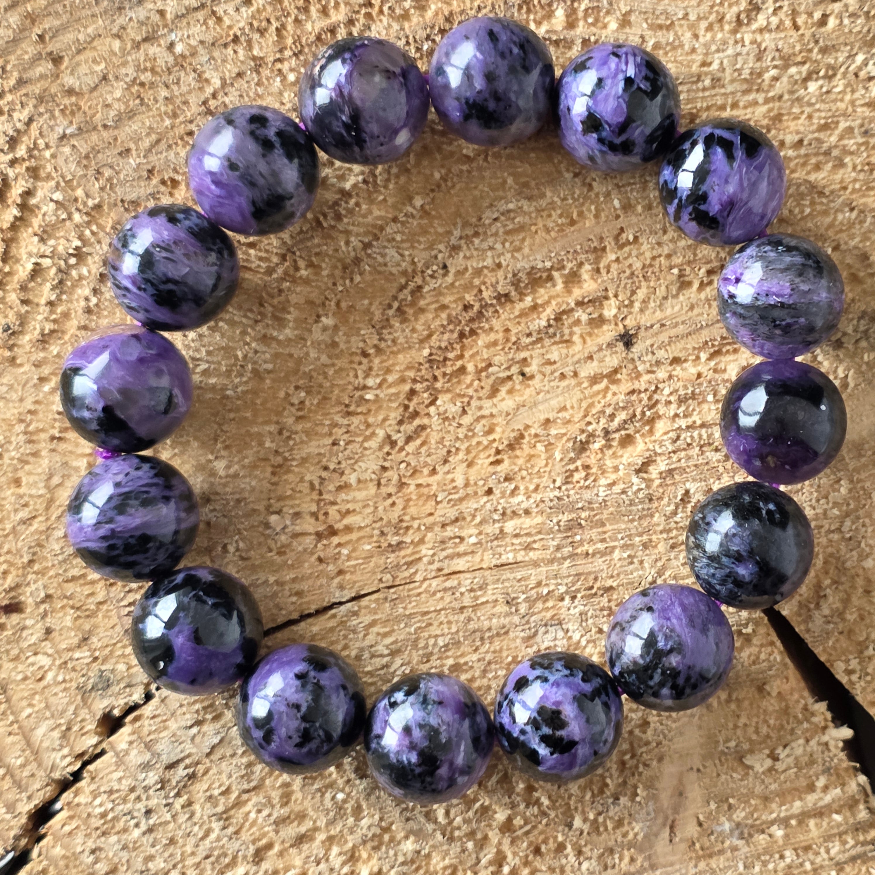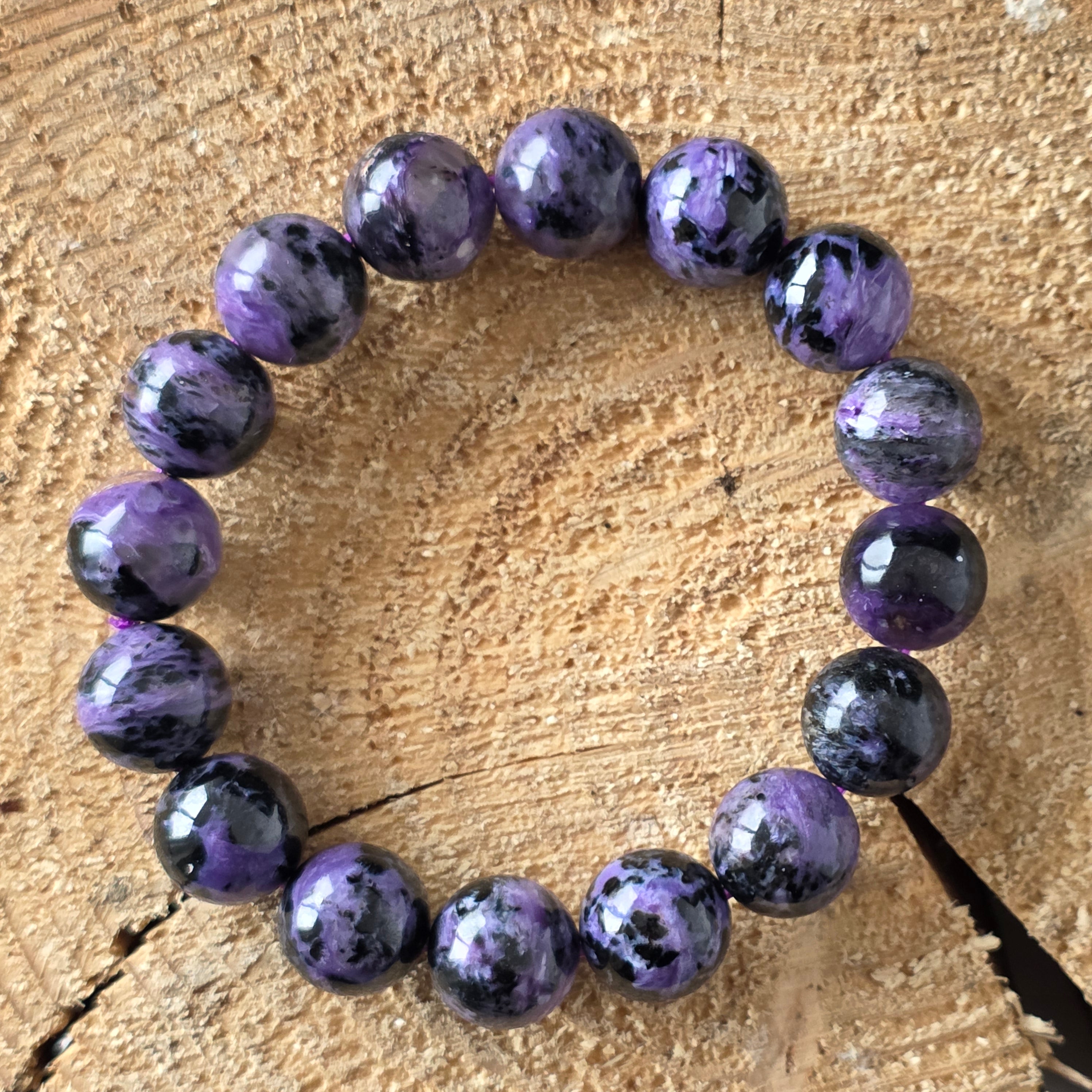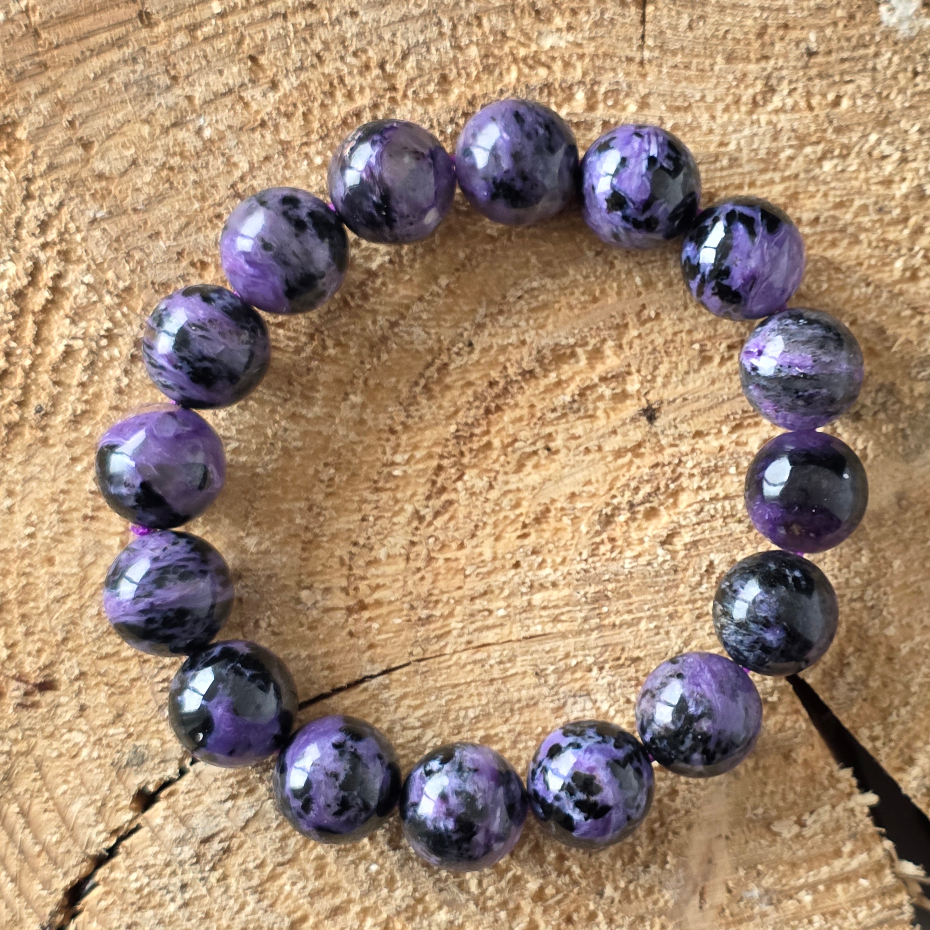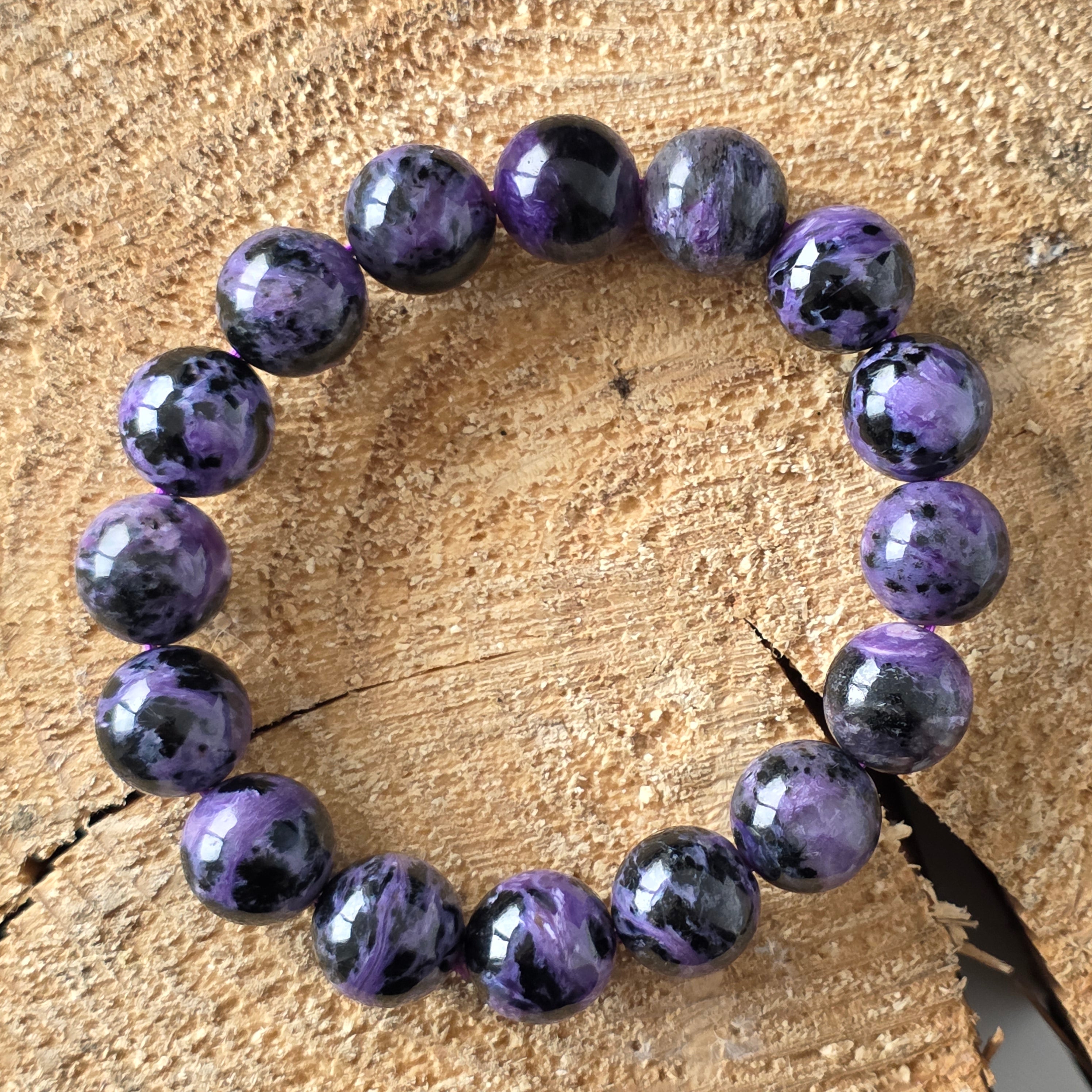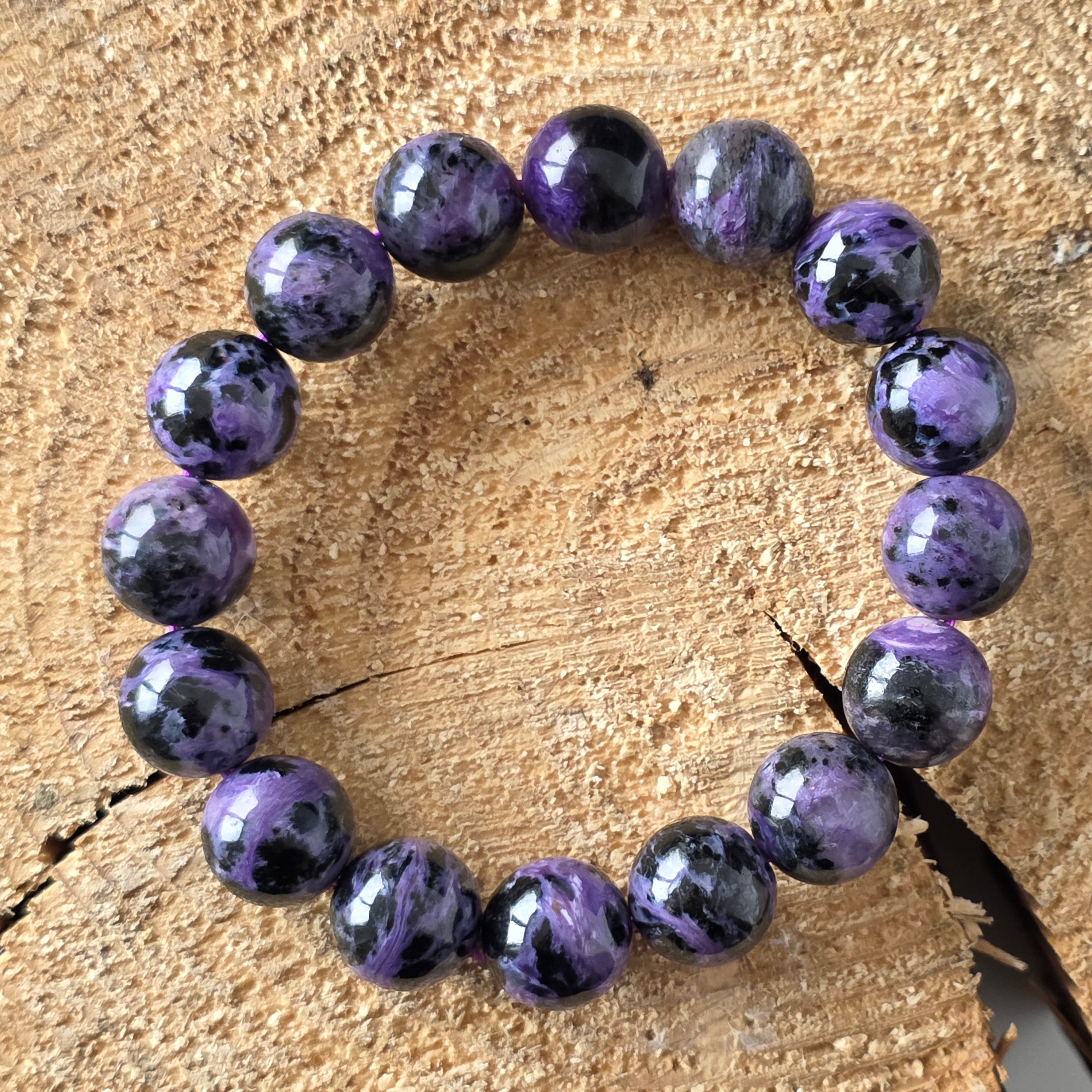 Ефектна гривна, носеща в себе си мистерията на северния здрач. Мънистата 12 мм кръгъл естествен чароит, ръчно полирани до копринен блясък, разкриват хипнотизиращи вихри от лилаво, лавандула, перлено сиво и наситено черно. Всеки камък е свят сам по себе си, с плавни текстури и преливания, които сякаш танцуват на светлината – истинско произведение на природата, единствено по рода си.