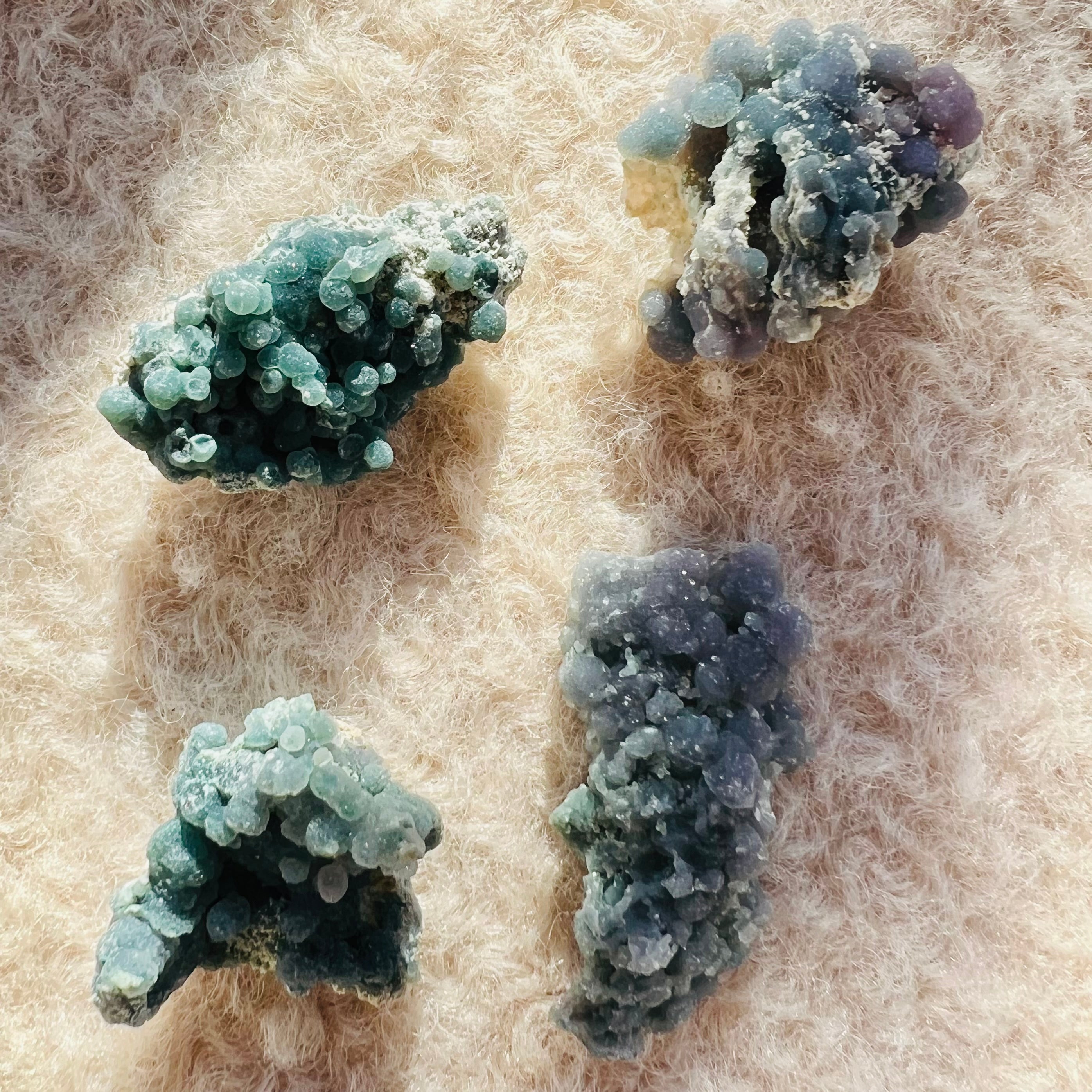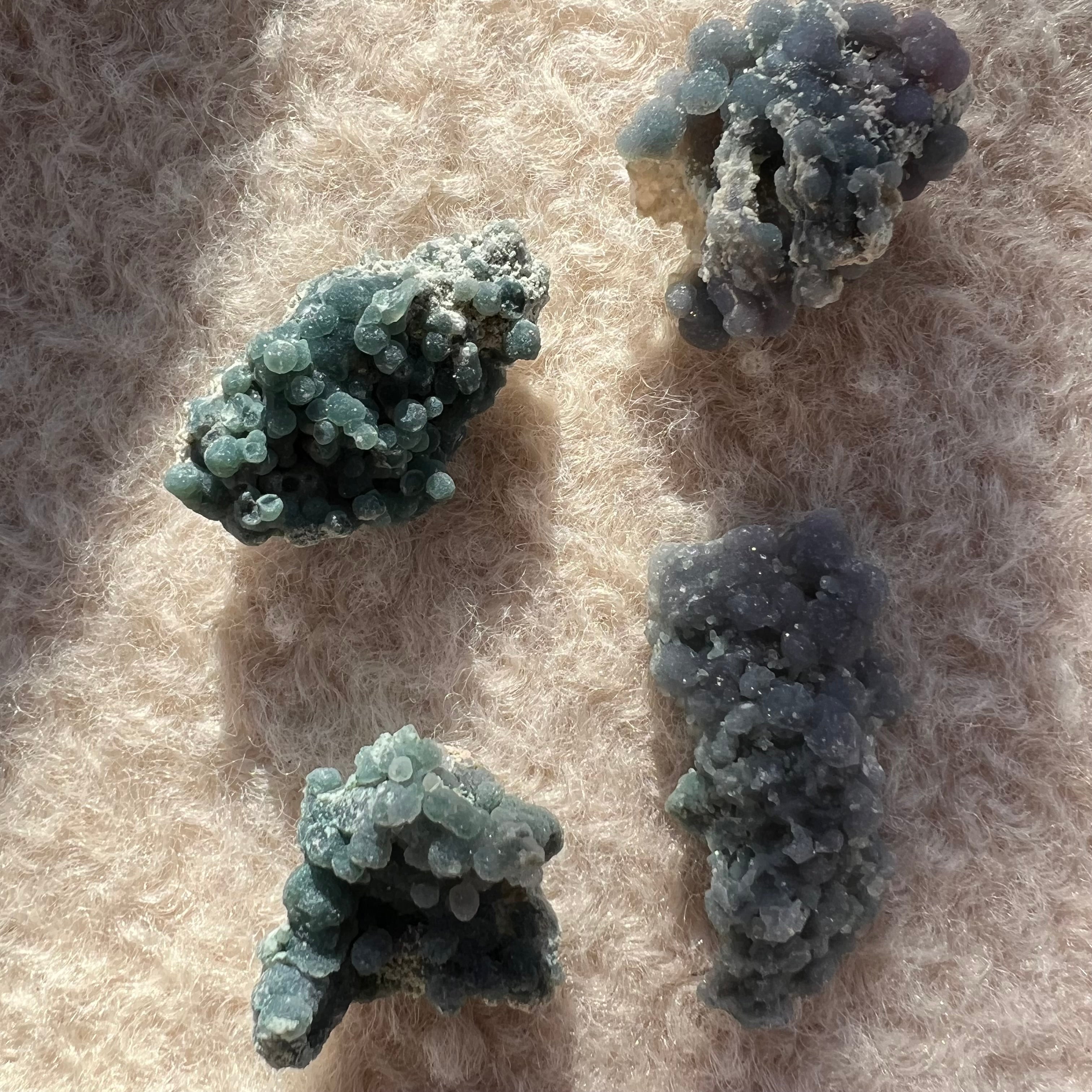 Гроздовият ахат се образува в кухините на вулканични скали, където силициево-богатите разтвори се охлаждат и кристализират, създавайки характерния гроздов модел.