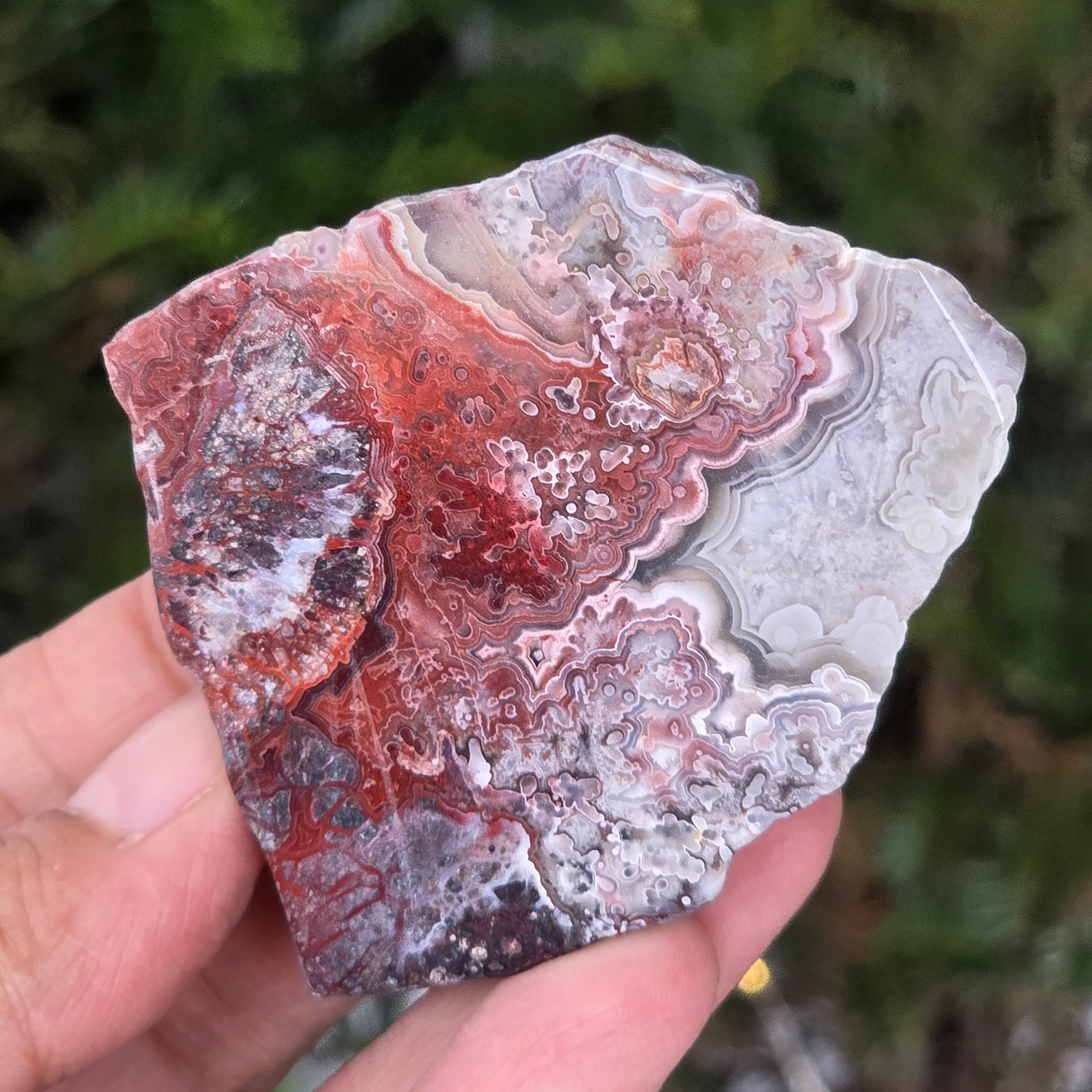 Мексиканският агат Crazy е един от най-живите и впечатляващи видове ахат, известен със своите вълнообразни линии и забавните цветови игри, които изглеждат като рисувани от свободна ръка без правила. В този естествен срез, малък но изключително изразителен, се разкрива цялата история на камъка: земни пластове, топли нюанси на карамел, яркочервено, оранжево, сиво и кремаво, смесени в спираловидни модели, които сякаш пулсират с живот.