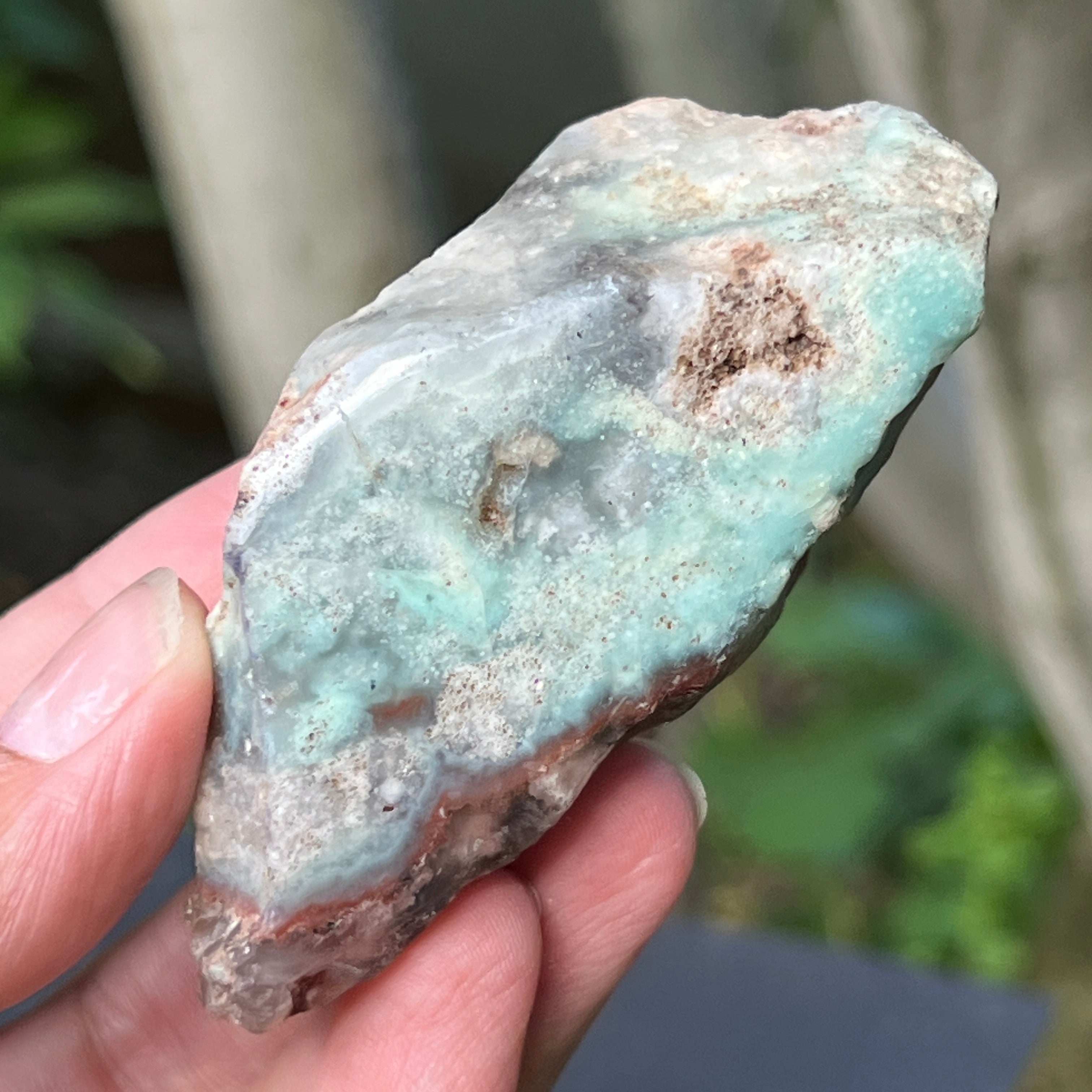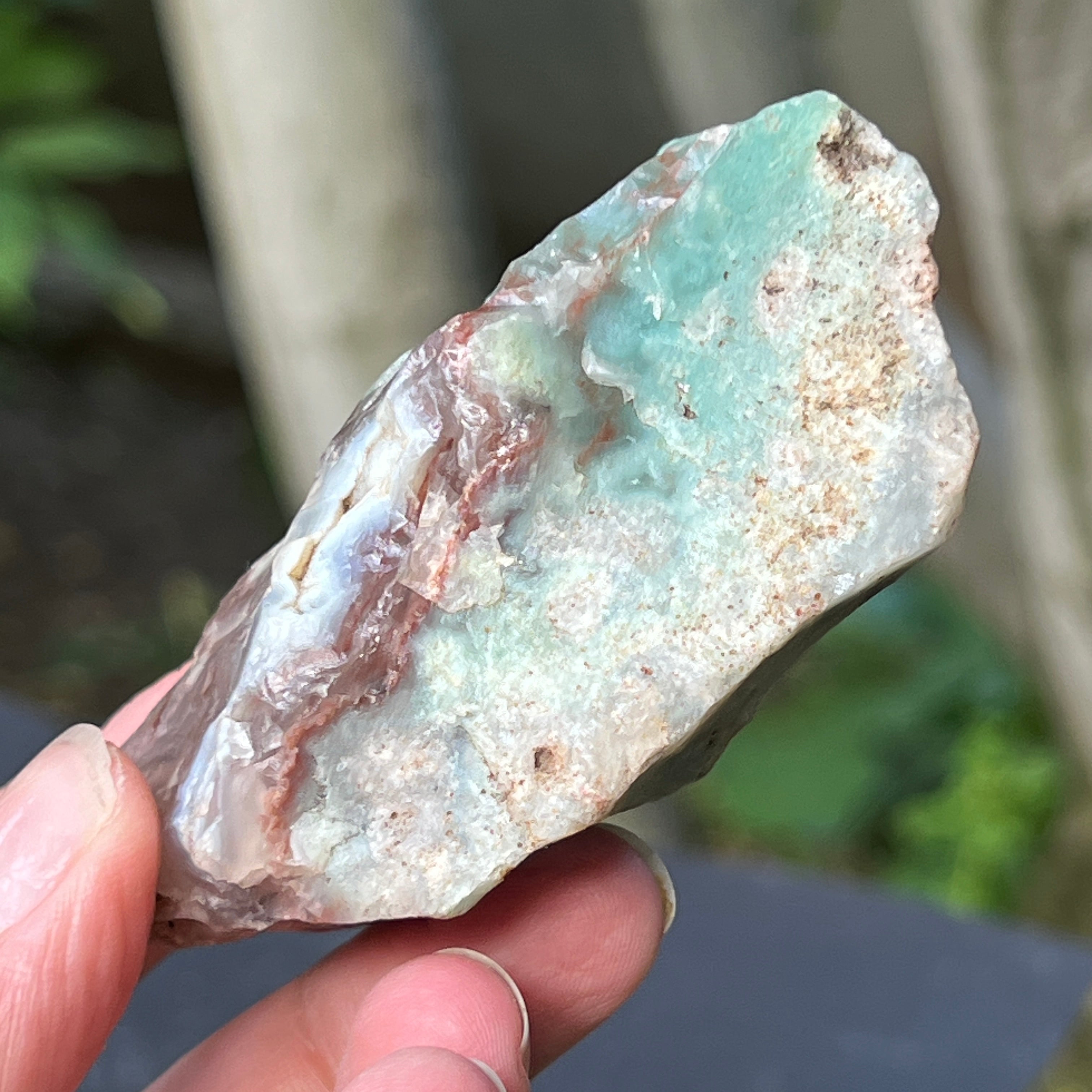 Това е естествена, непокътната форма на хромен халцедон – труден за намиране минерал, изкопаван единствено в Зимбабве и ценен заради яркия си цвят, който не идва от никел (като при хризопраз), а от хрома, който пулсира дълбоко в кристалната му структура. В тази особеност, сините и зелените включвания създават завладяваща цветова игра, с плавни преходи между прозрачно и непрозрачно, между плътно и ефирно.