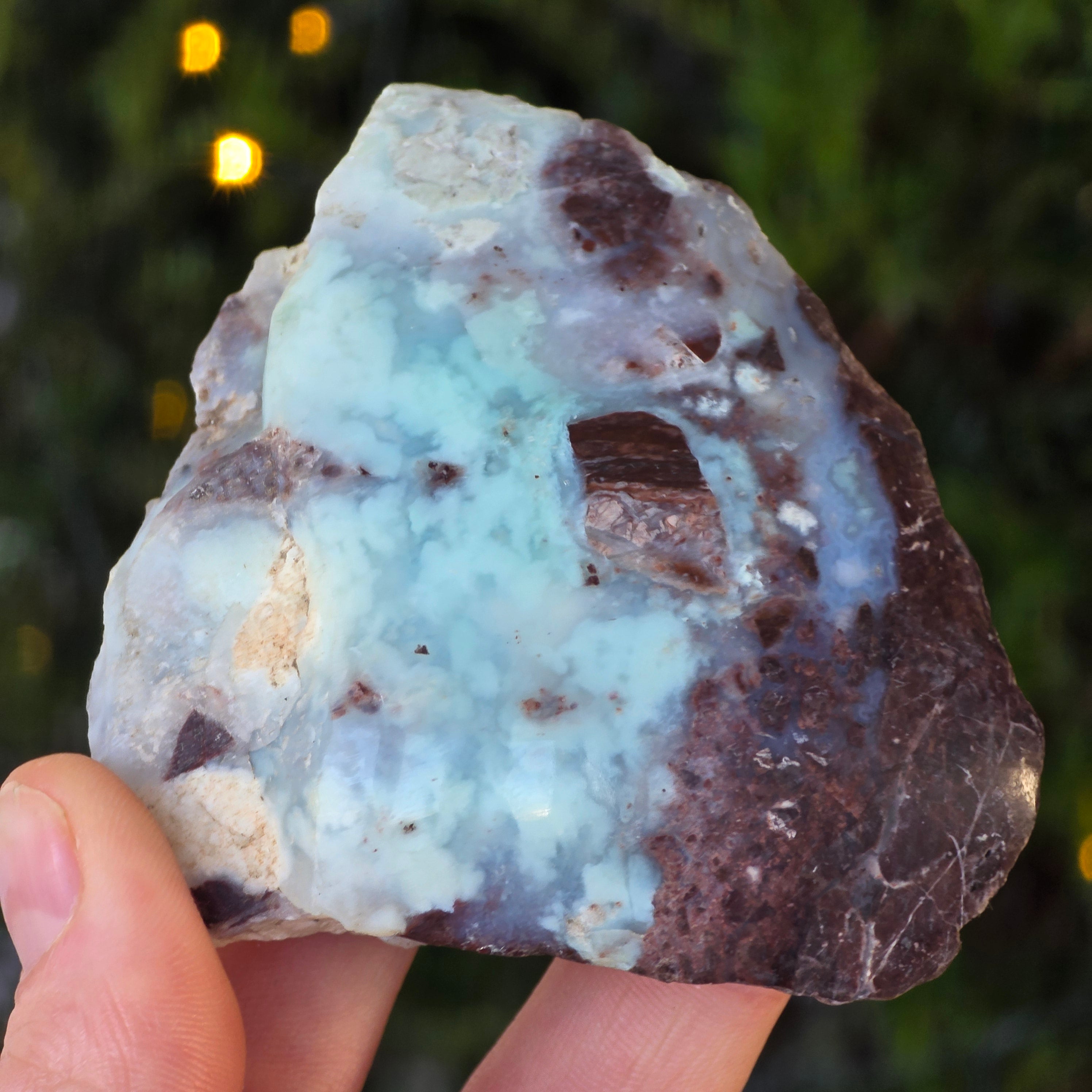Това е естествена, неразрушена форма на хром съдържащ халцедон – труден за намиране минерал, изкопаван единствено в Зимбабве и ценен заради яркия си цвят, който не идва от никел (като при хризопраз), а от хрома, който пулсира дълбоко в кристалната му структура. В тази особеност, сините и зелените включвания създават завладяваща цветова игра, с плавни преходи между прозрачно и непрозрачно, между плътно и ефирно.