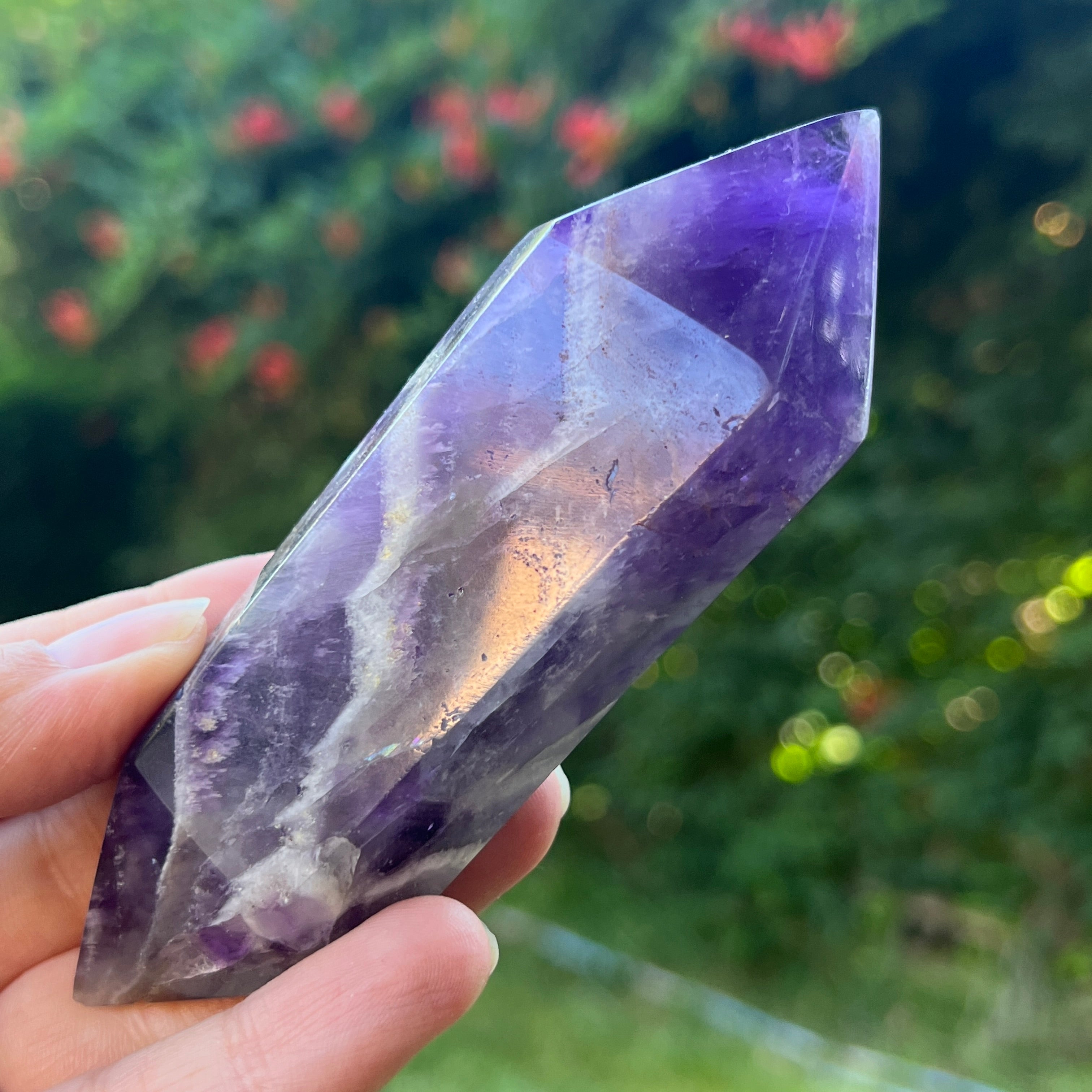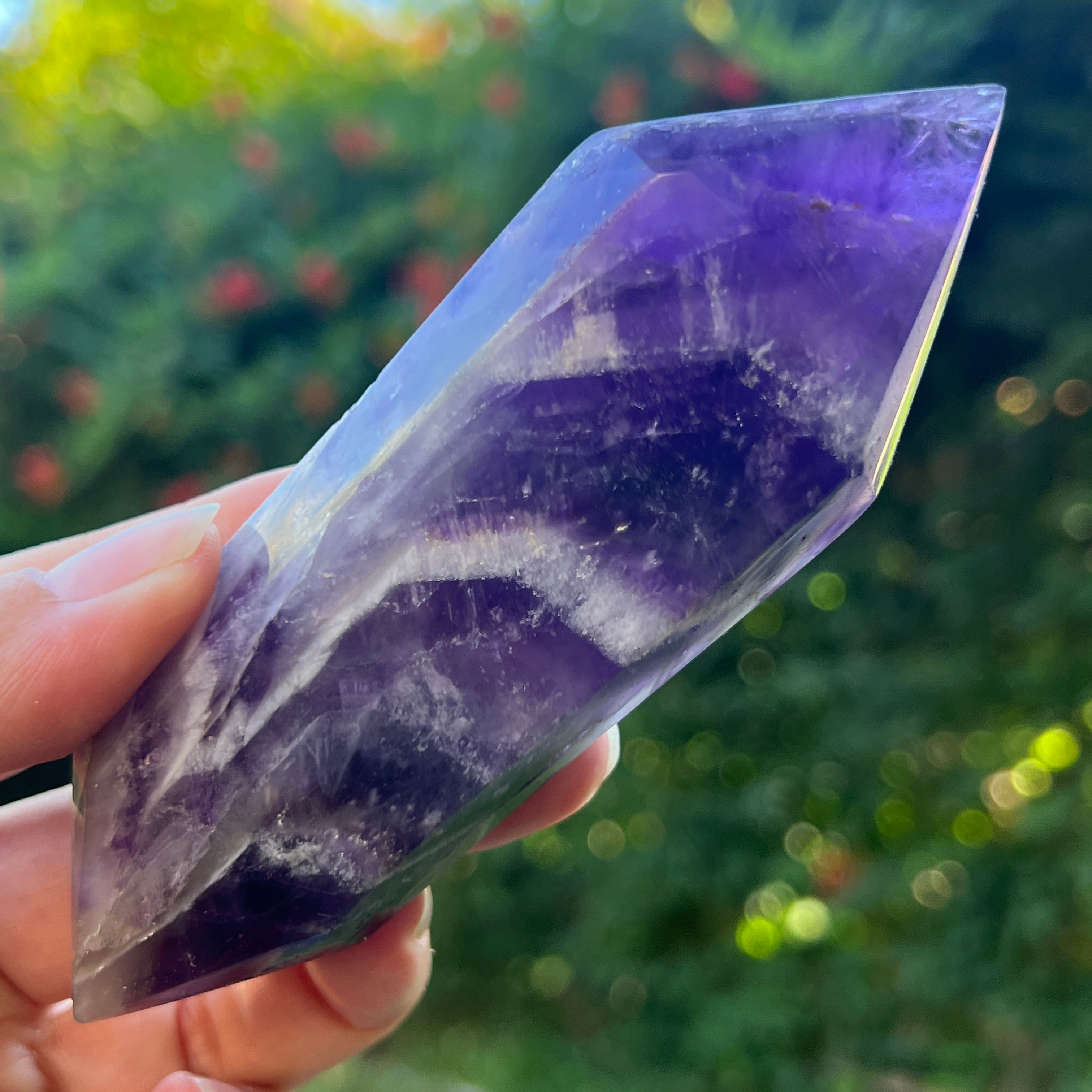 Аметистът шеврон е известен с асоциациите си с коронната и третото око чакри, като засилва интуицията и способността за вземане на решения.
