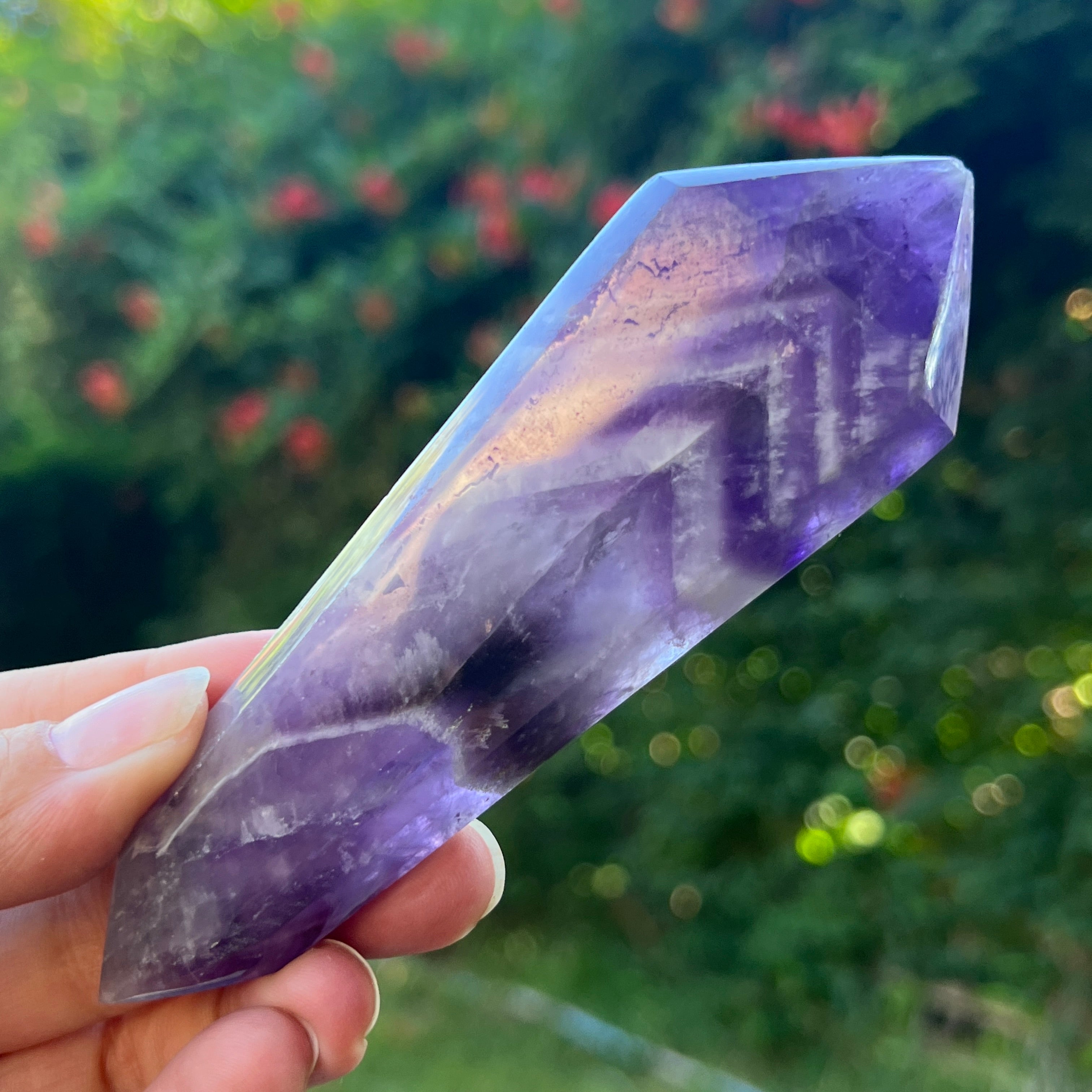 Шевронният аметист е известен със своите асоциации с чакрите на короната и третото око, повишавайки интуицията и способността за вземане на решения.