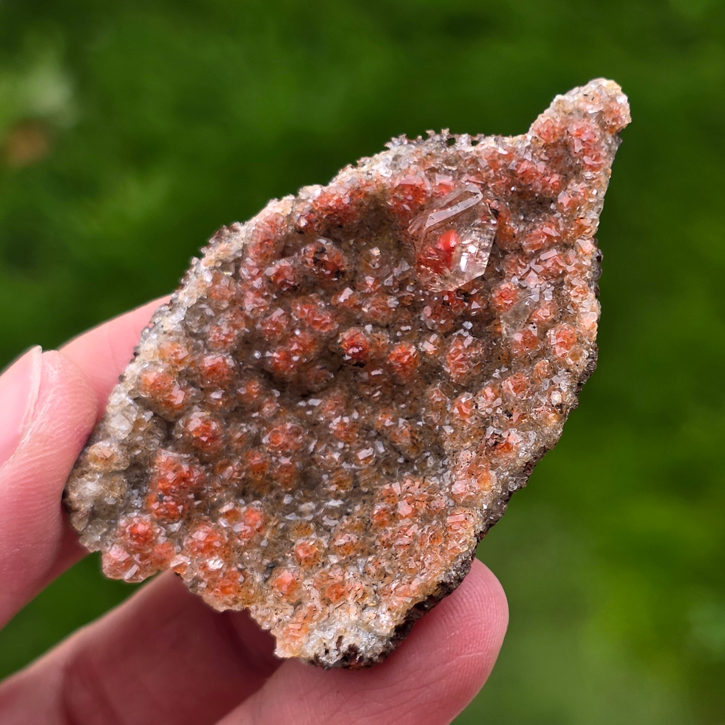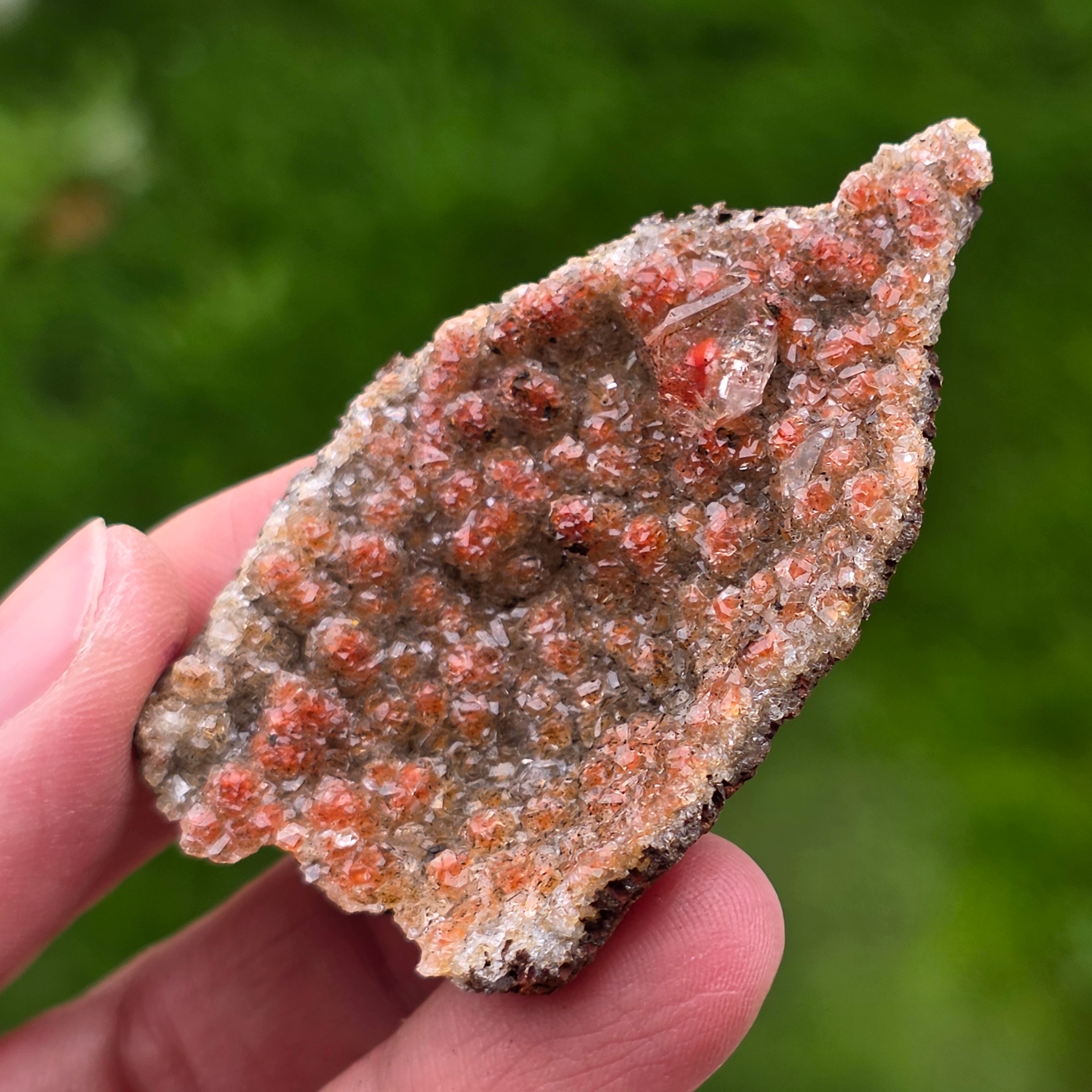 Калцитовите кристали имат специфичен навик, наречен "диамантен калцит", характеризиращ се с Добре дефинирани завършеци и блестящи лица, която отразява светлината по фин, но изразителен начин. Компактното подреждане на кристалите създава блестяща, богато текстурирана повърхност, като всяко парче е различно по форма, интензивност на цвета и разпределение на кристалите.