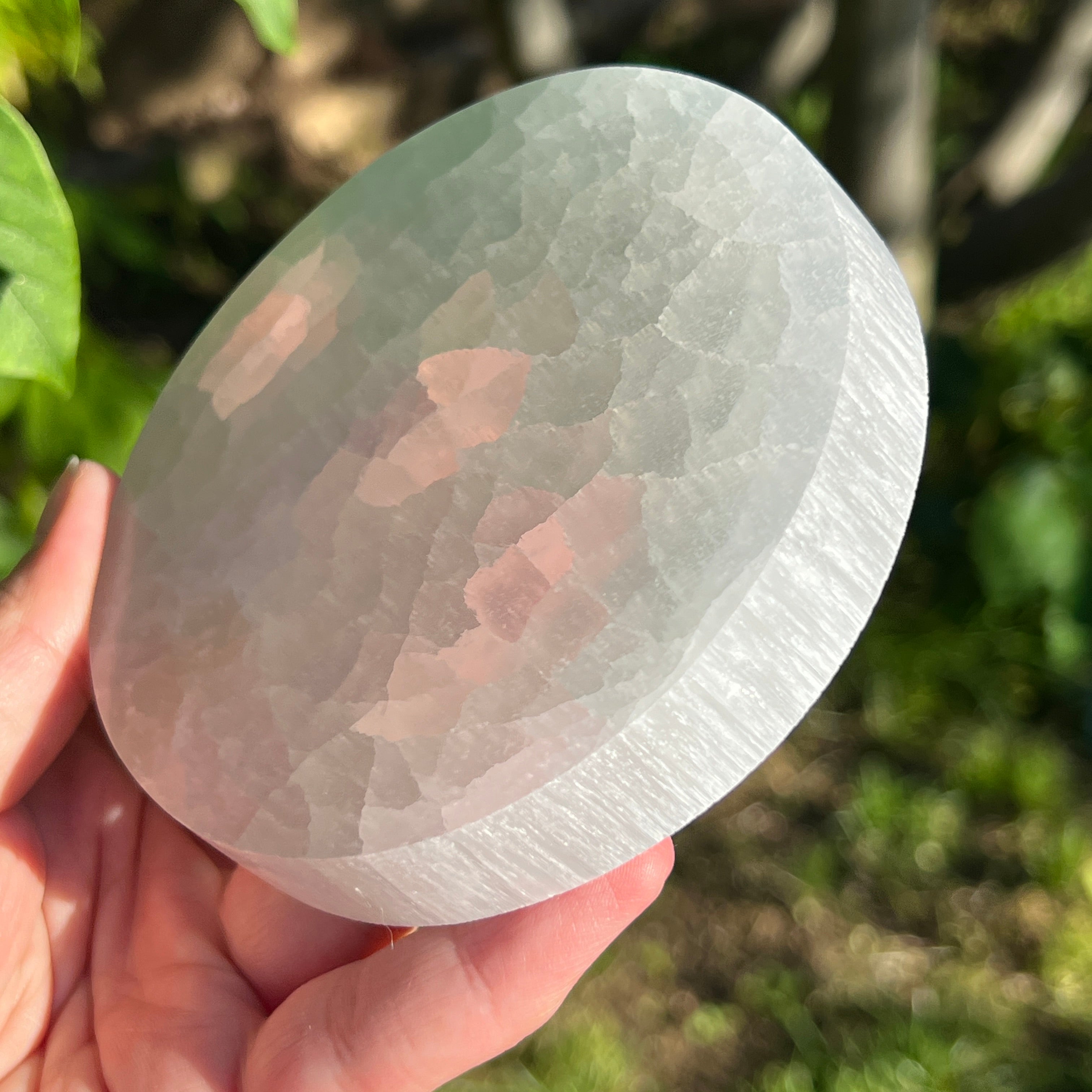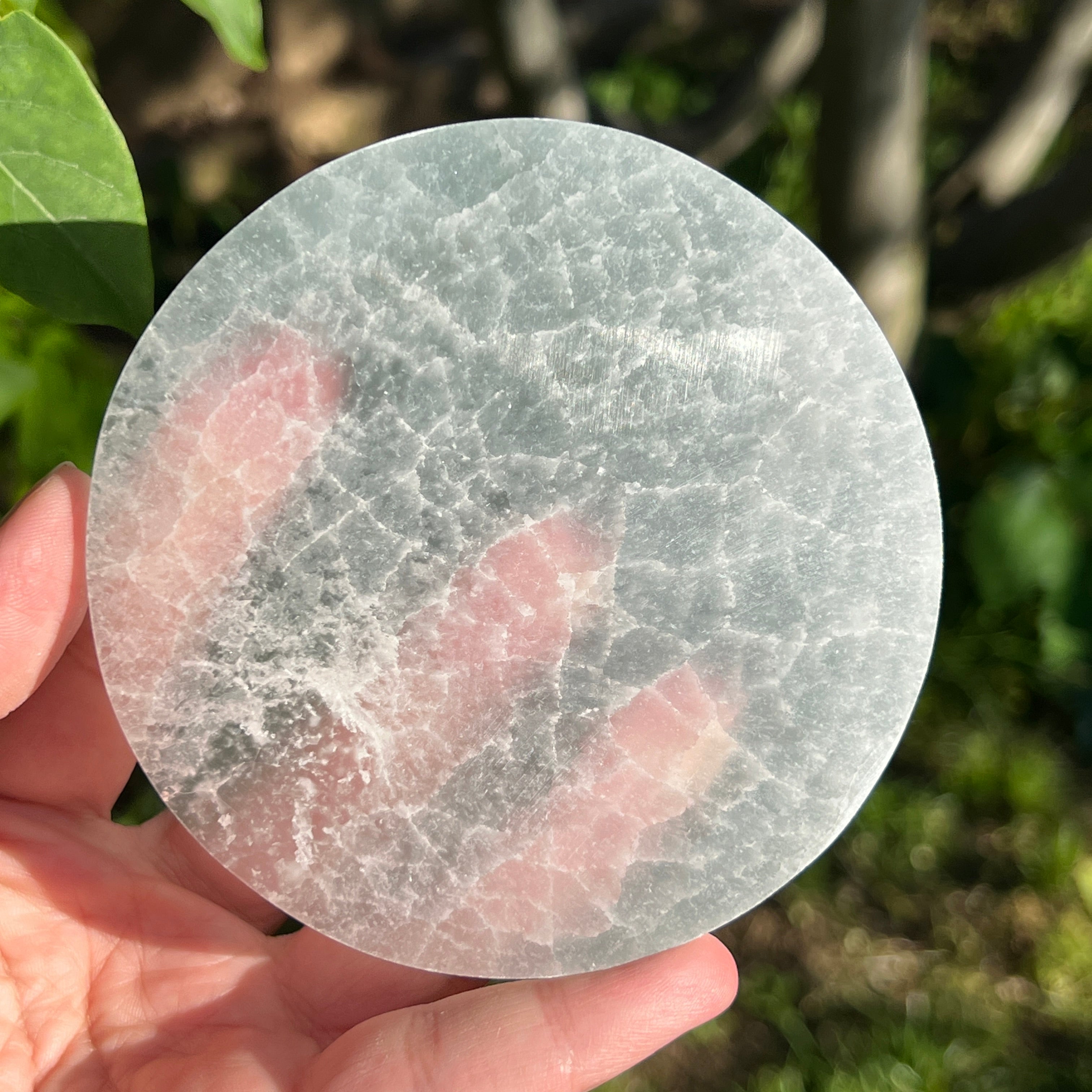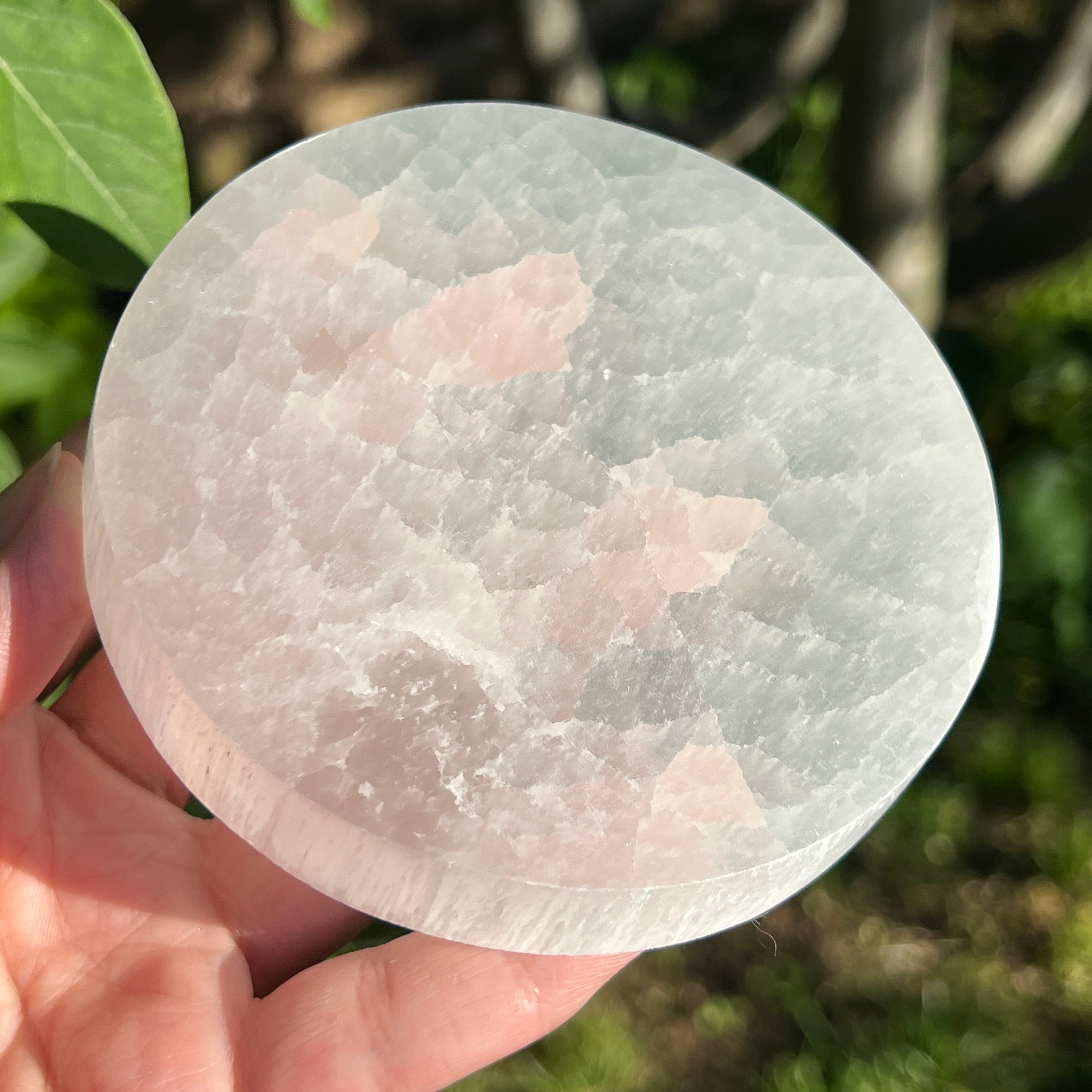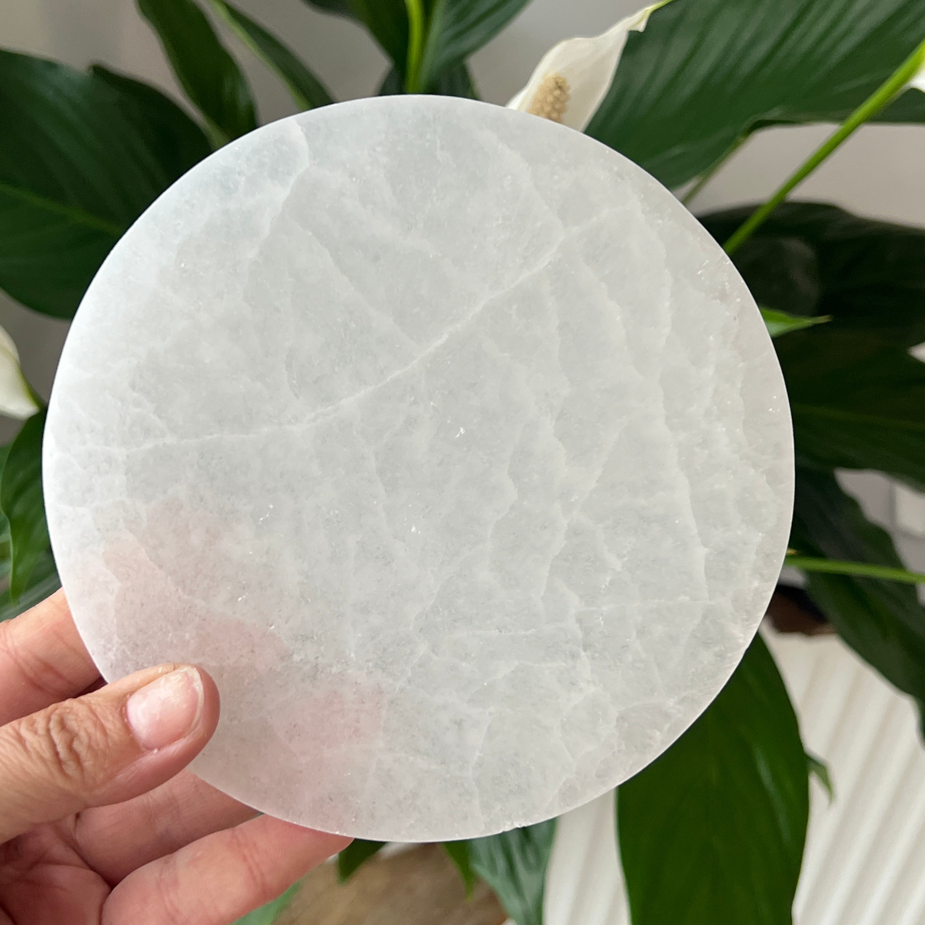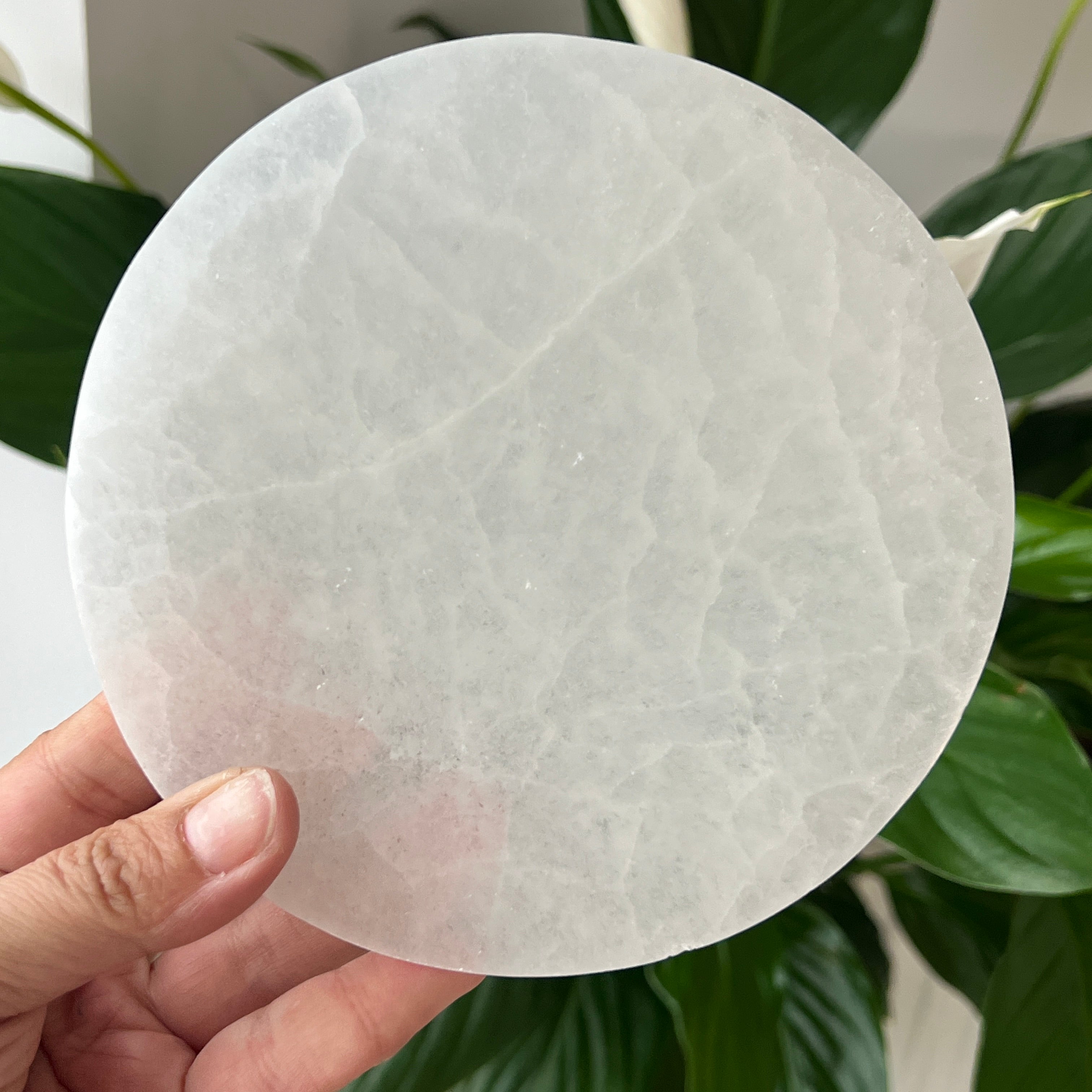 Този диск от марокански селенит е парче с ангелска чистота — млечно бяло огледало, което отразява светлината на луната във всяко влакно.