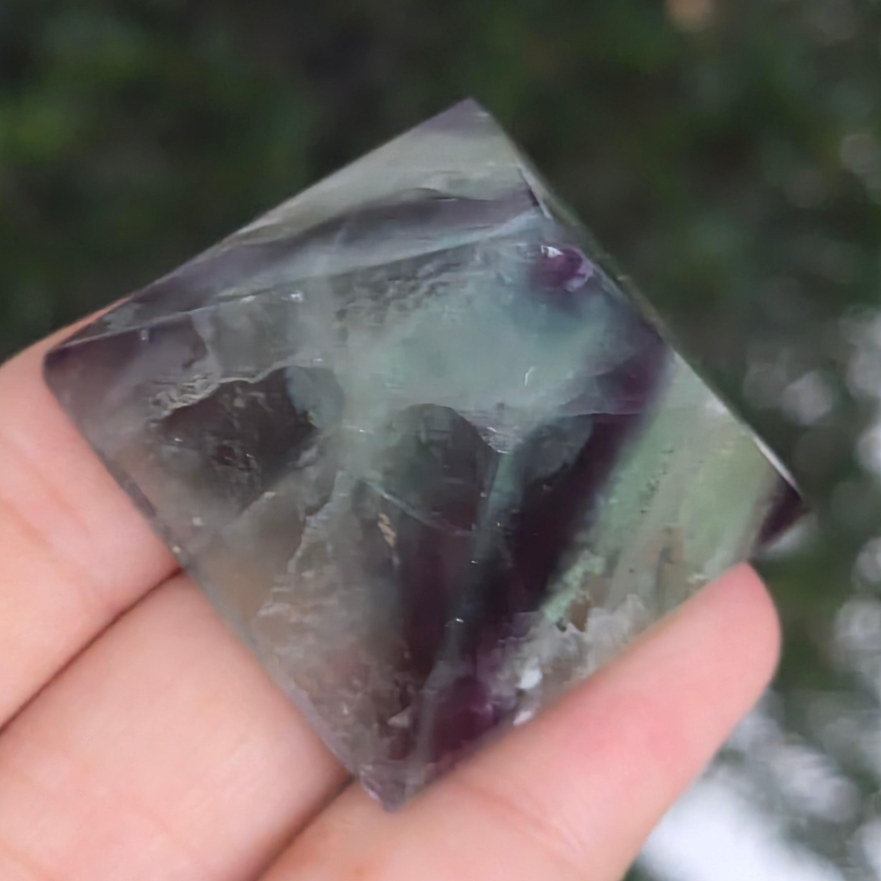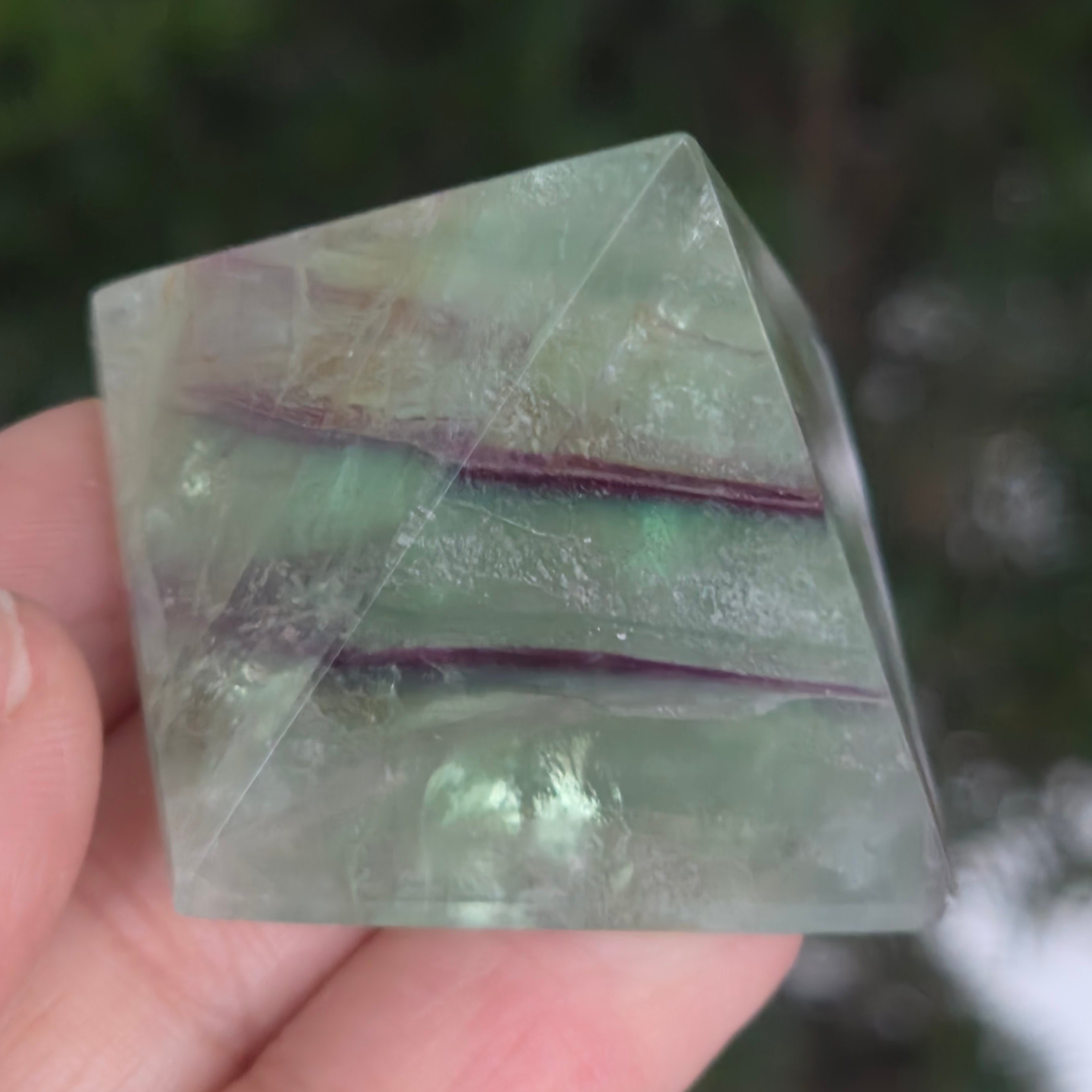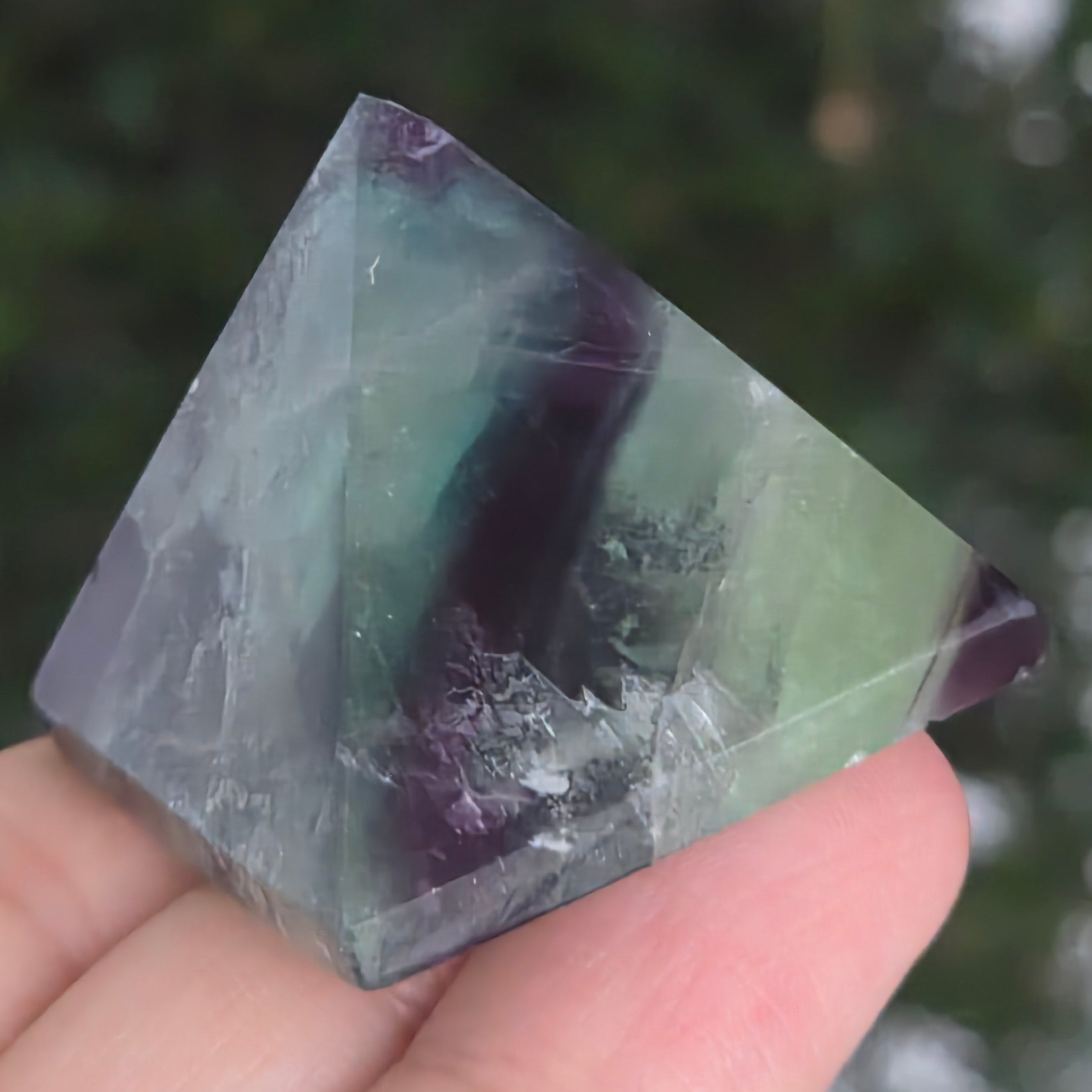 Пирамида, която сякаш е уловила в себе си светлината на ярък спектър от цветове. този парче естествен дъга флуорит, разкриват прозрачни слоеве от лилаво, зелено, тюркоазено и понякога фини нюанси на синьо или розово, подредени като вълните на кристален свят. Перфектно полираната повърхност излъчва фин, хипнотичен блясък, който внася баланс и вдъхновение в пространството, в което е поставен.