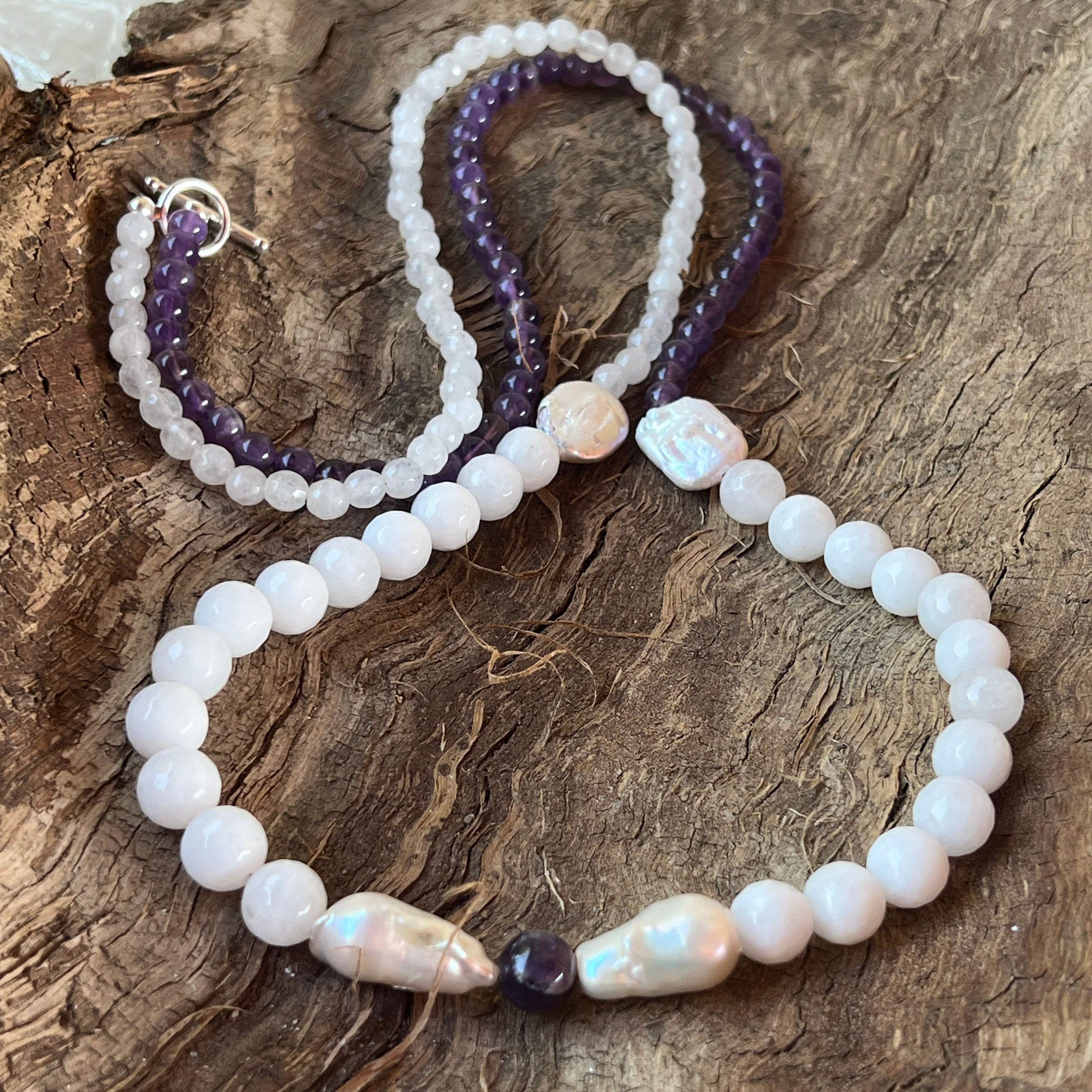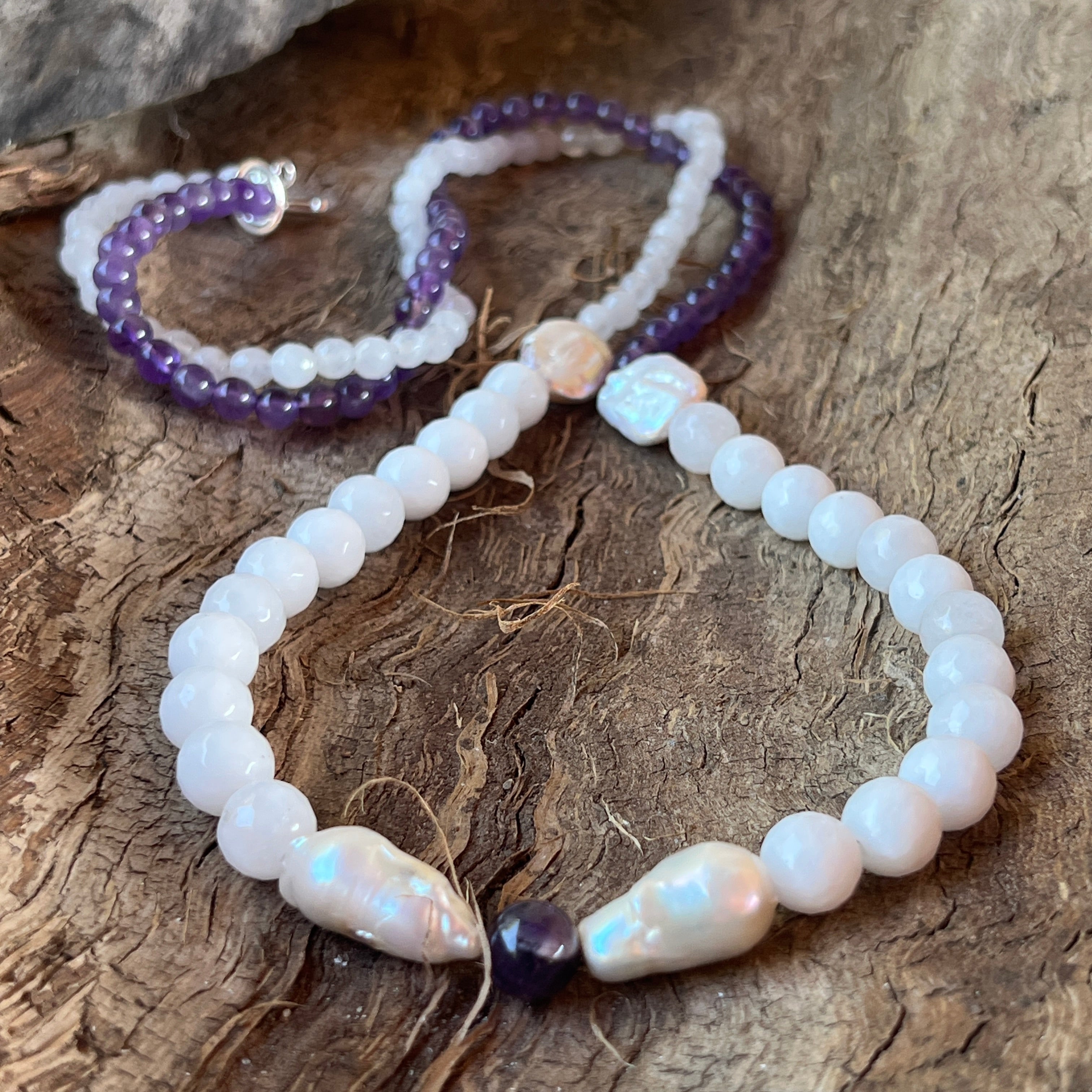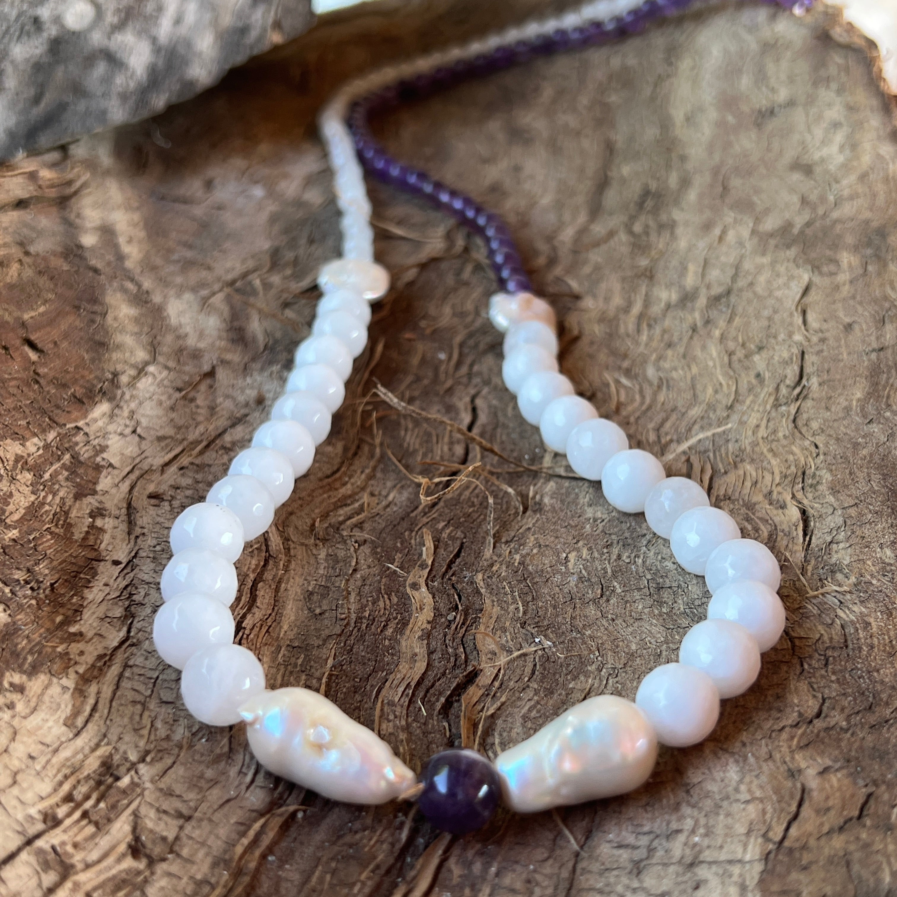 Ревюта – Дълго колие от аметист, жадеит и бели жадеитови перли, перли Serenity#16