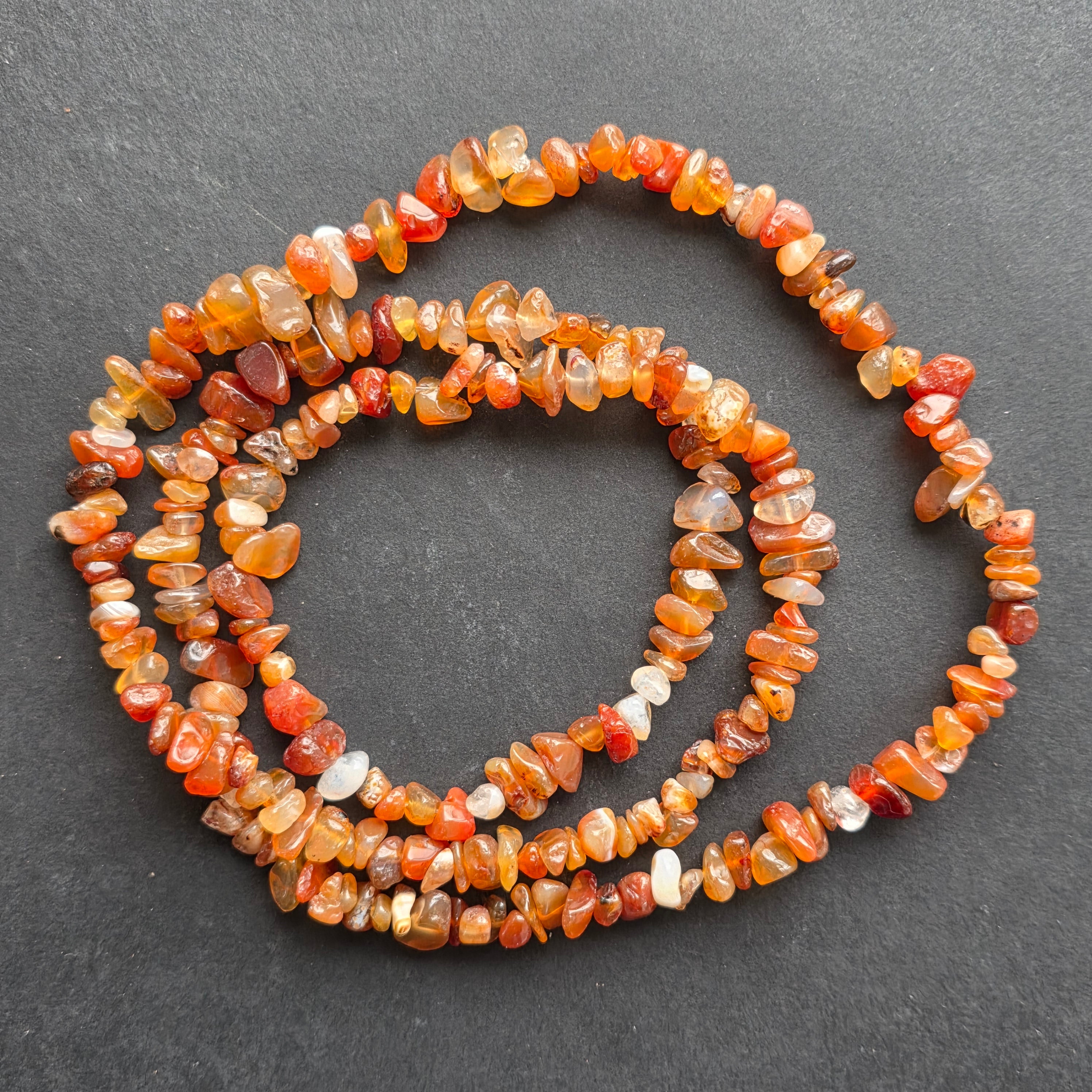 Колие, което носи спомена за вътрешния огън. Естествените чипове на карнеол, деликатно полирани и нанизани в непрекъснат низ от 80 см, той се настанява леко около врата, излъчвайки топлината на червеникавата земя, от която идват. Всеки фрагмент носи уникален нюанс — от дълбоко оранжево до прозрачно тухлено червено — създавайки ярка, слънчева вибрация, която събужда жаждата за живота и смелостта да действаш.