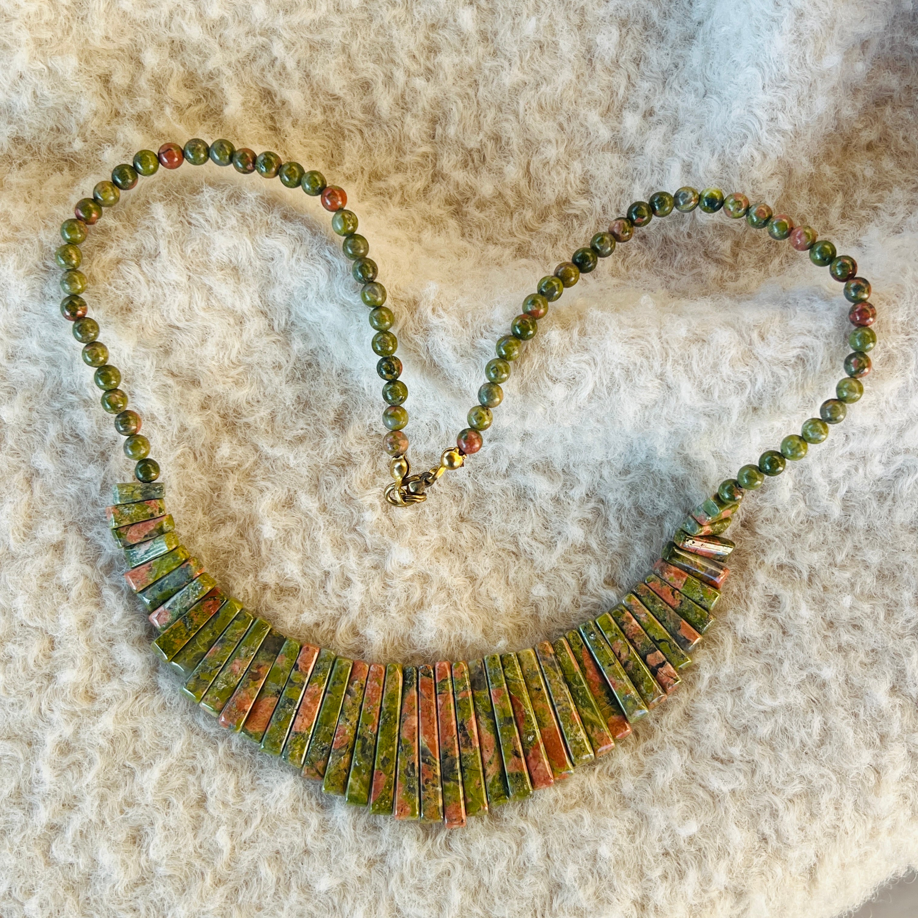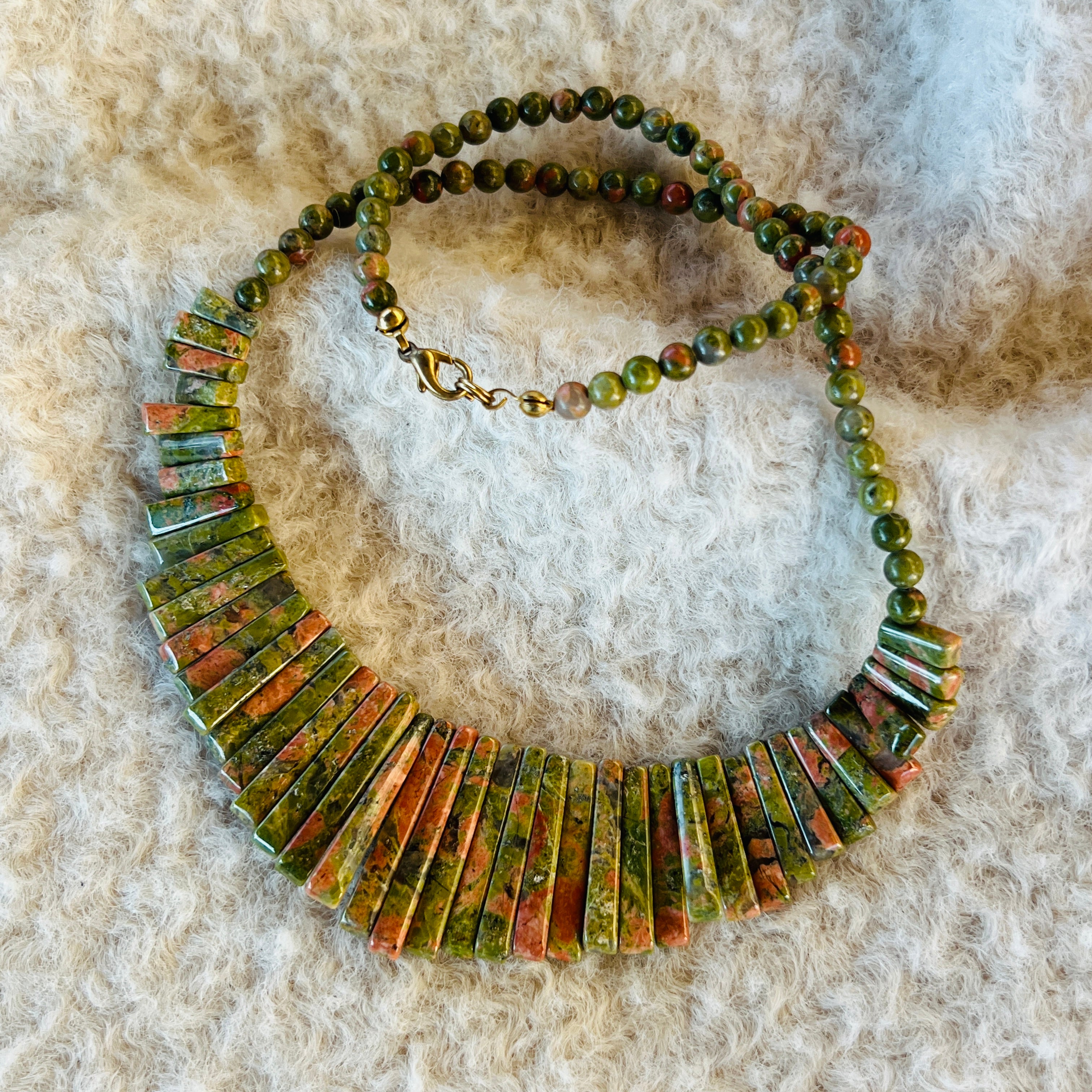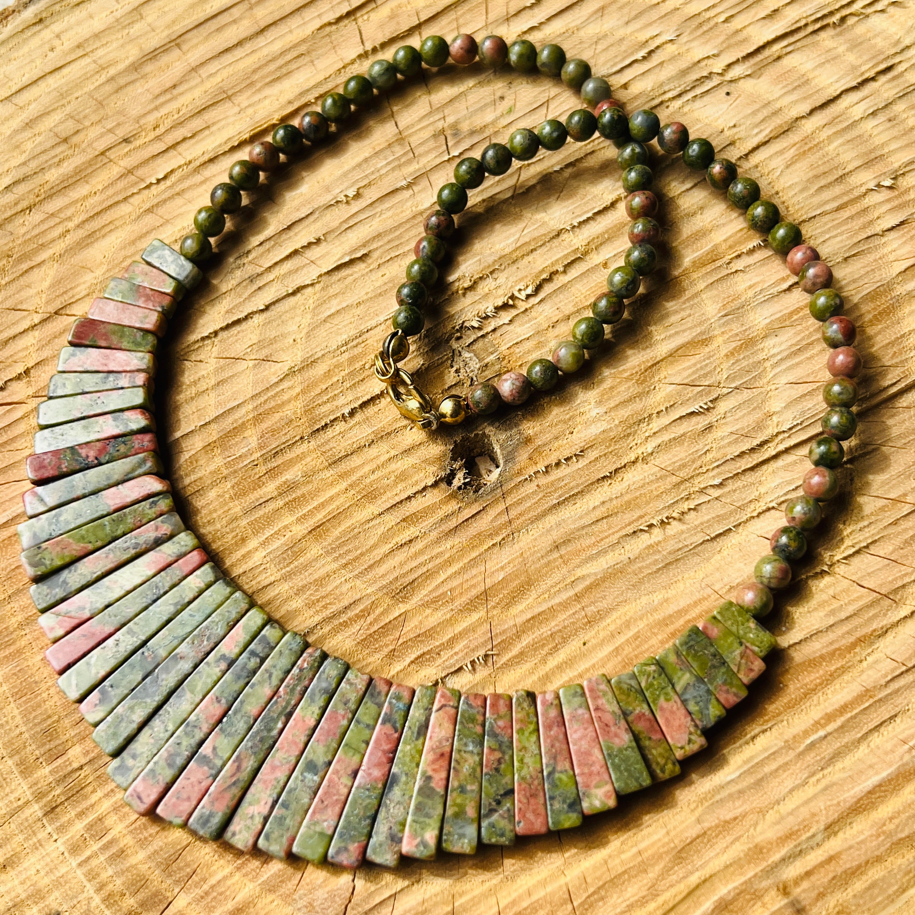 Унакит е полускъпоценен камък, съставен от феспар, епидот, кварц, слюда.
