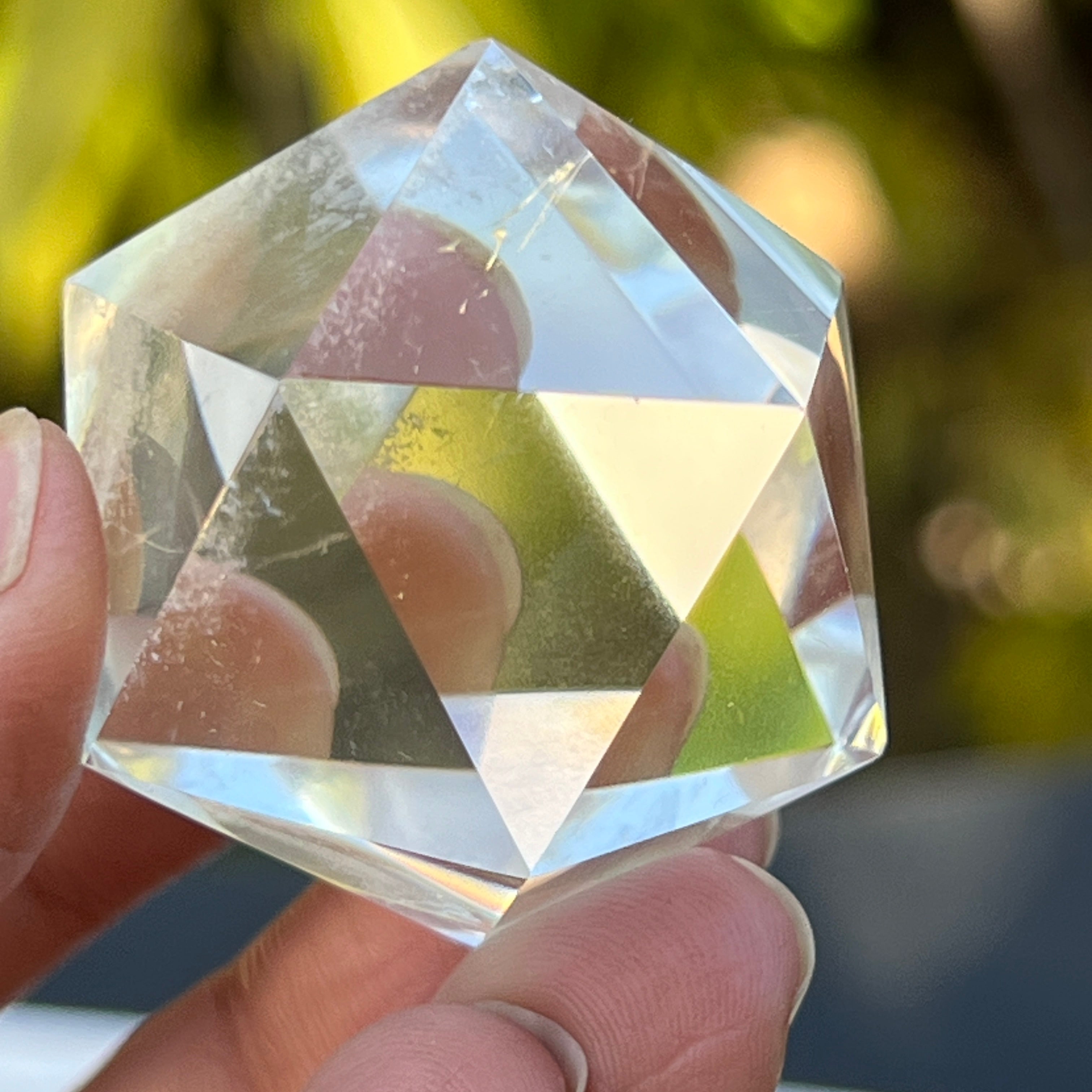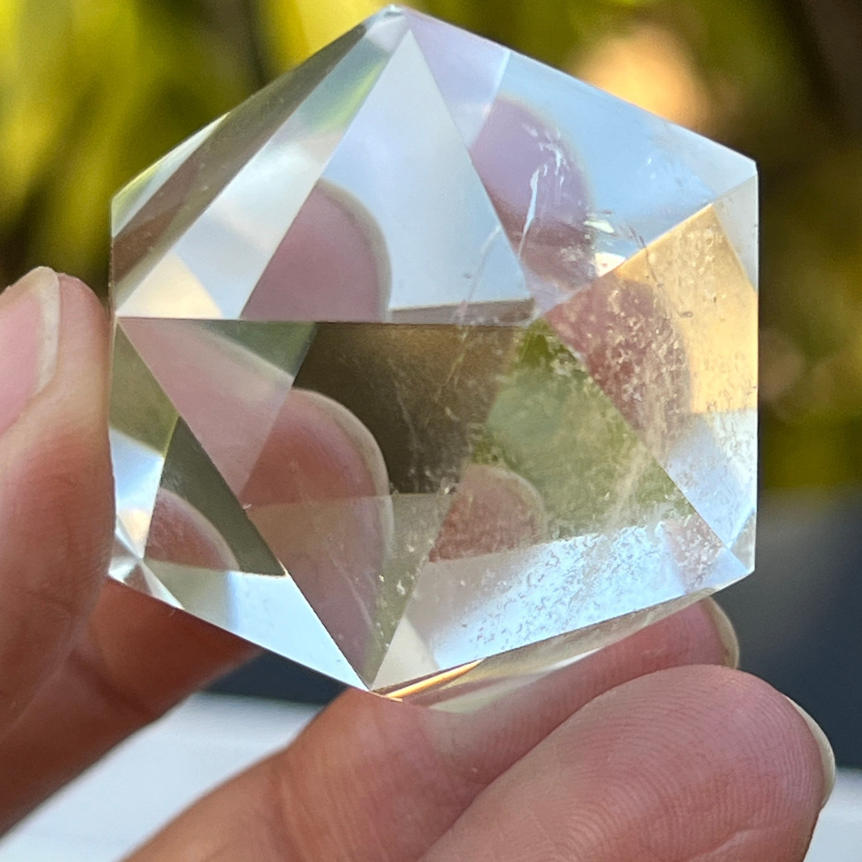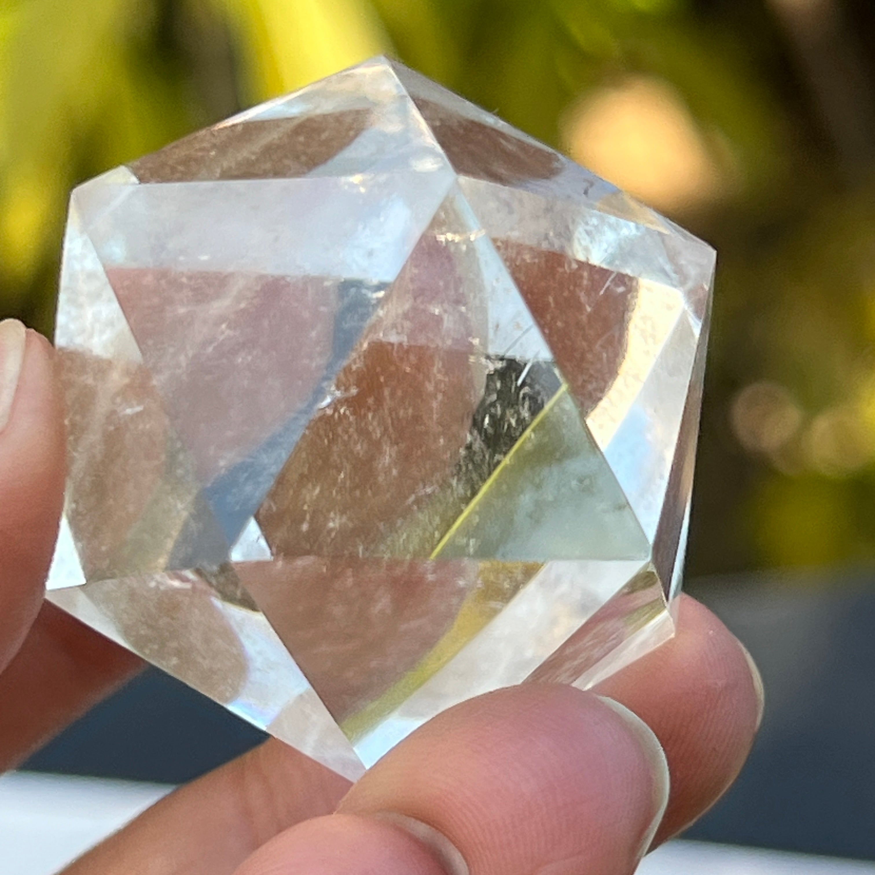 Икосаедър от безцветен кварц (планински кристал), прецизно ръчно шлифован във формата на платонично тяло с 20 равностранни триъгълни лица.