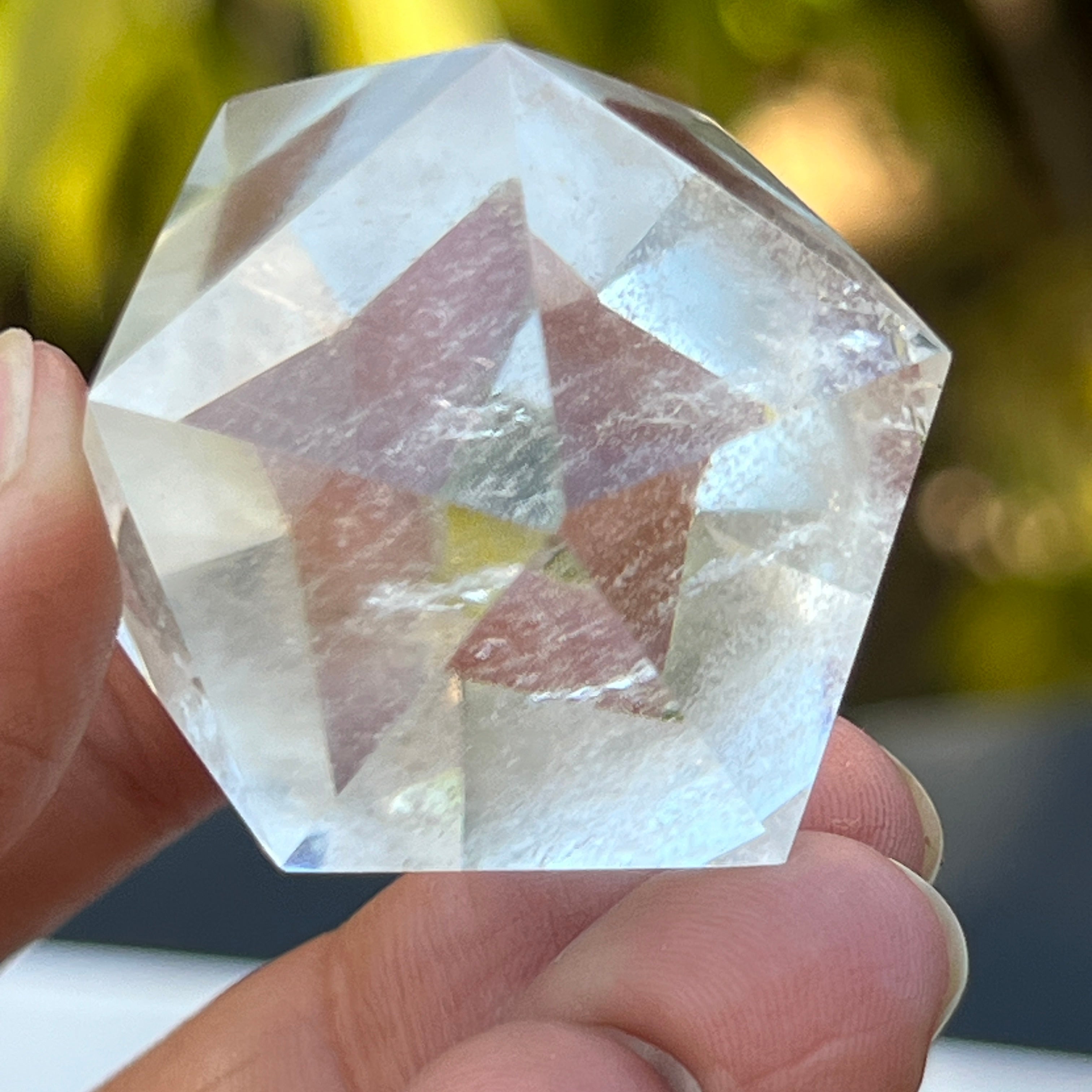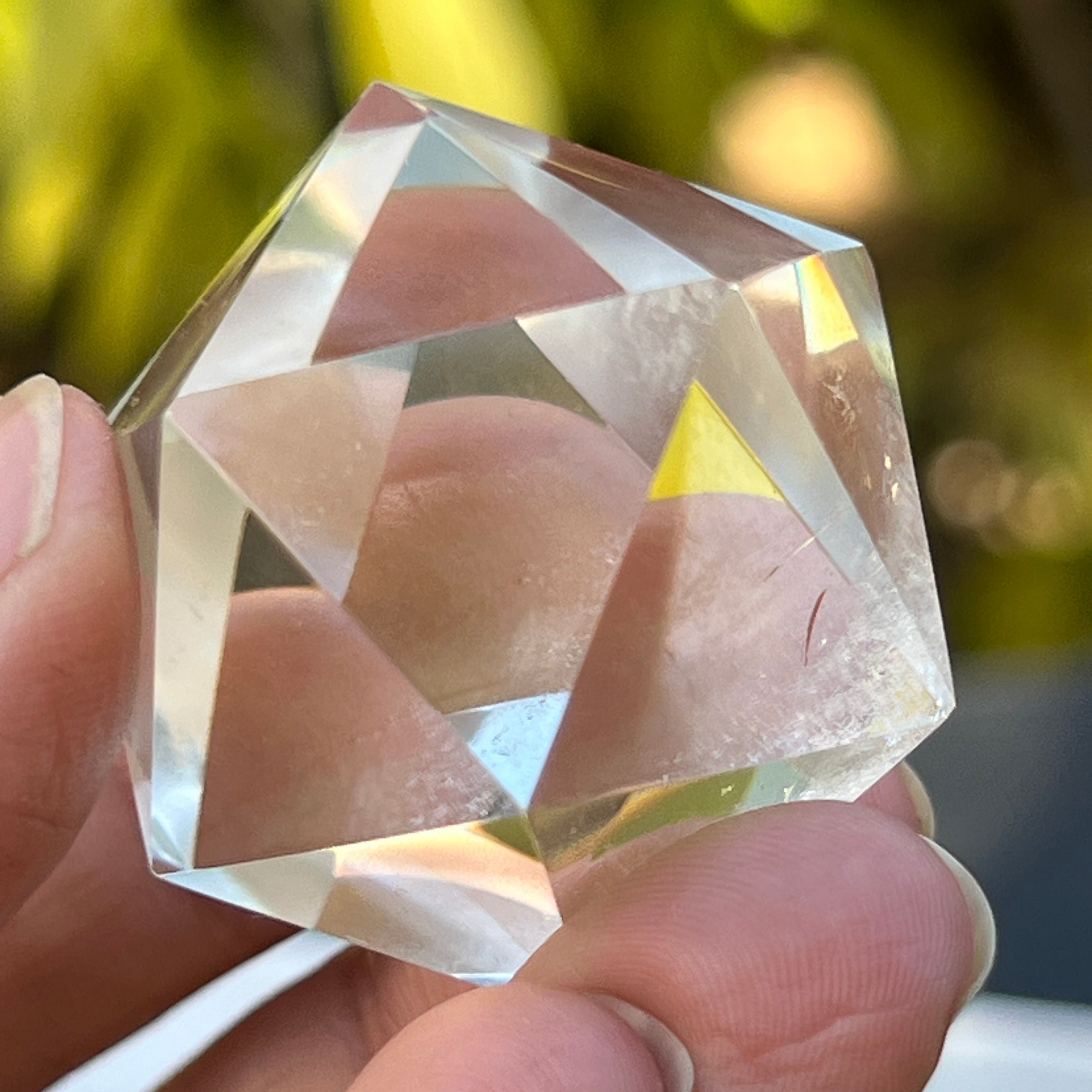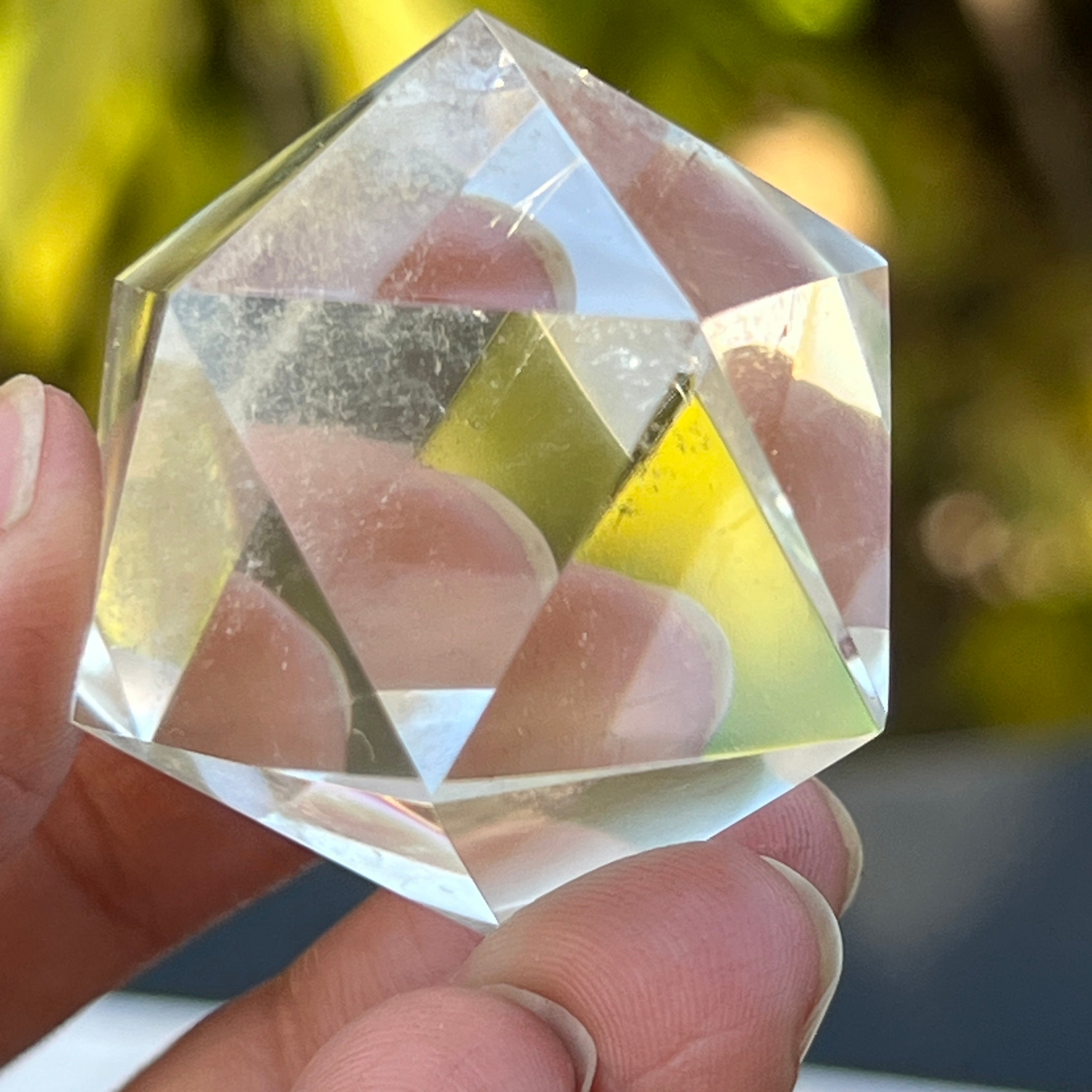 Икосаедър от безцветен кварц (планински кристал), прецизно ръчно шлифован във формата на платонично тяло с 20 равностранни триъгълни лица.