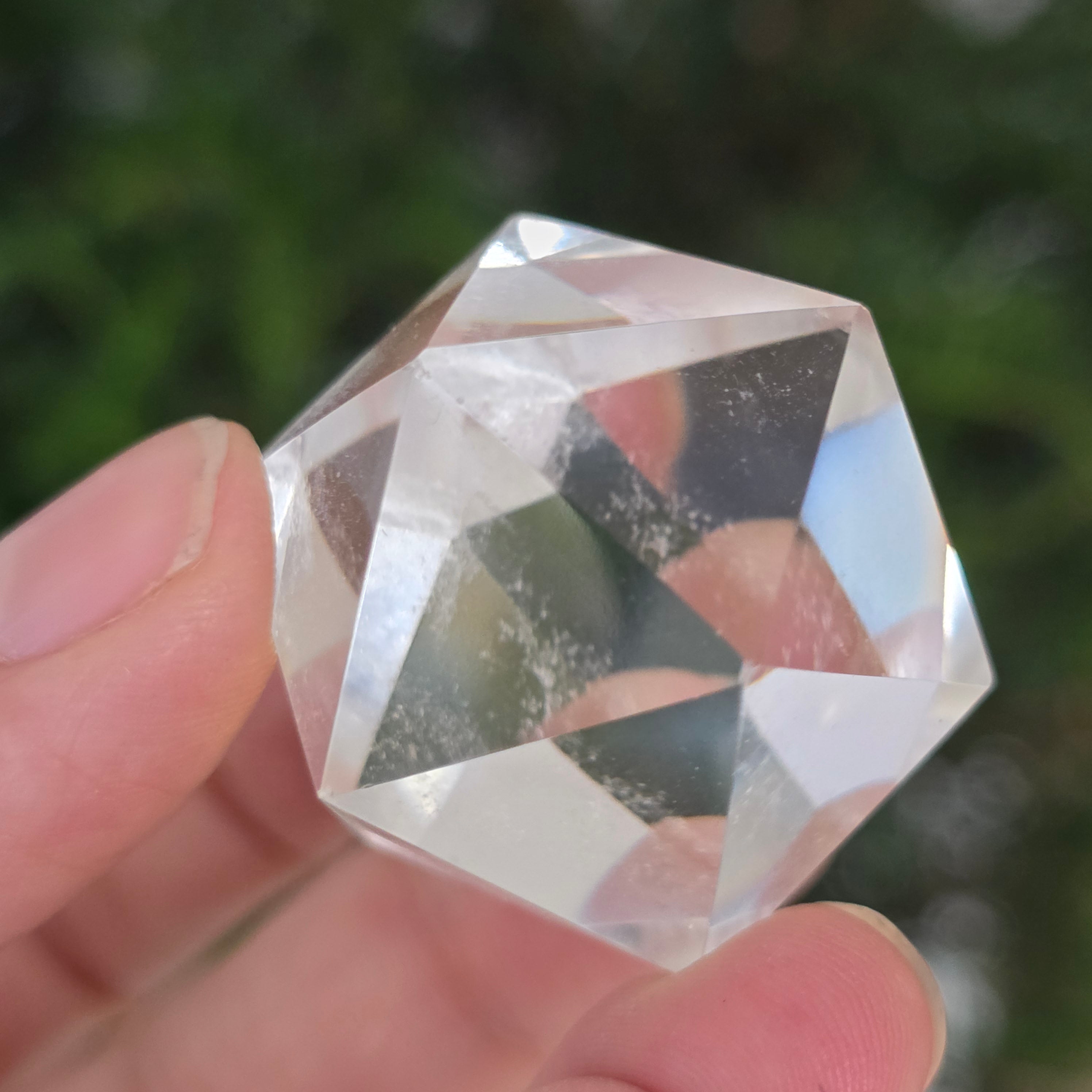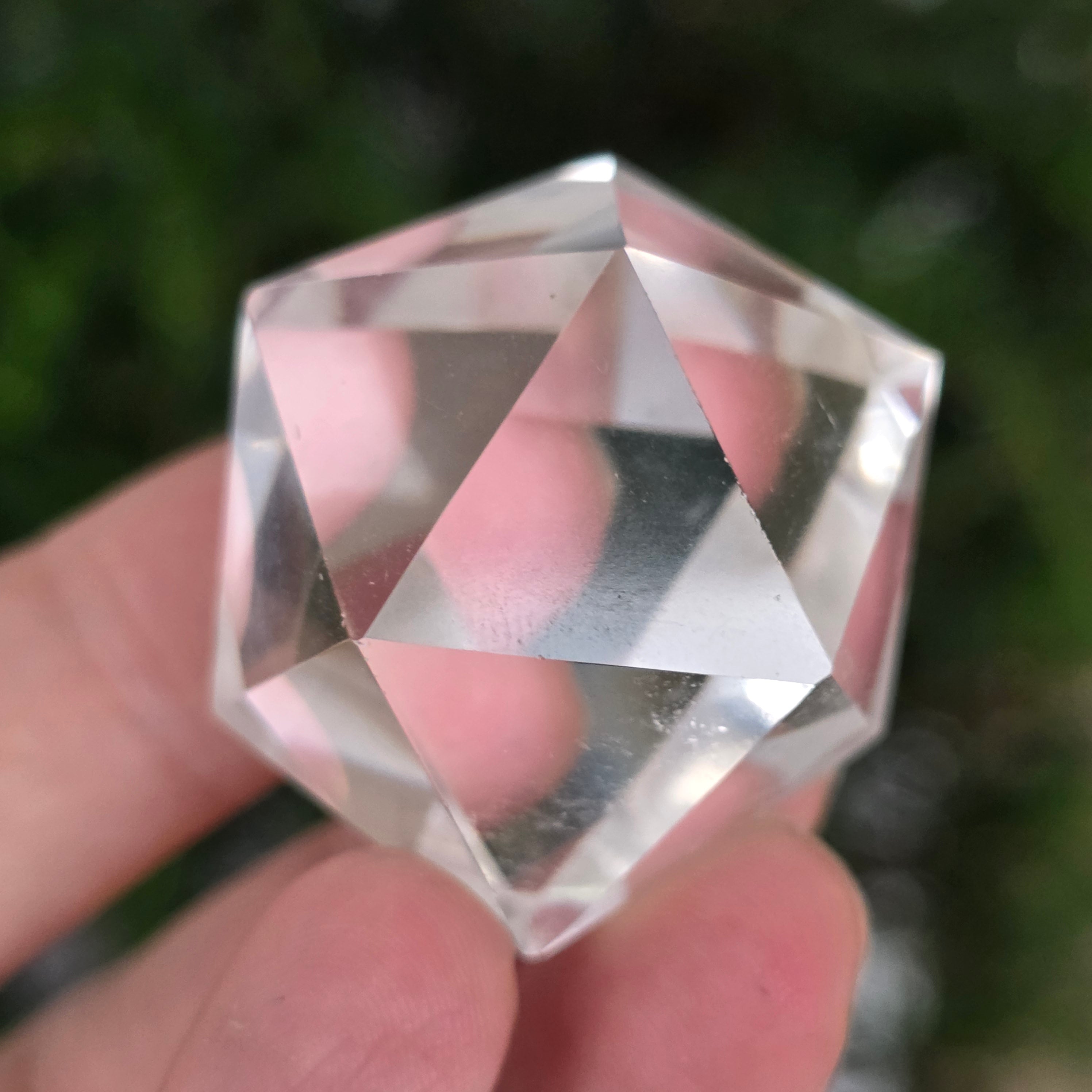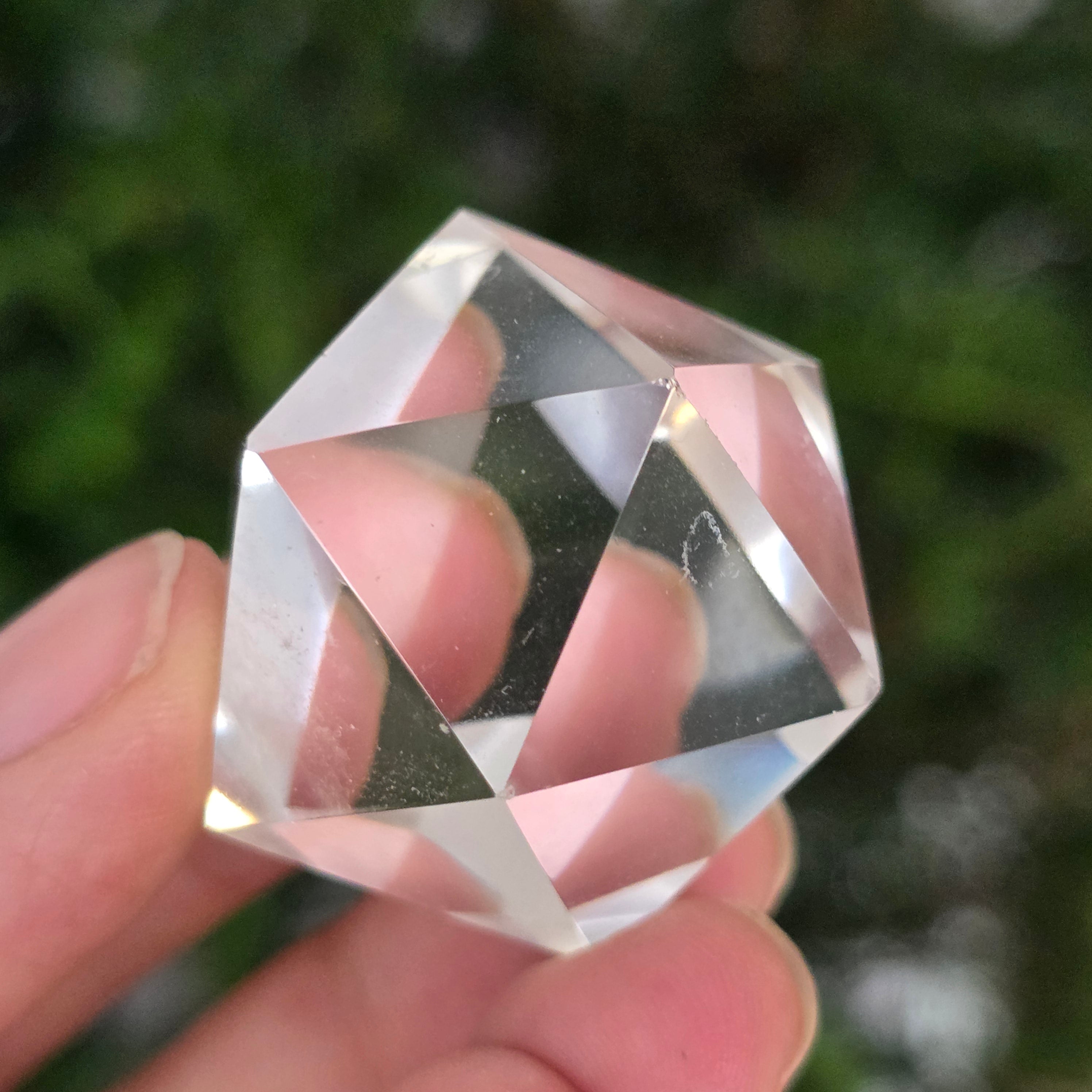Икосаедър от безцветен кварц (планински кристал), прецизно ръчно шлифован във формата на платонично тяло с 20 равностранни триъгълни лица.