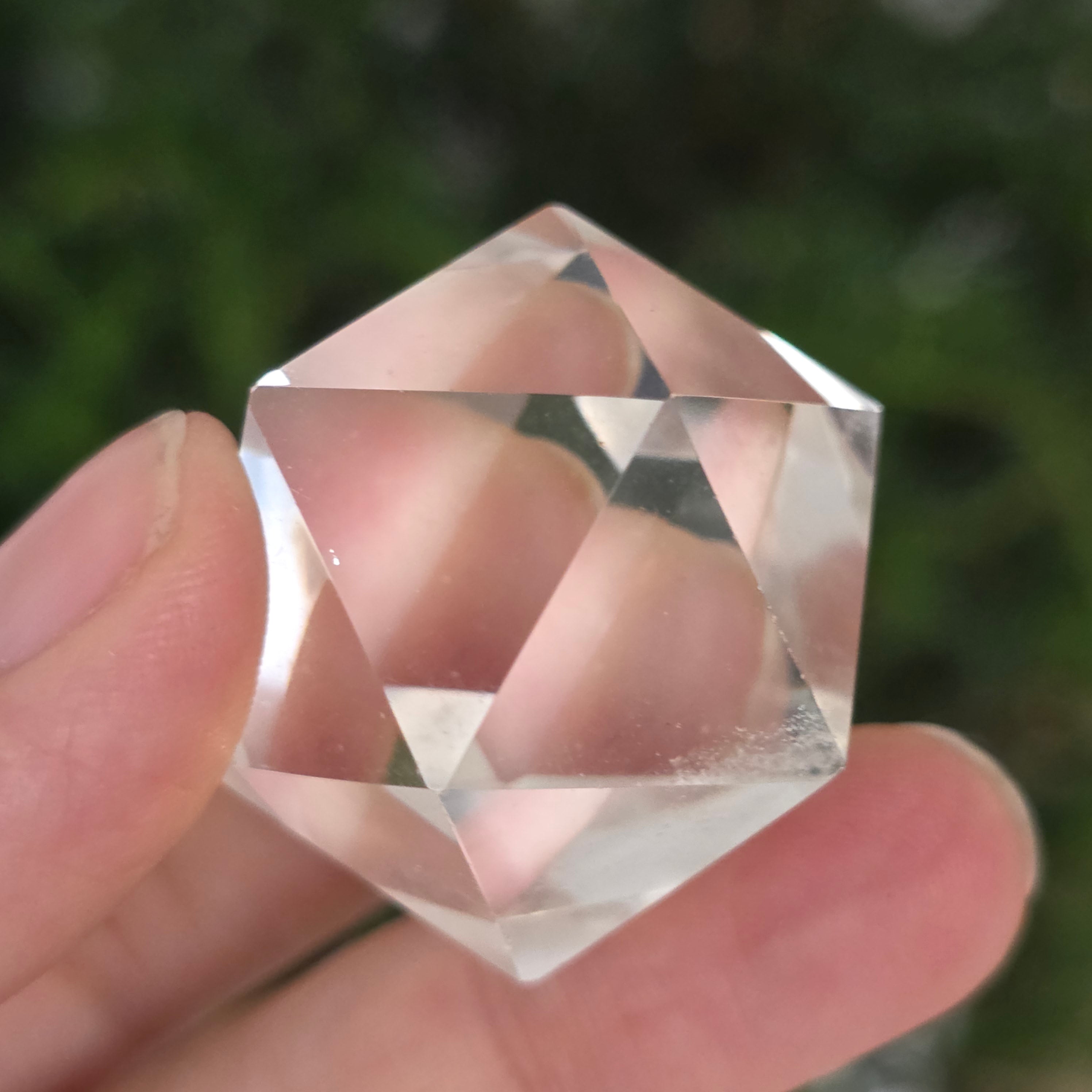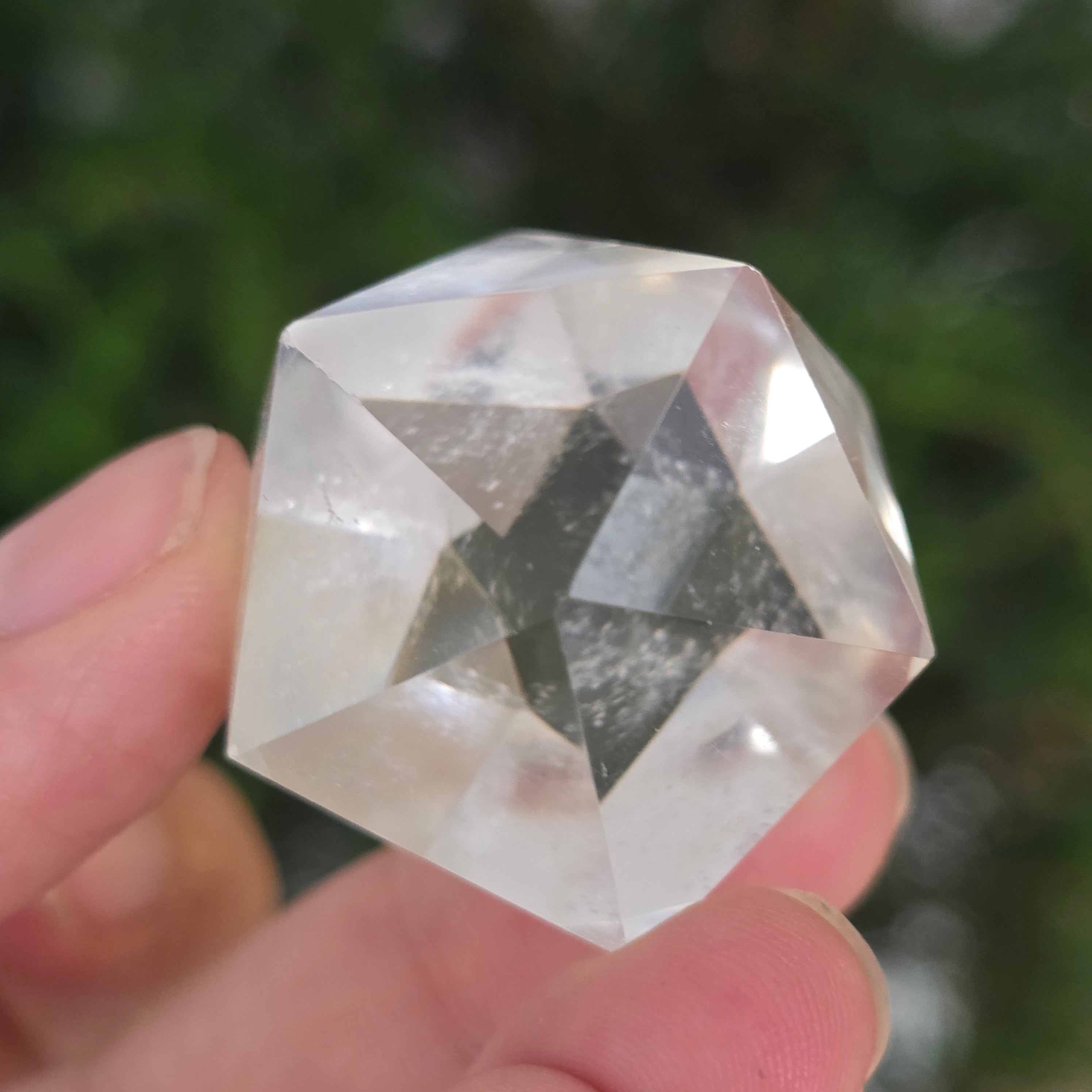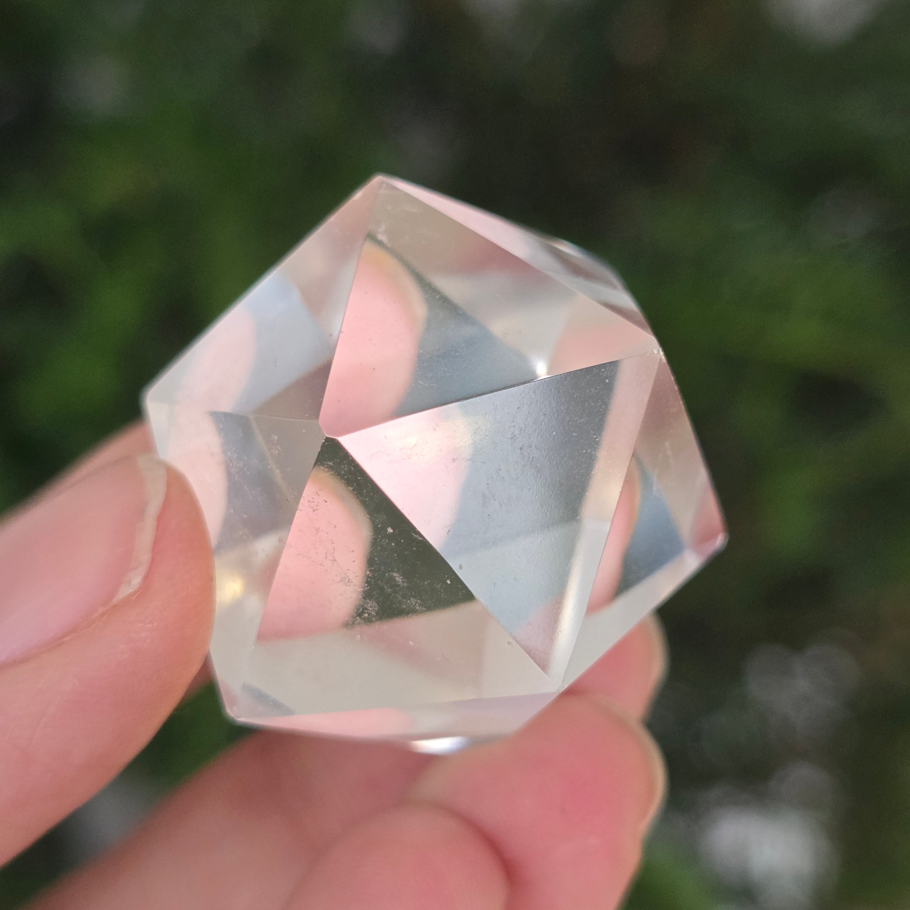 Икосаедър от безцветен кварц (планински кристал), прецизно ръчно шлифован във формата на платонично тяло с 20 равностранни триъгълни лица.