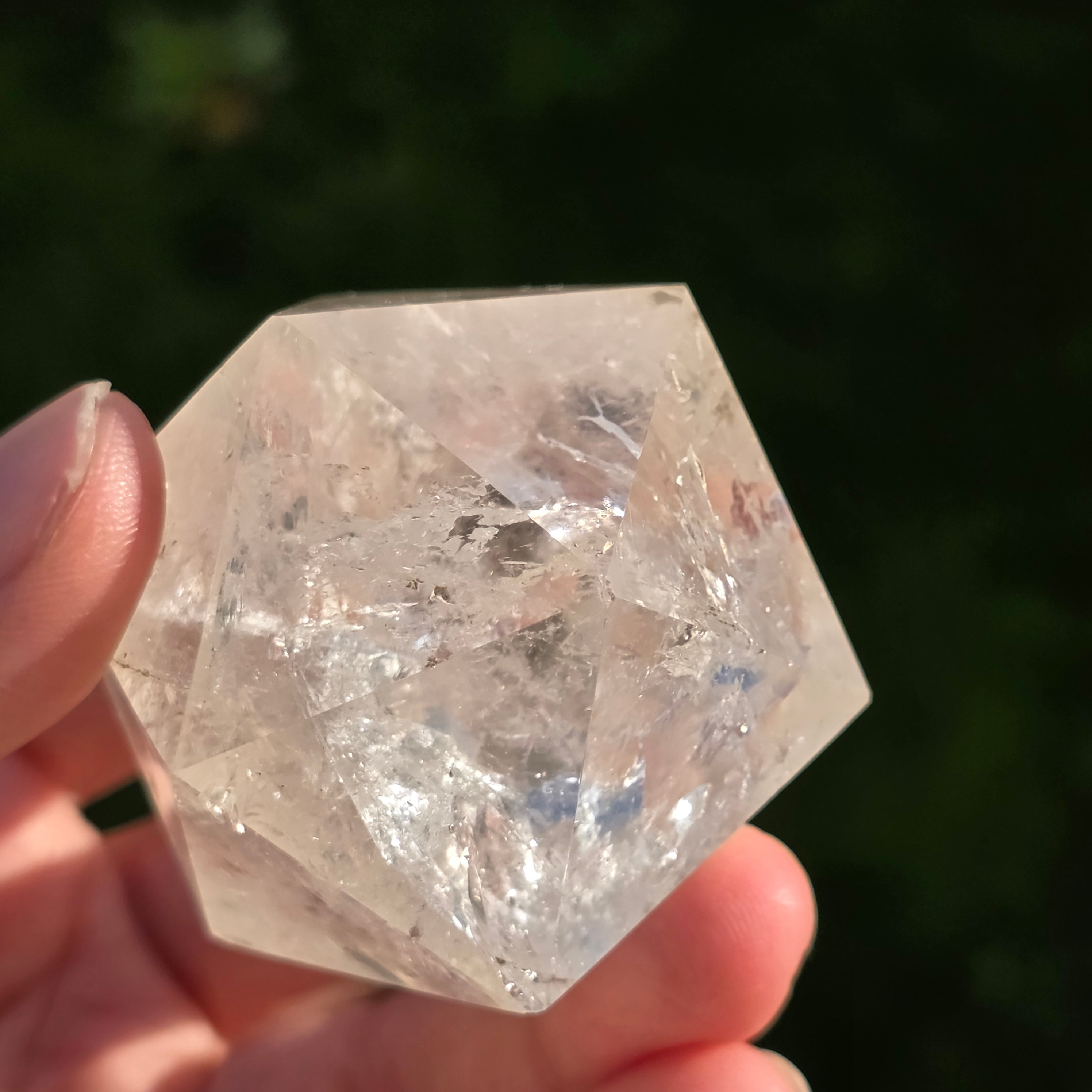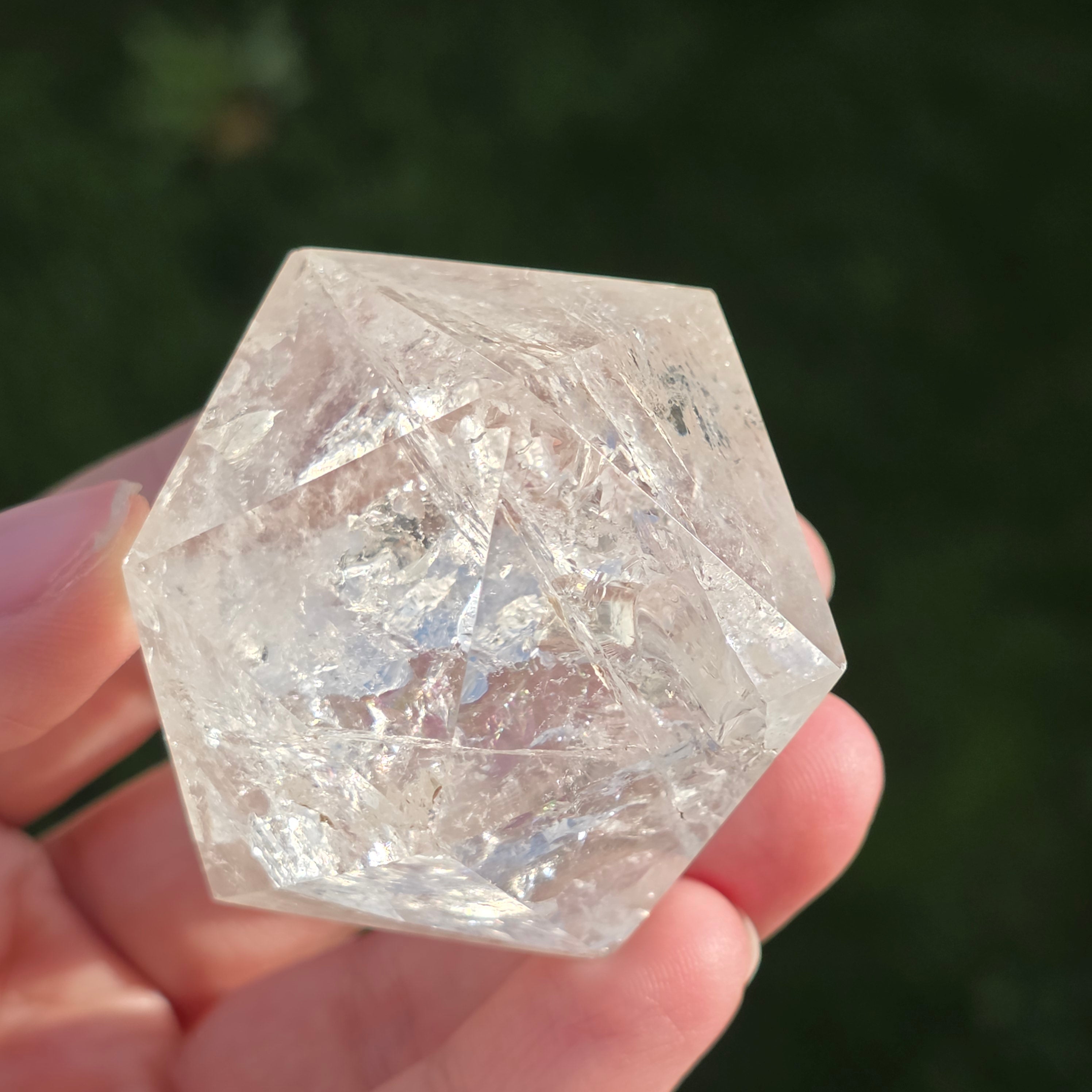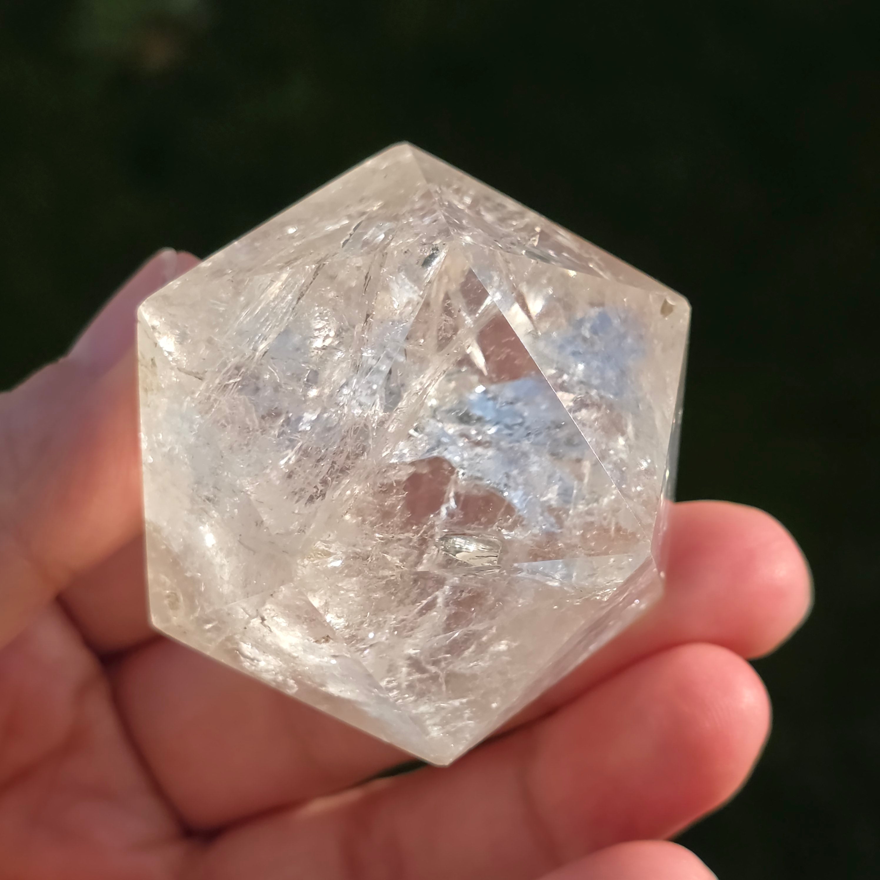 Икосаедър от безцветен кварц (планински кристал), ръчно прецизно шлифован във формата на платоническо тяло с 20 равностранни триъгълни лица.