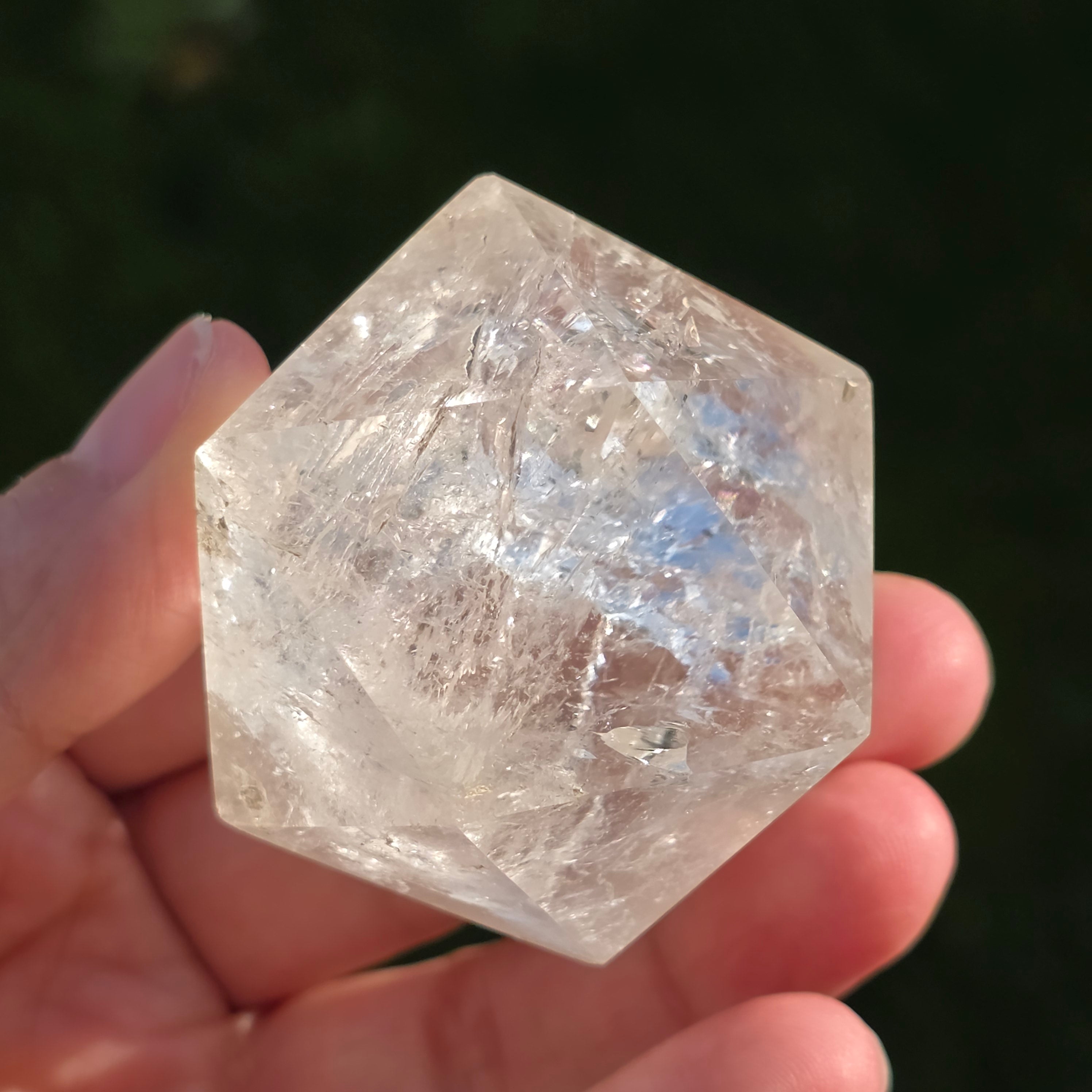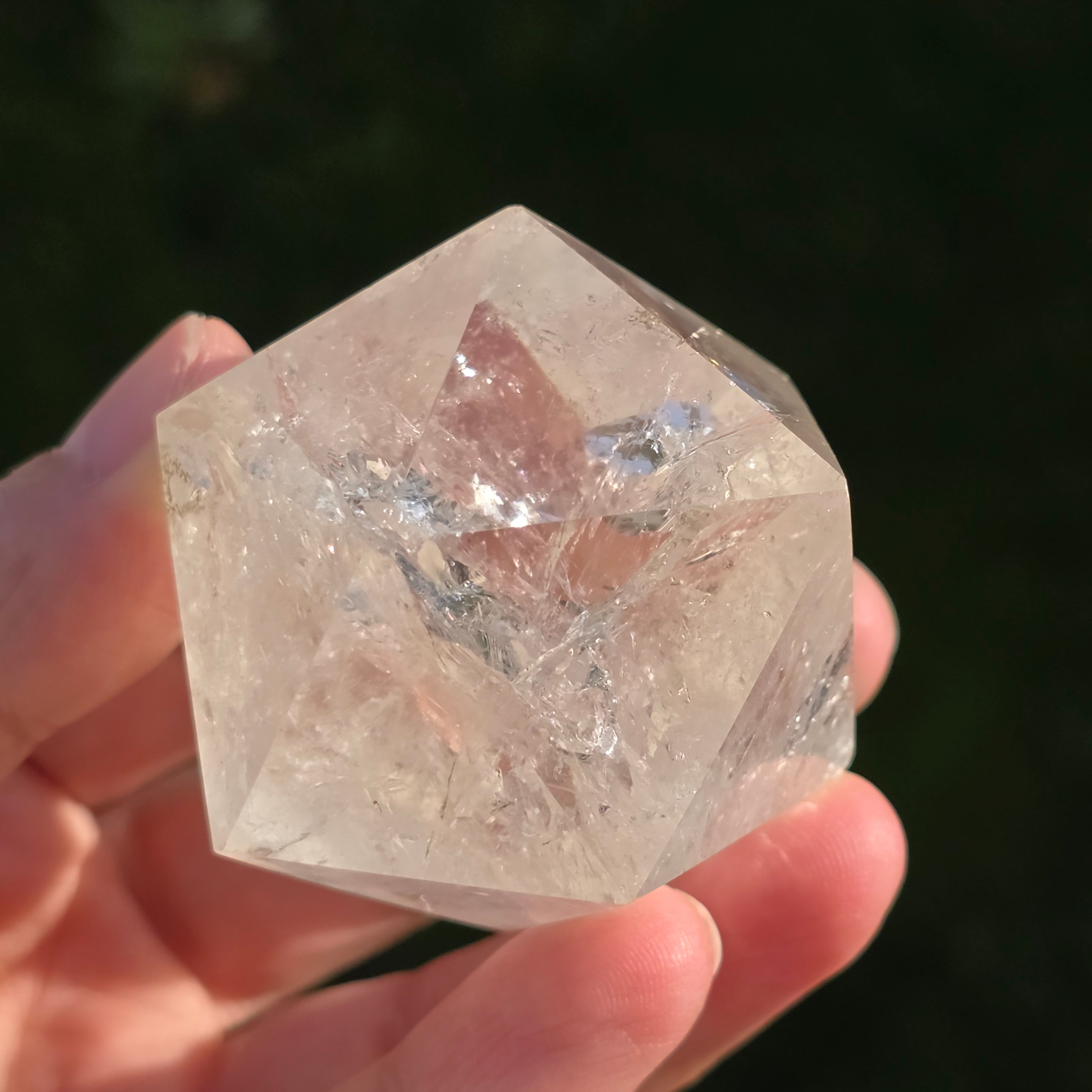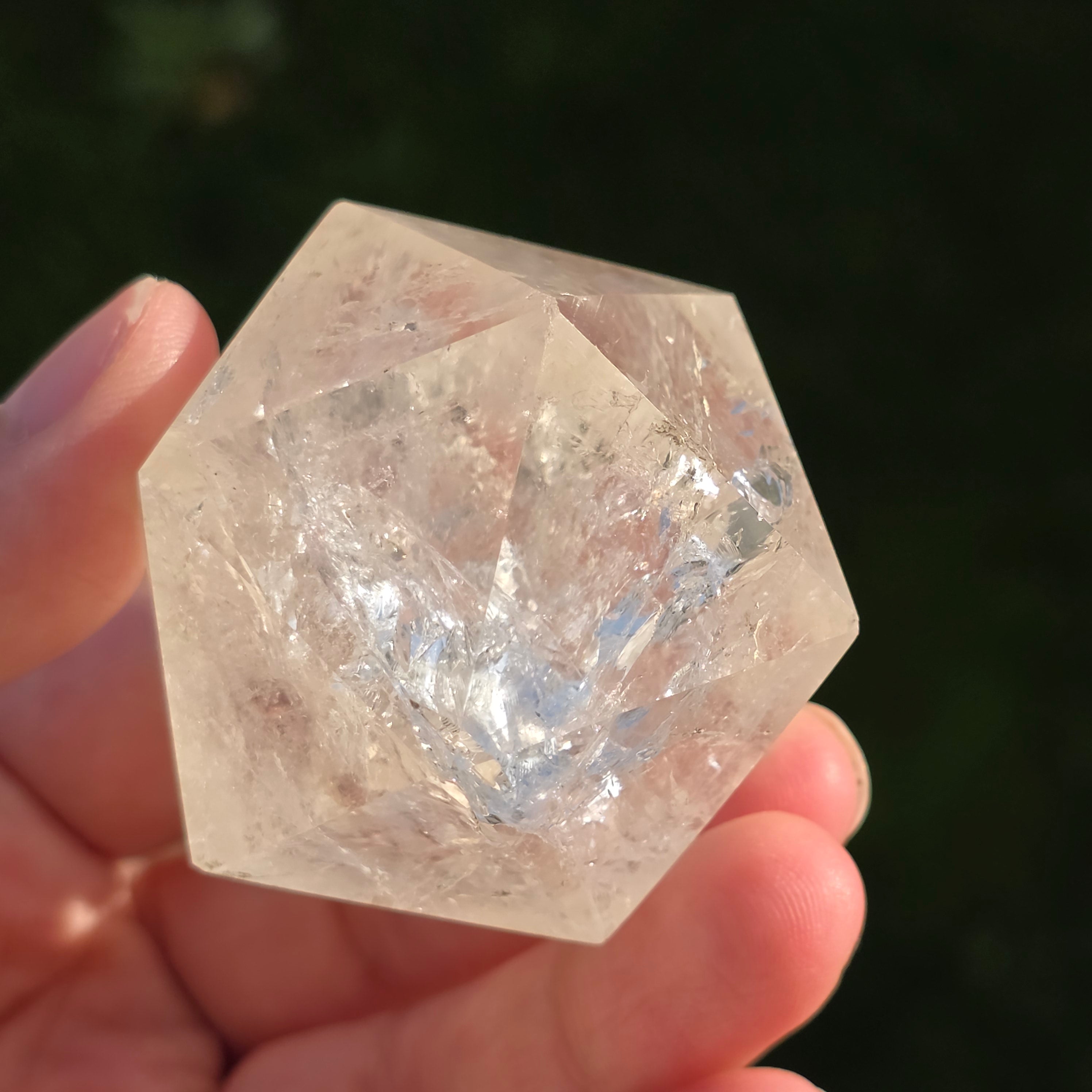 Икосаедър от безцветен кварц (планински кристал), ръчно прецизно шлифован във формата на платоническо тяло с 20 равностранни триъгълни лица.