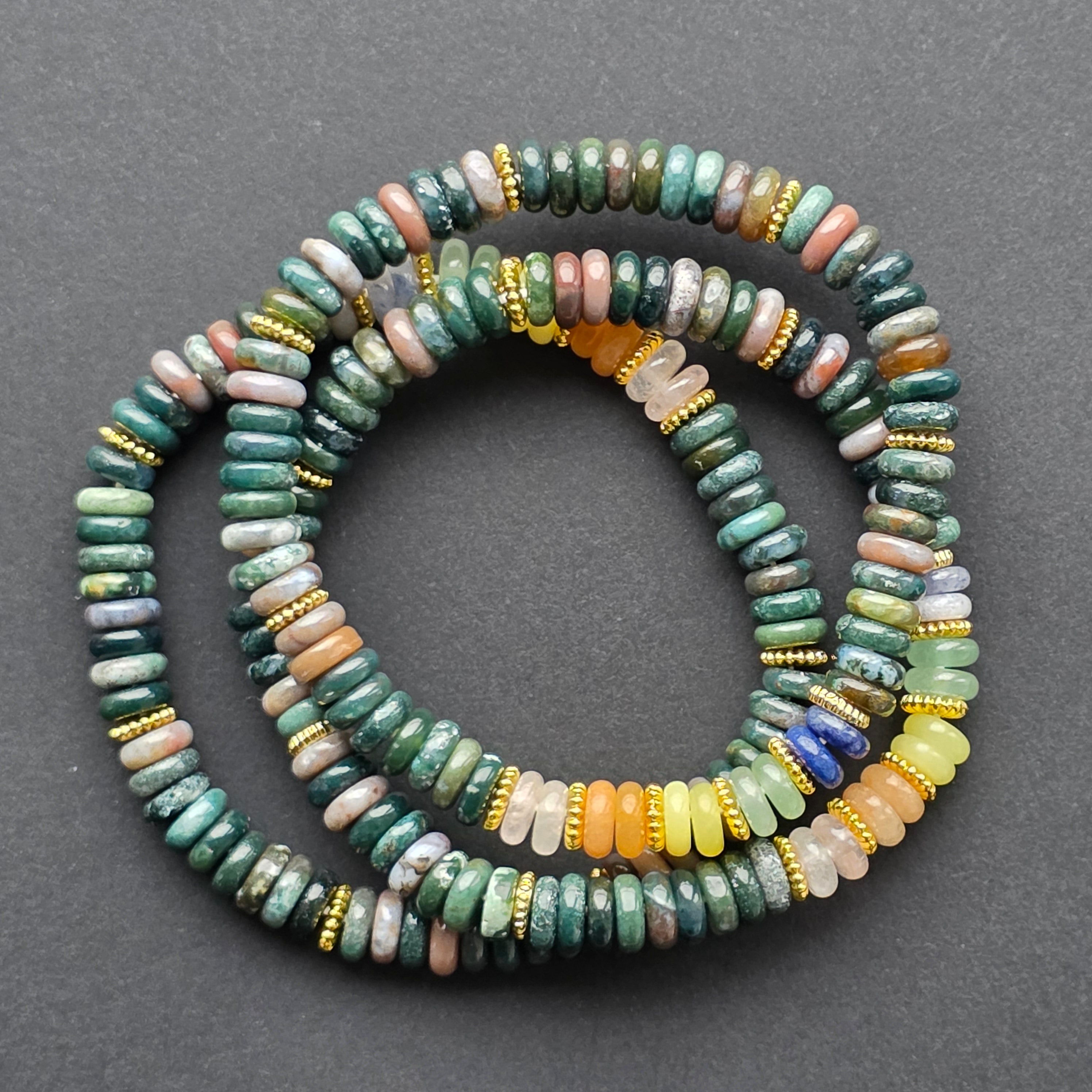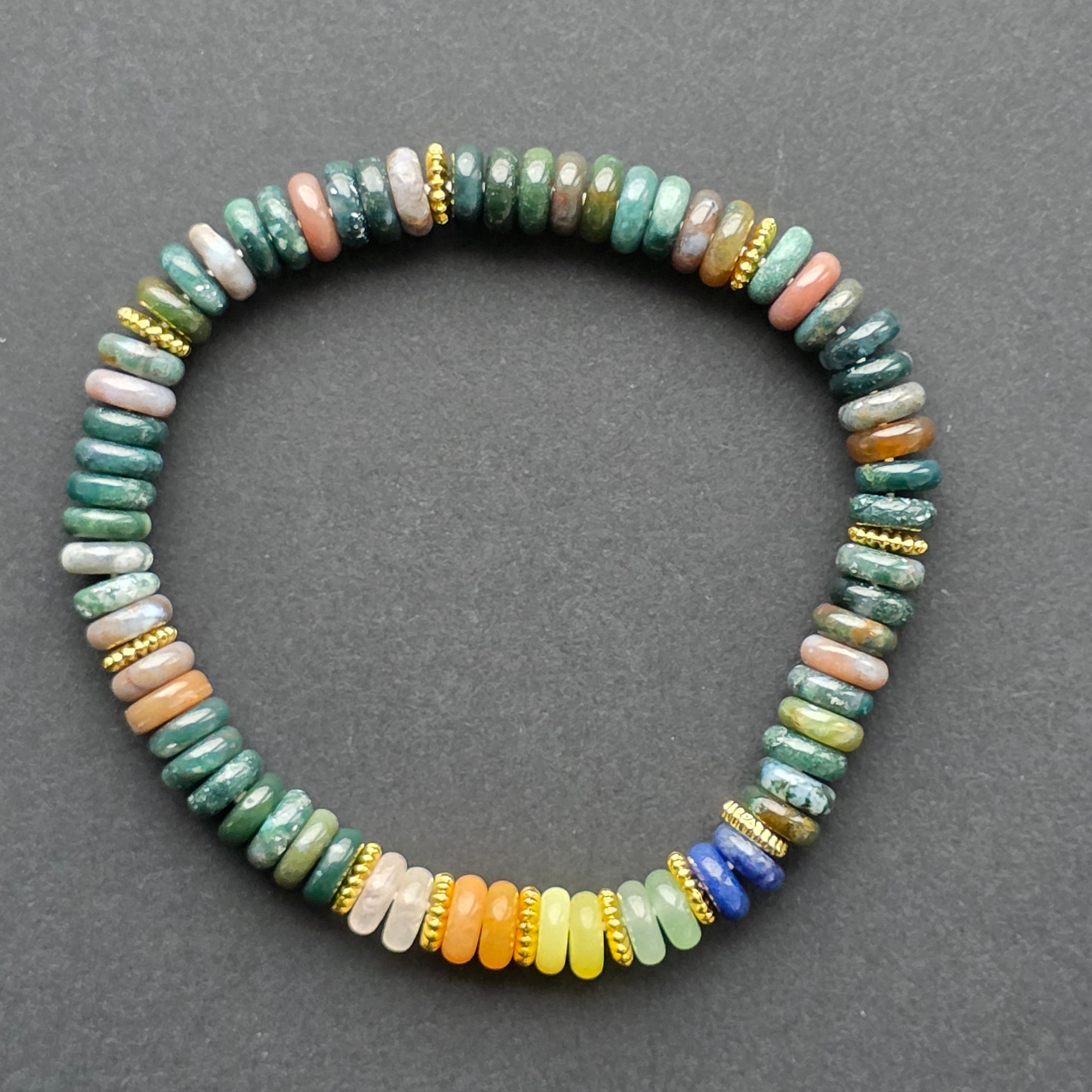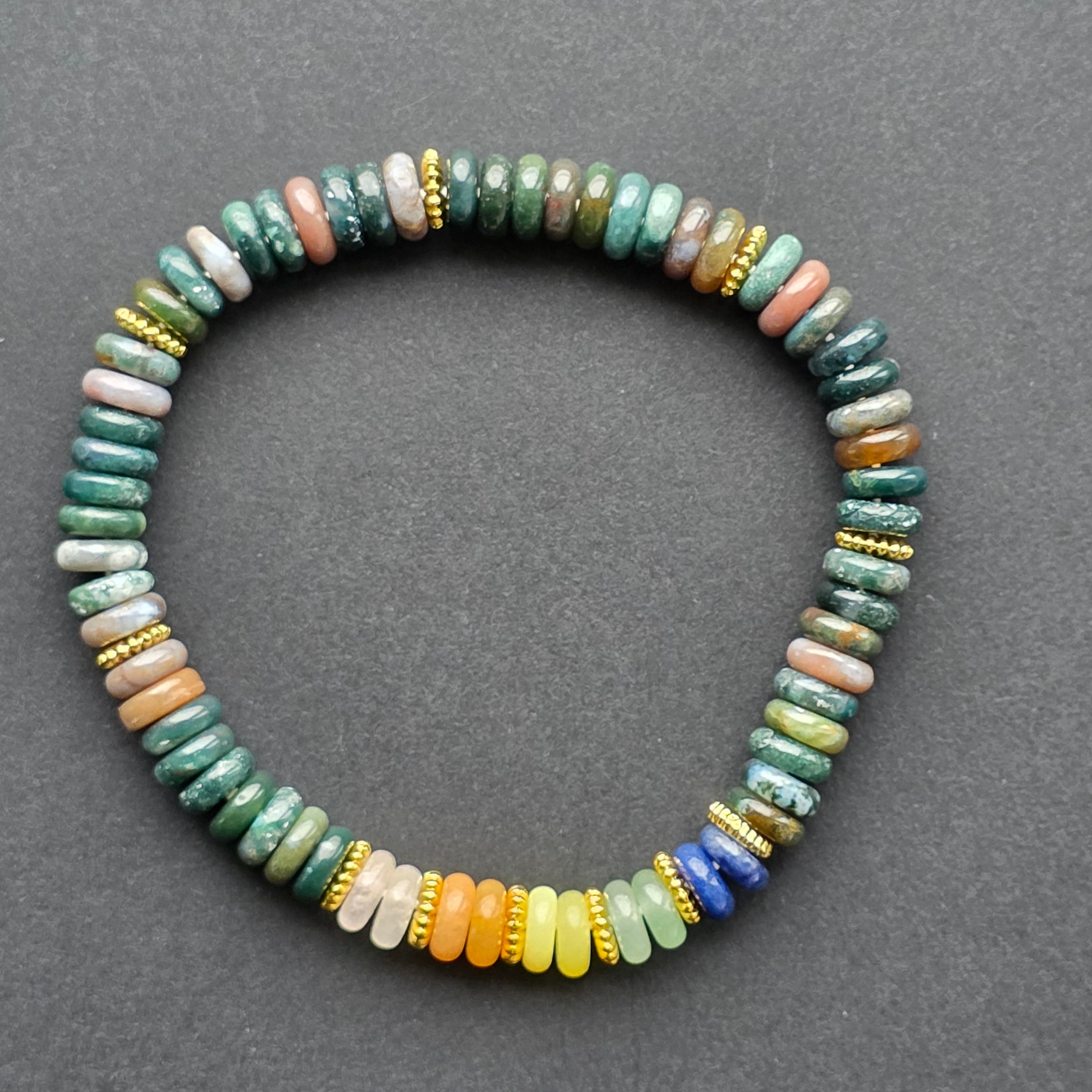 Индийският ахат е известен със своето хроматично разнообразие - органично преплитане на наситени зелени, земни кафяви и фини сиви тонове, всички разположени в естествени слоеве, точно като вътрешността на камък, образуван в продължение на милиони години. Всеки диск запазва уникалния отпечатък на минерала и тази фина променливост превръща гривната в част със собствена индивидуалност.
