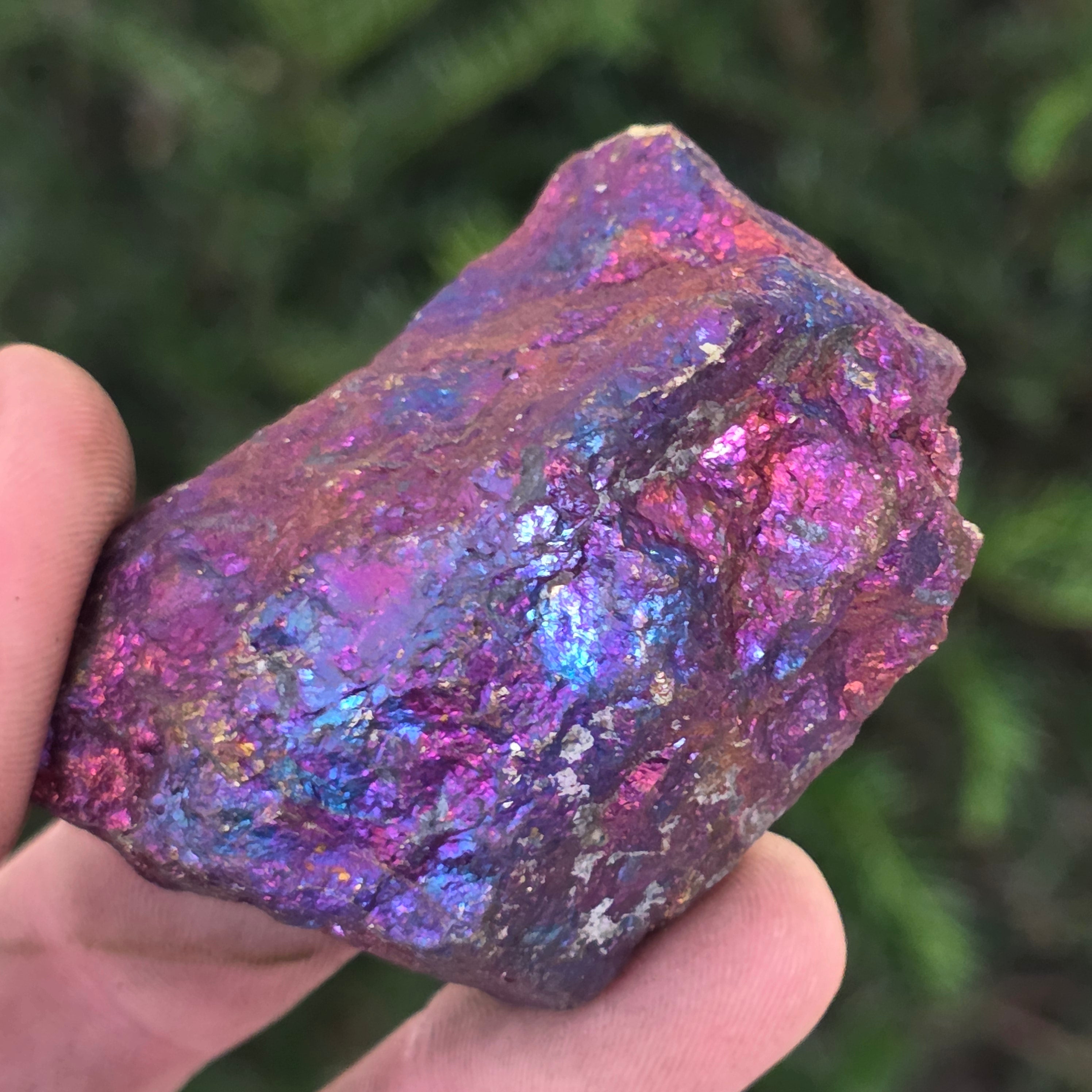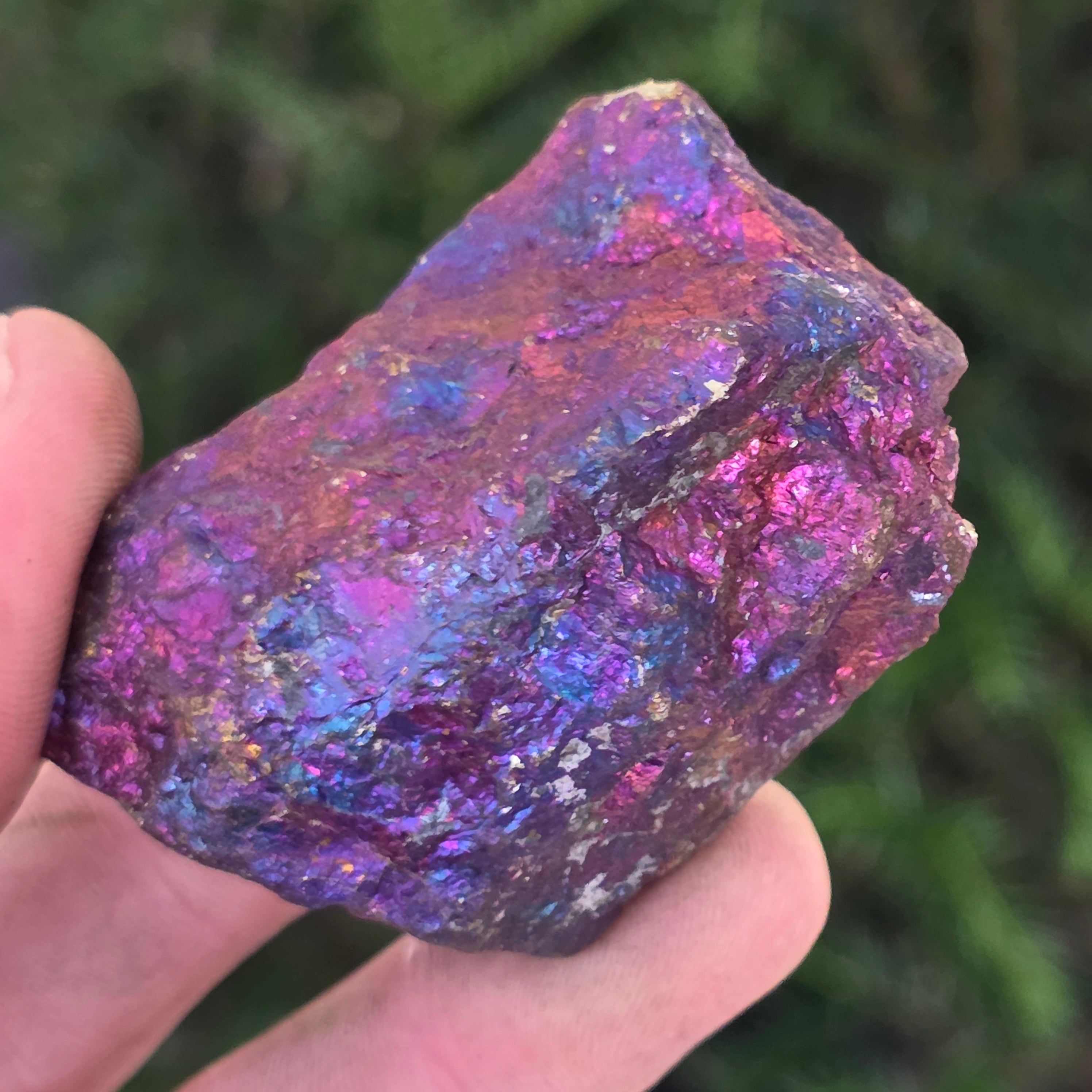 Синята калкопирит, известна също като иридесцентна калкопирите вид калкопирит, който проявява блестящи оттенъци на синьо, лилаво, зелено или други иризиращи цветове. Тази иризация се причинява от тънък слой окисляване на повърхността на минерала, естествен процес, който се случва, когато калкопиритът е изложен на въздух и влага за дълго време.