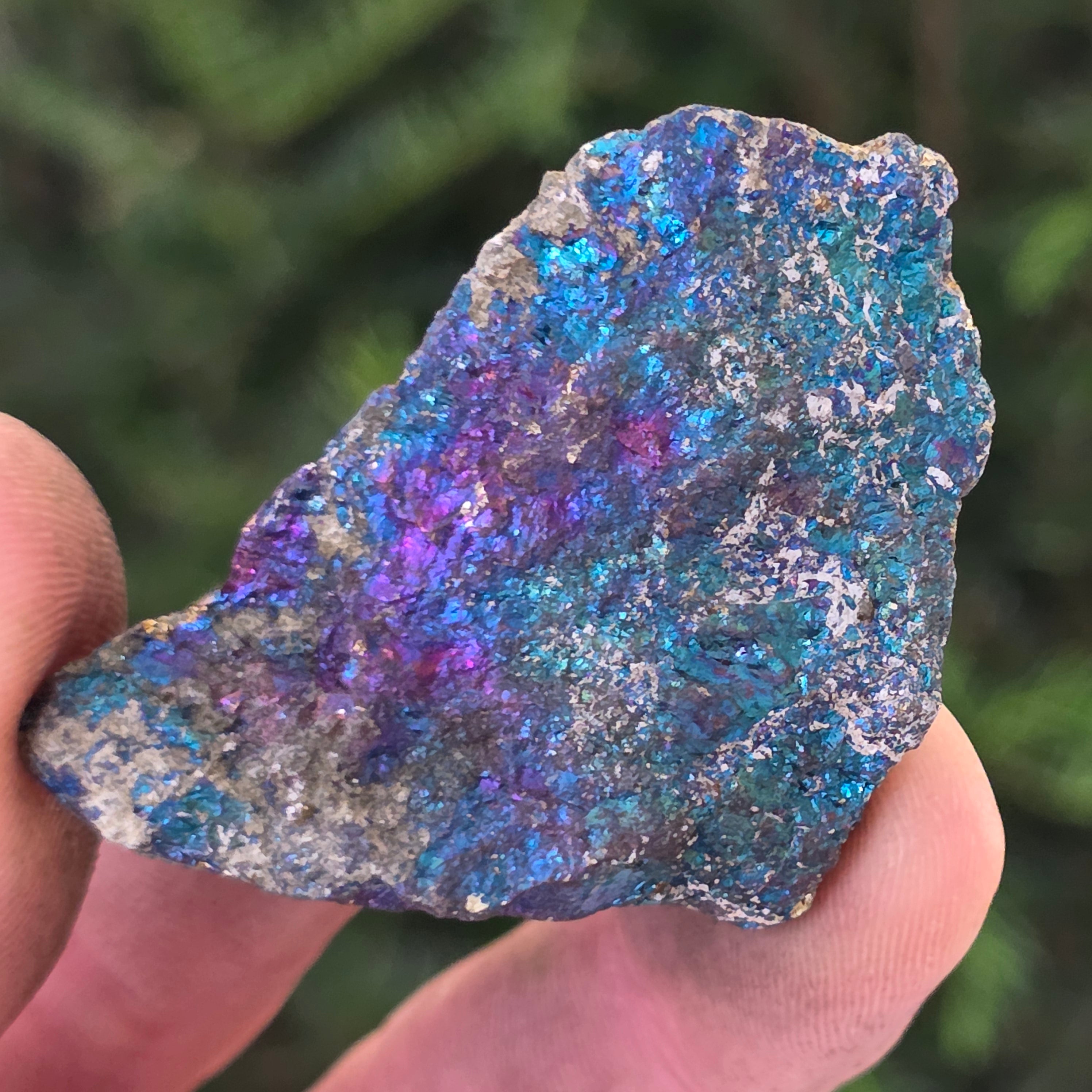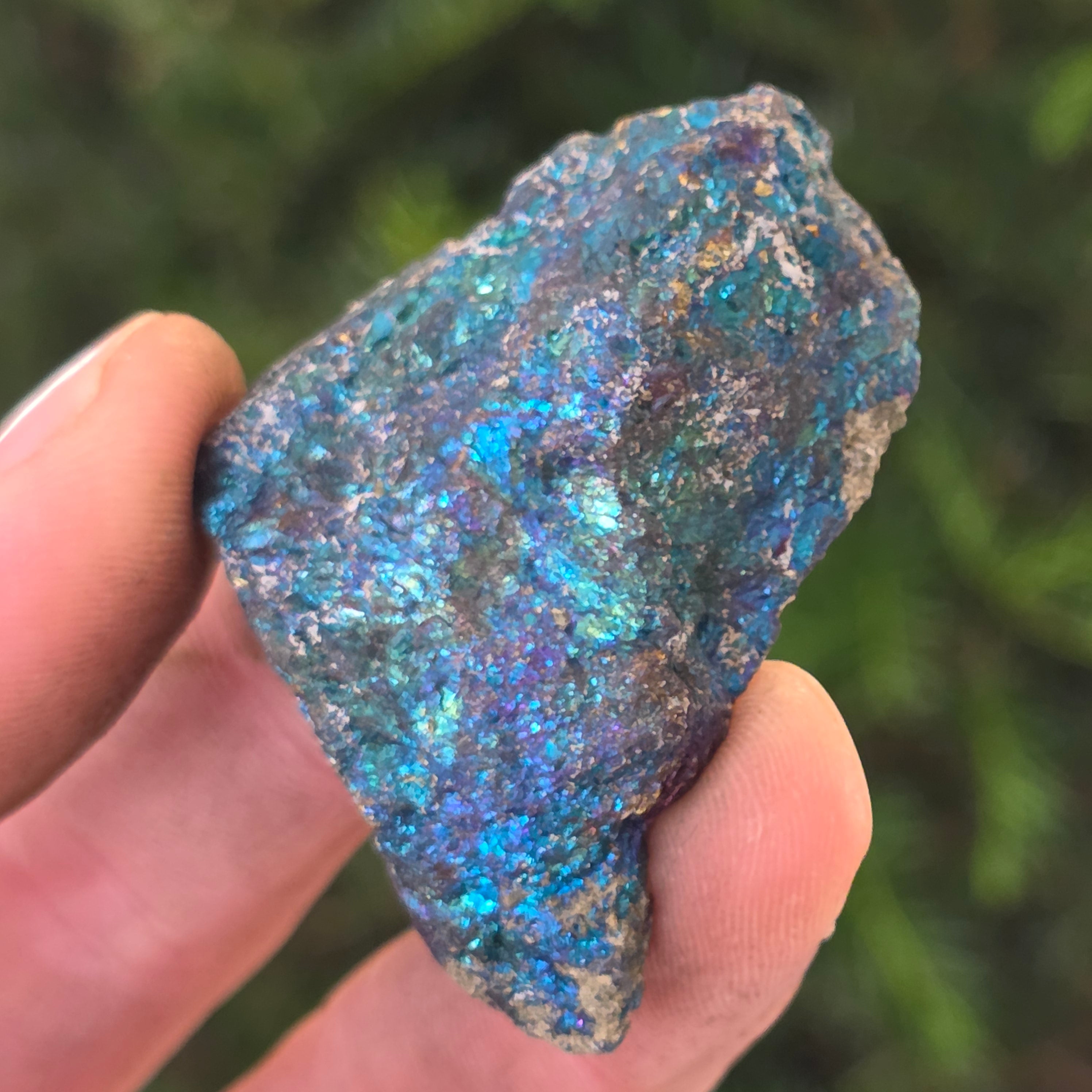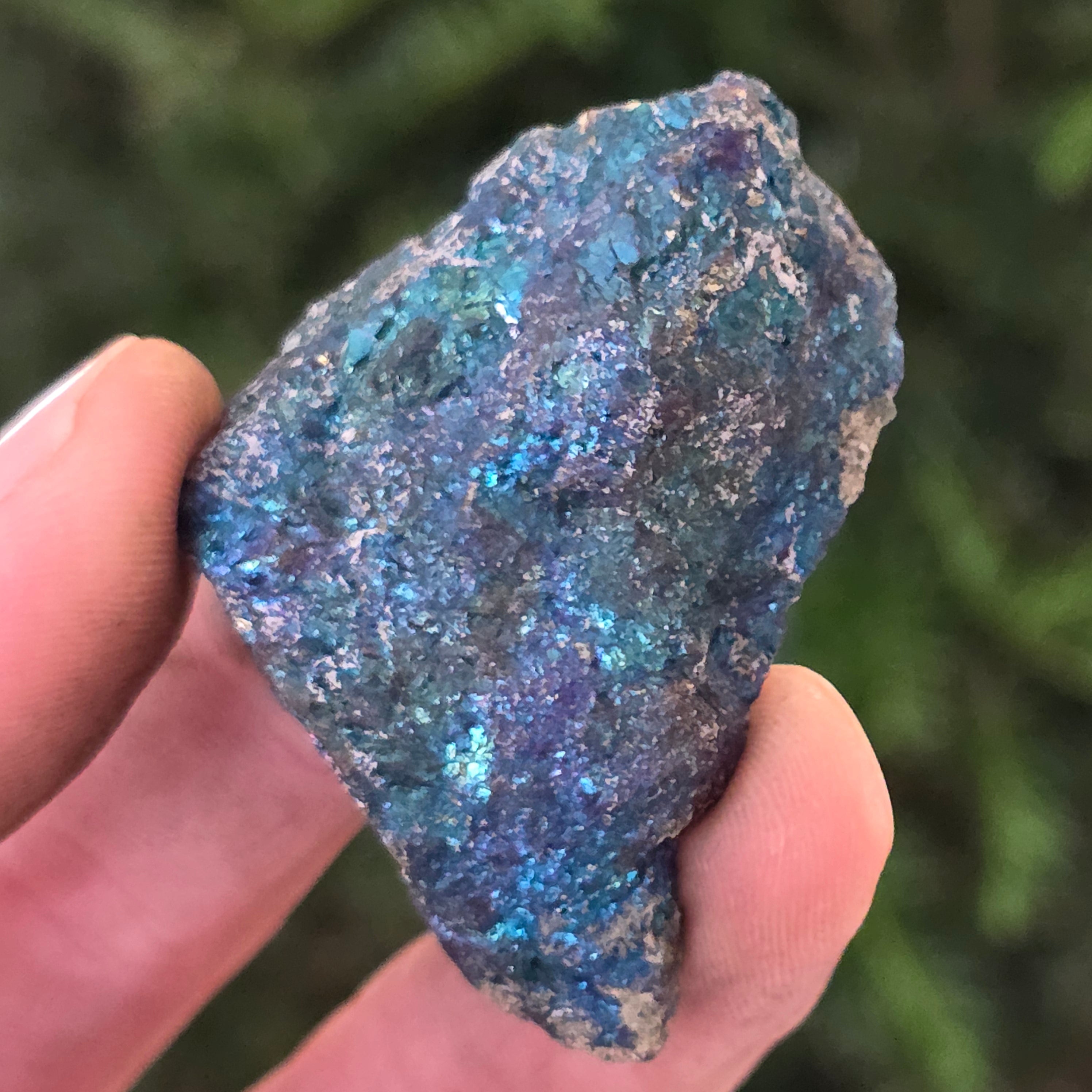 Синята халькопирит, известна още като иридесцентна халькопирите вид халькопирит, който показва блестящи нюанси на синьо, лилаво, зелено или други иризиращи цветове. Тази иризация се причинява от тънък слой окисляване на повърхността на минерала, естествен процес, който се появява, когато халькопиритът е изложен на въздух и влага за продължителен период.