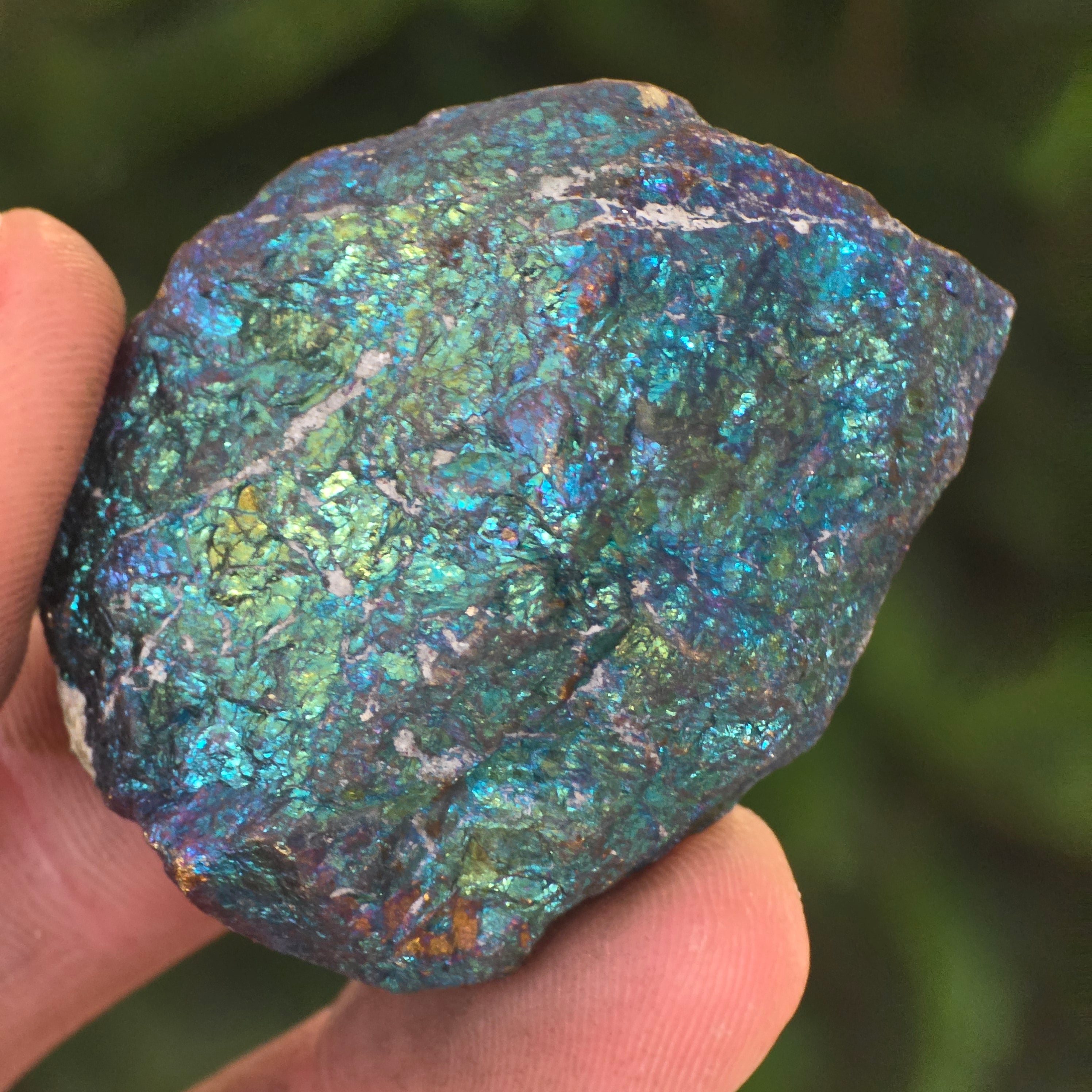 Синята халкопирит, известна също като иридисцентен халкопирит, е вид халкопирит, който проявява блестящи нюанси на синьо, лилаво, зелено или други ирисцентни цветове. Този ирисцентен ефект се причинява от тънък слой окисляване на повърхността на минерала, естествен процес, който се появява, когато халкопиритът е изложен на въздух и влага за продължителен период.