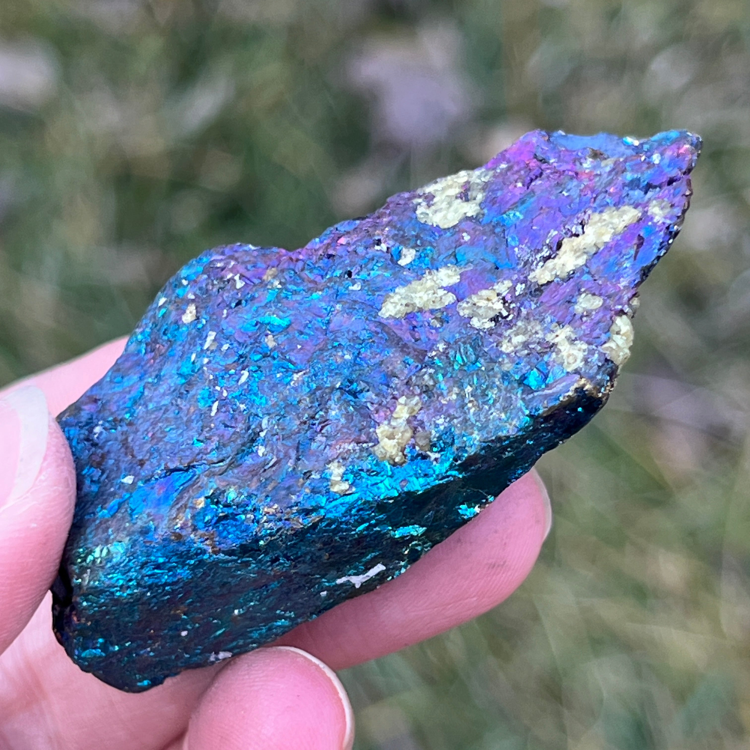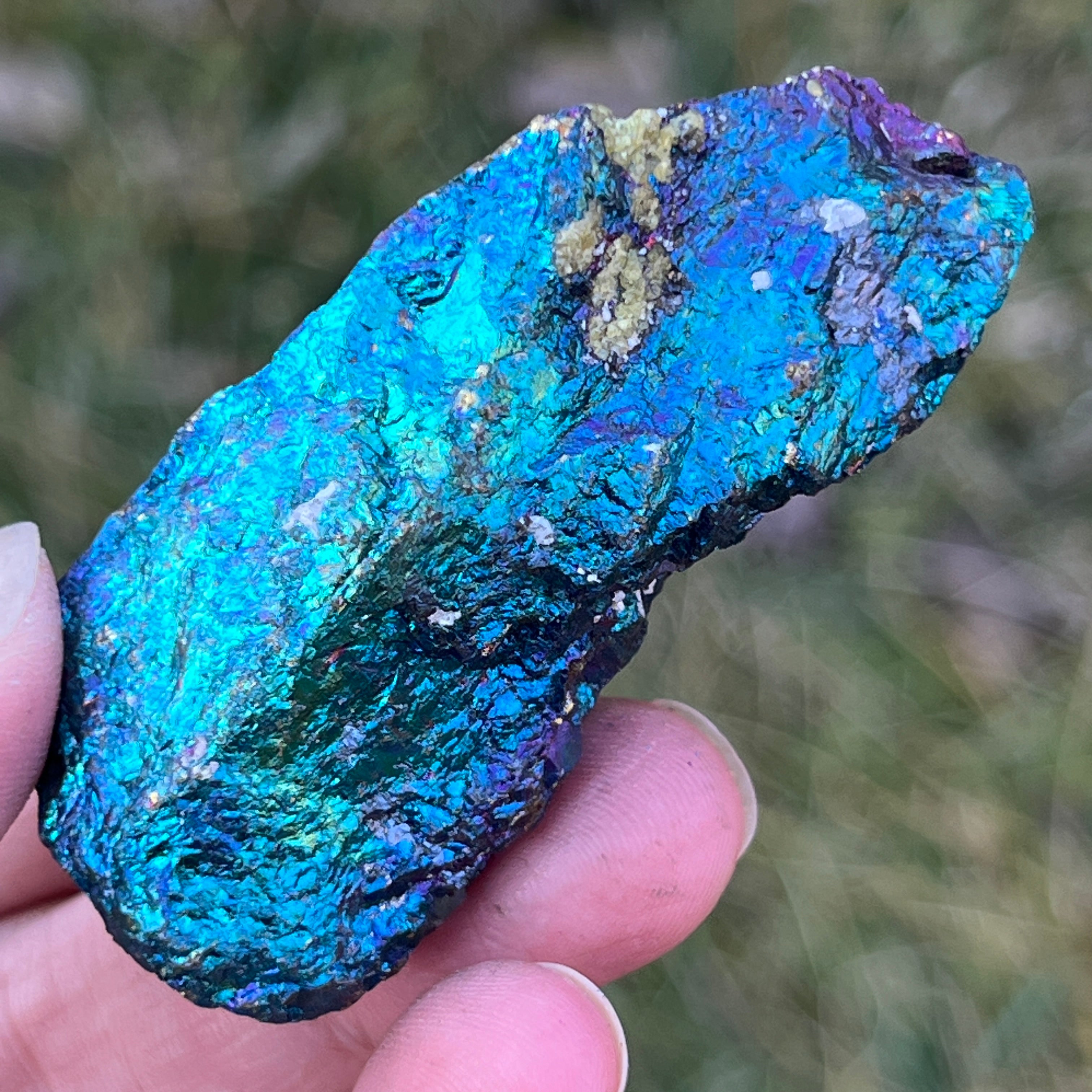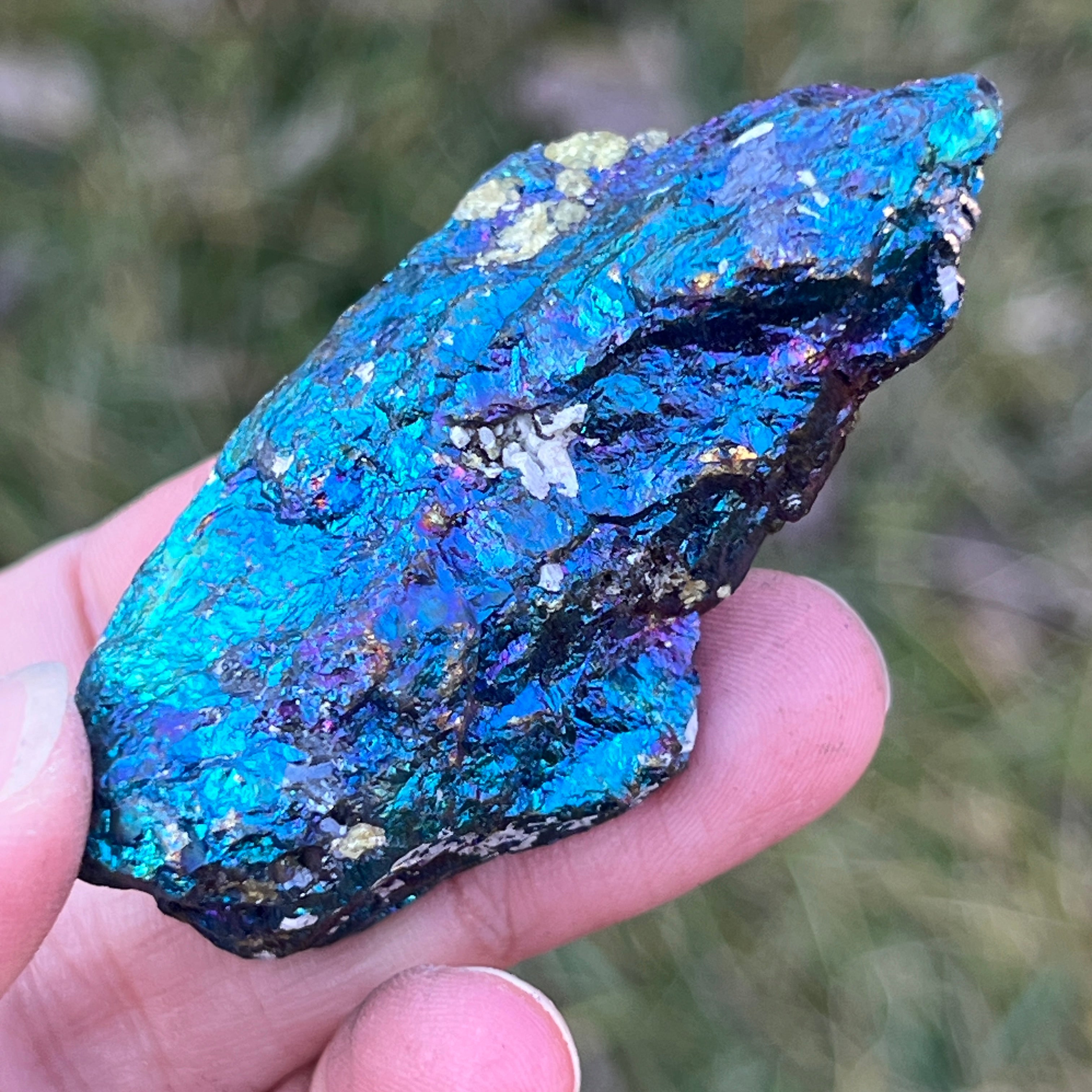 Синият и лилавият халкопирит се свързват с духовния растеж, интуицията и свързването с по-високи енергии. Смята се, че помагат за успокояване на ума и стимулиране на креативността. Иризираните им нюанси са символично свързани с баланс и хармония.