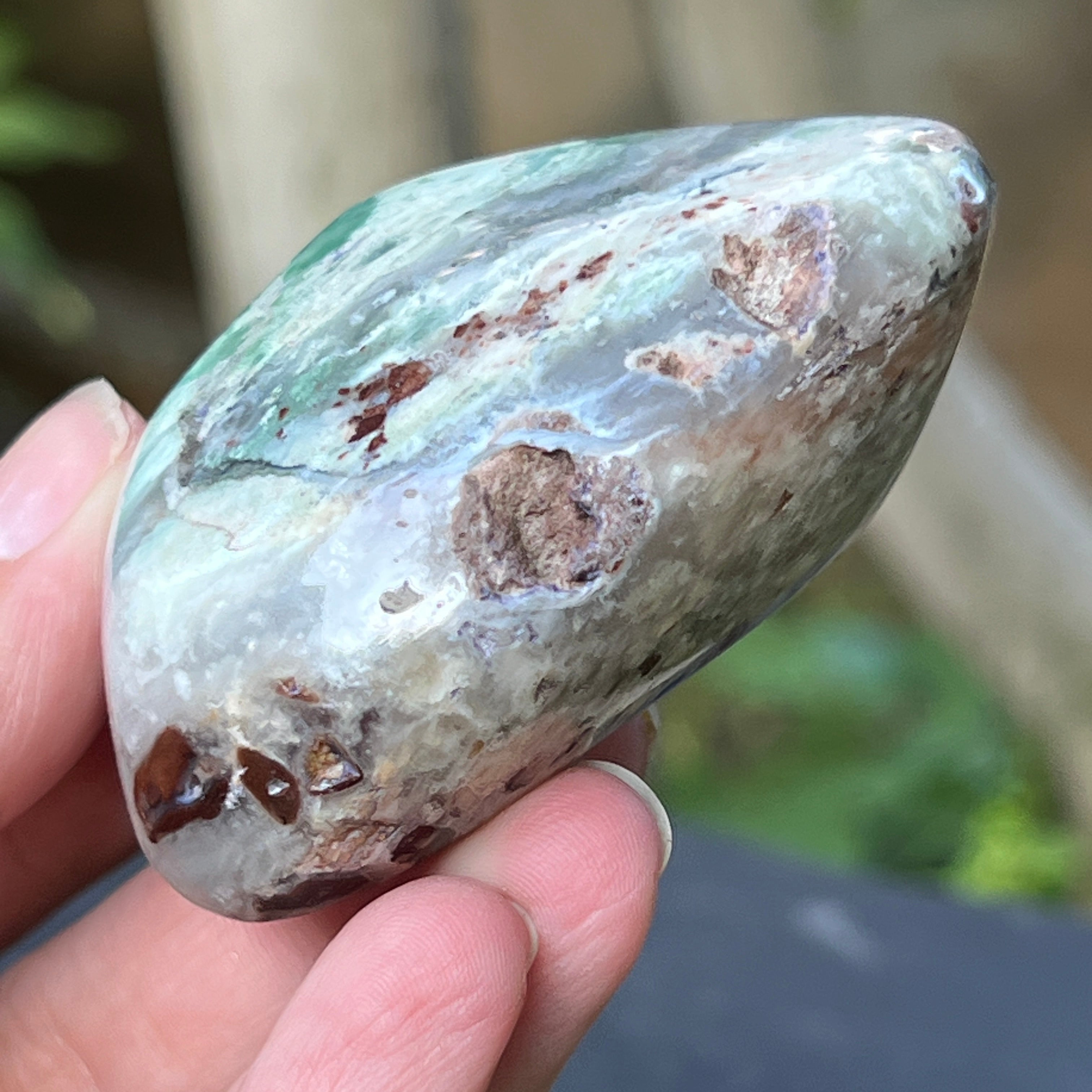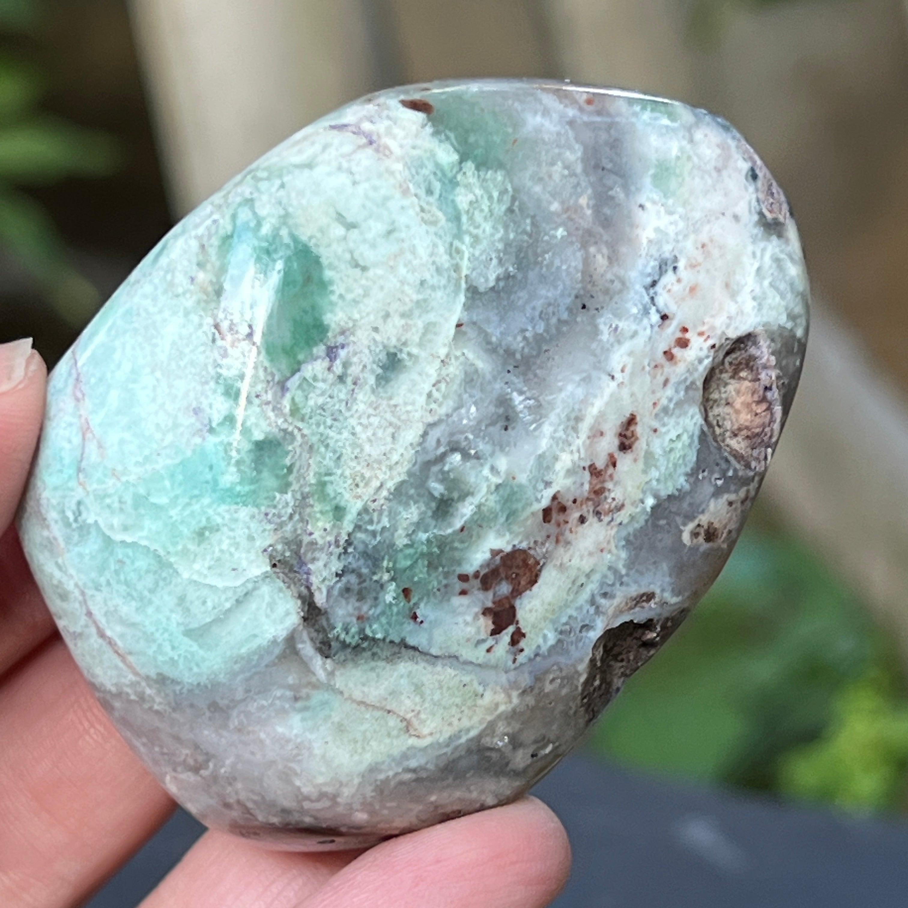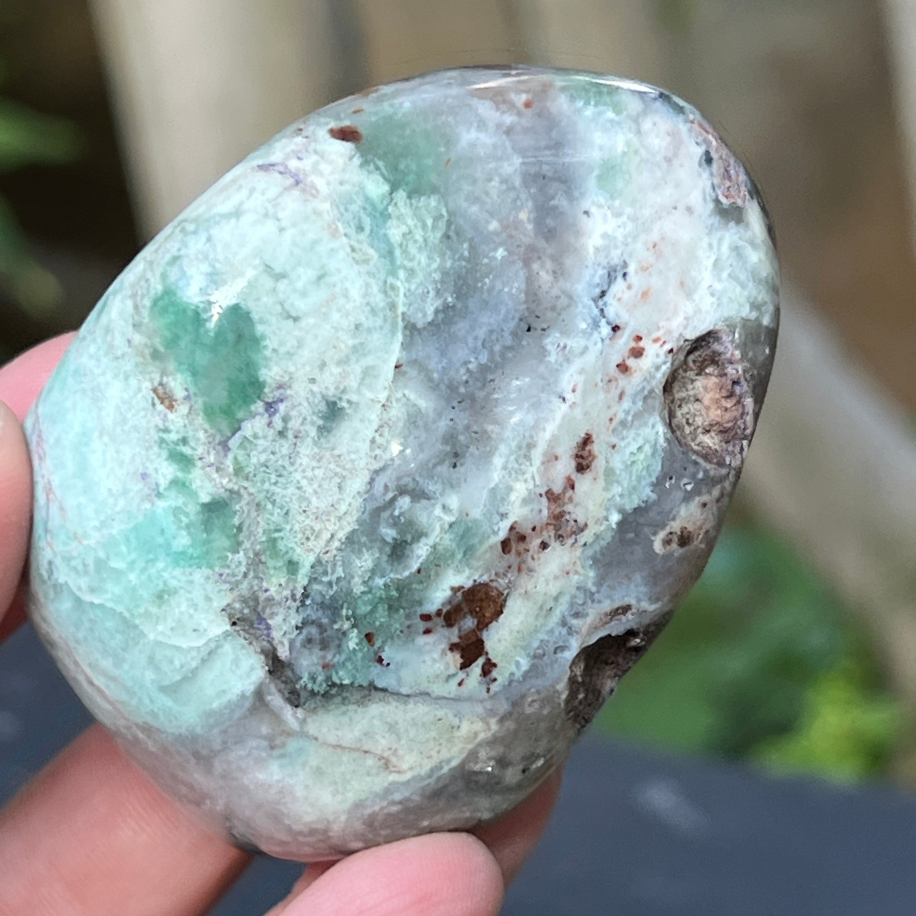 Това е естествена, неизменена форма на хромов калцедон – минерал, който е труден за намиране, добиван изключително в Зимбабве и ценен заради живия си цвят, който не произлиза от никел (както при хризопраз), а от хрома, който пулсира дълбоко в кристалната му структура. В тази специална разновидност, включванията на синьо и зелено създават завладяваща цветна игра с плавни преходи между полупрозрачно и непрозрачно, между плътно и ефирно.