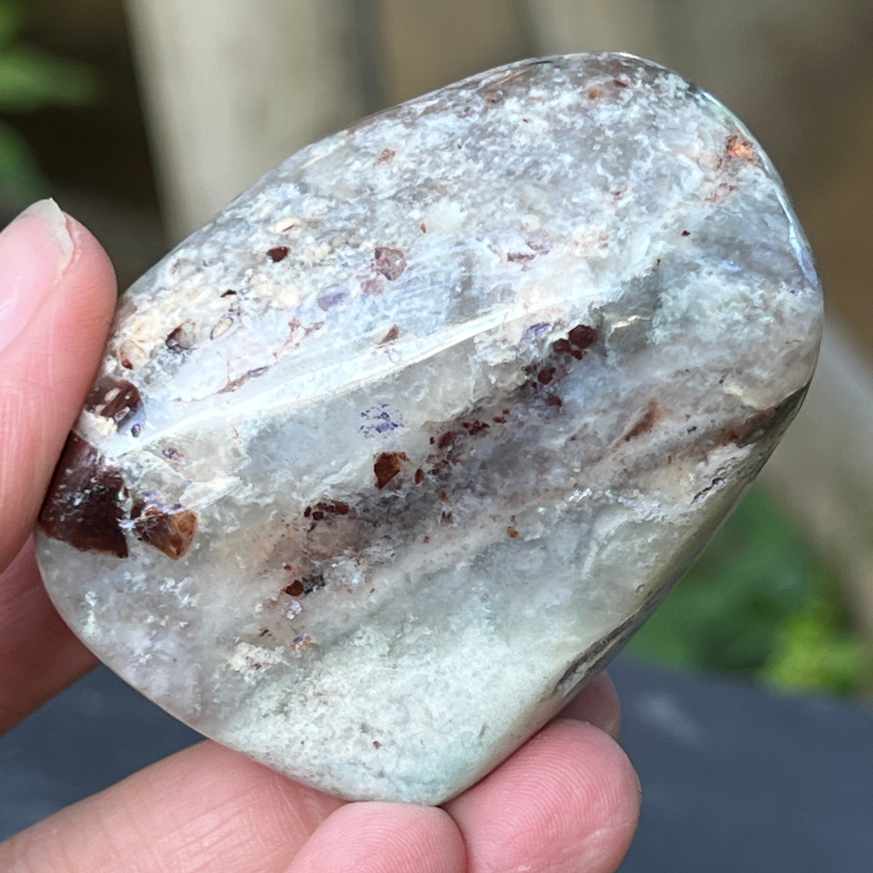 Неговата текстура е жива – с жилки от млечно халцедон, дискретни кварцови цепнатини и ръждиви петна от матрикс – всички свидетелства за бавно образуване в сложна и напрегната геоложка среда.