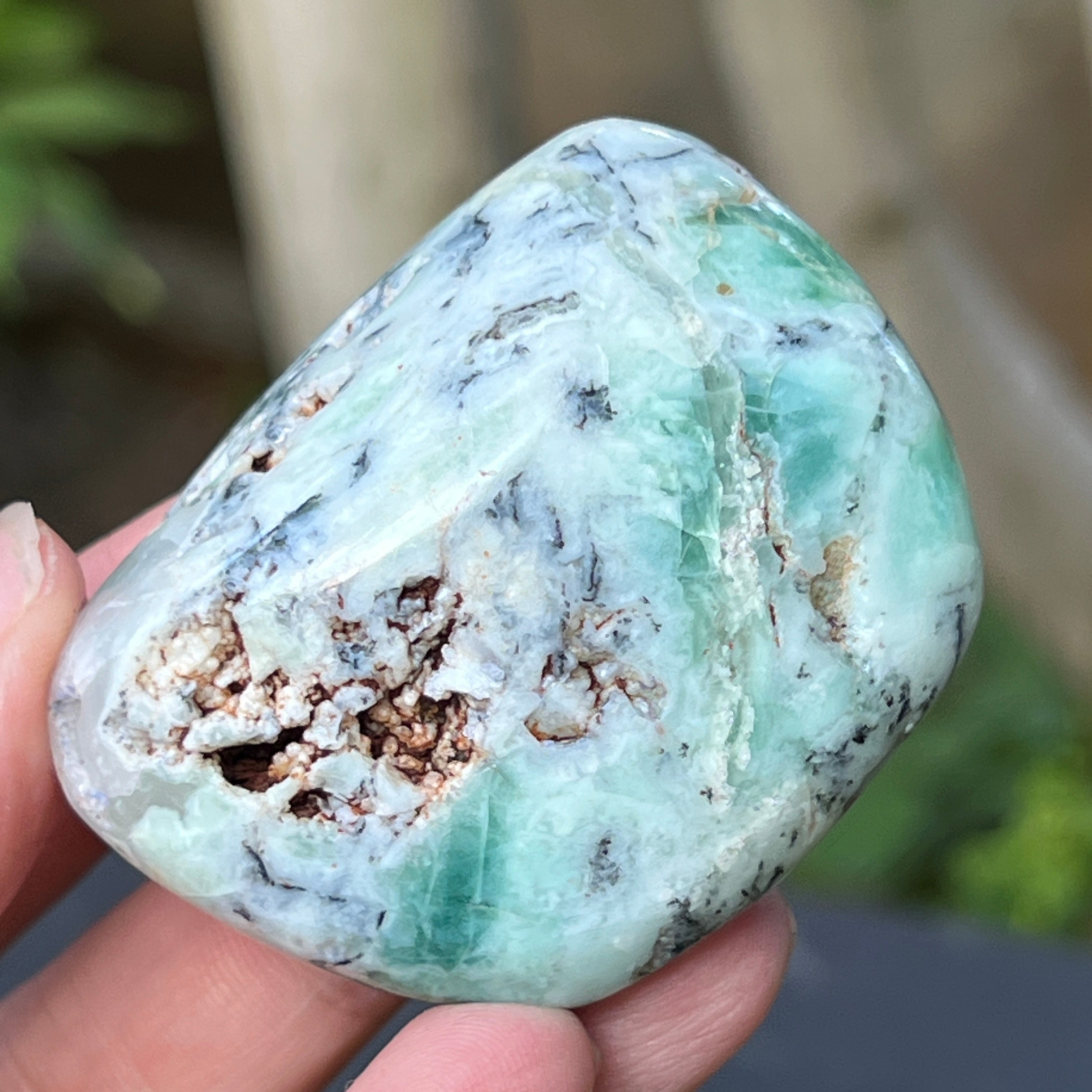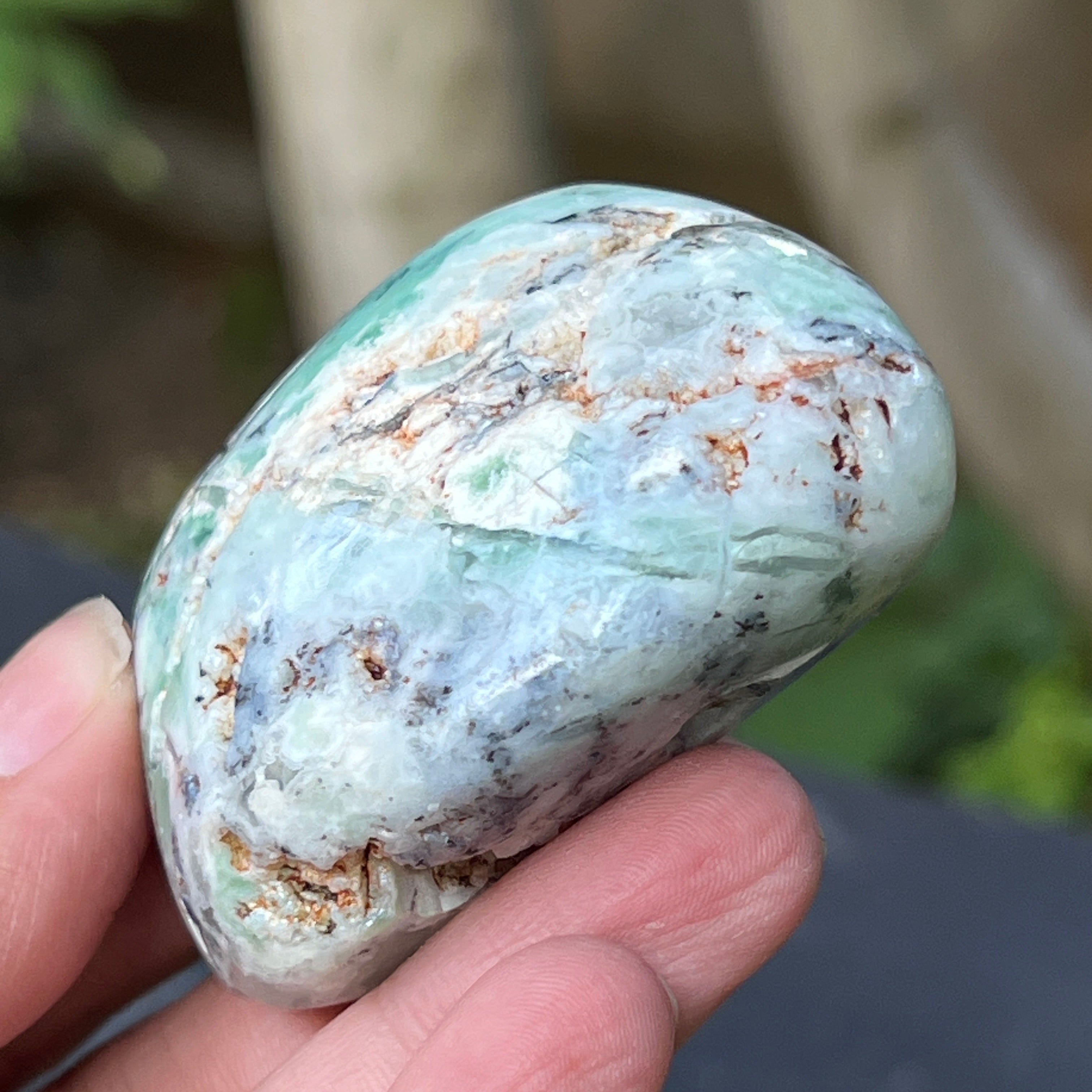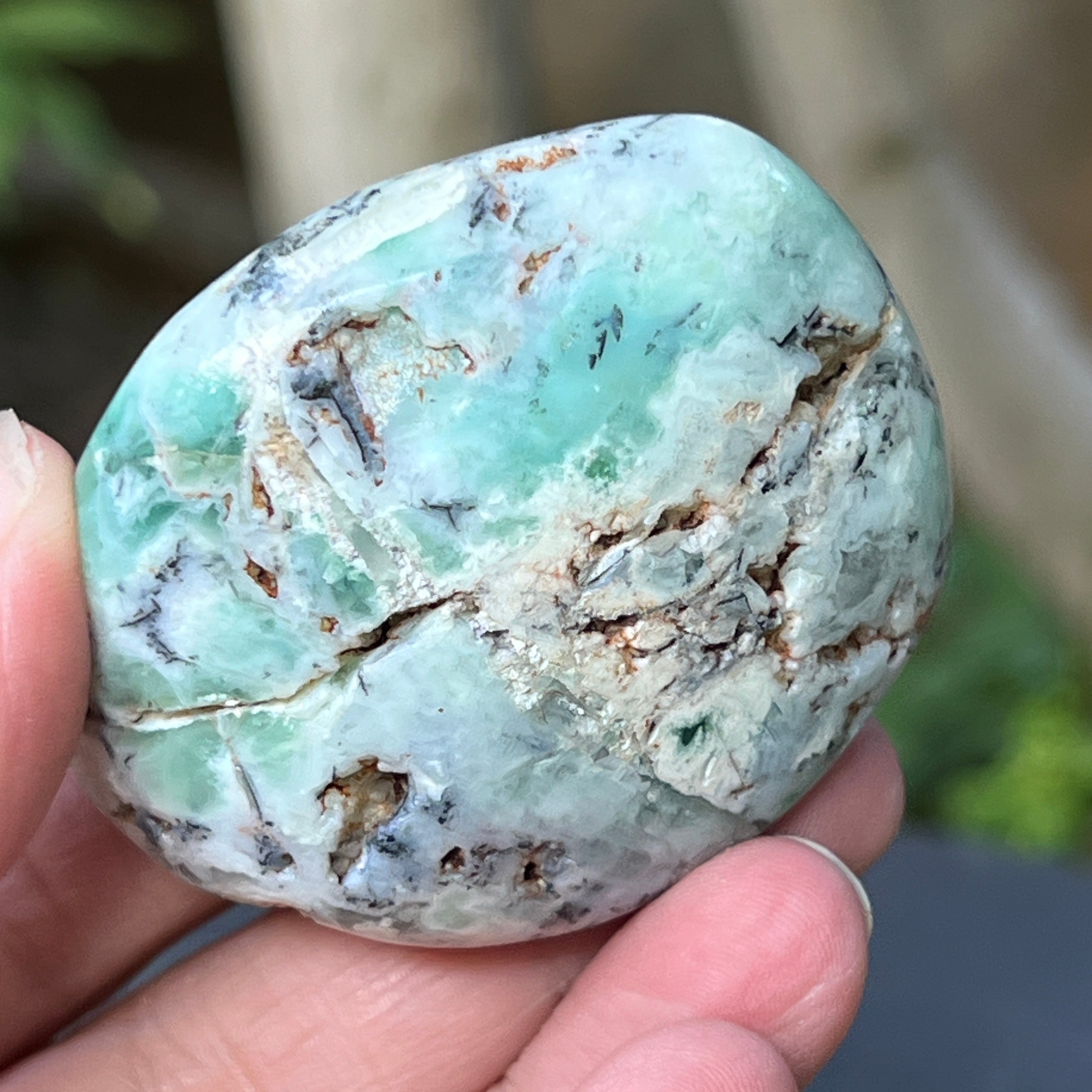 Това е естествена, неизменена форма на хромов калцедон – минерал, който е труден за намиране, добиван изключително в Зимбабве и ценен заради живия си цвят, който не произлиза от никел (както при хризопраз), а от хрома, който пулсира дълбоко в кристалната му структура. В тази специална разновидност, включванията на синьо и зелено създават завладяваща цветна игра с плавни преходи между полупрозрачно и непрозрачно, между плътно и ефирно.