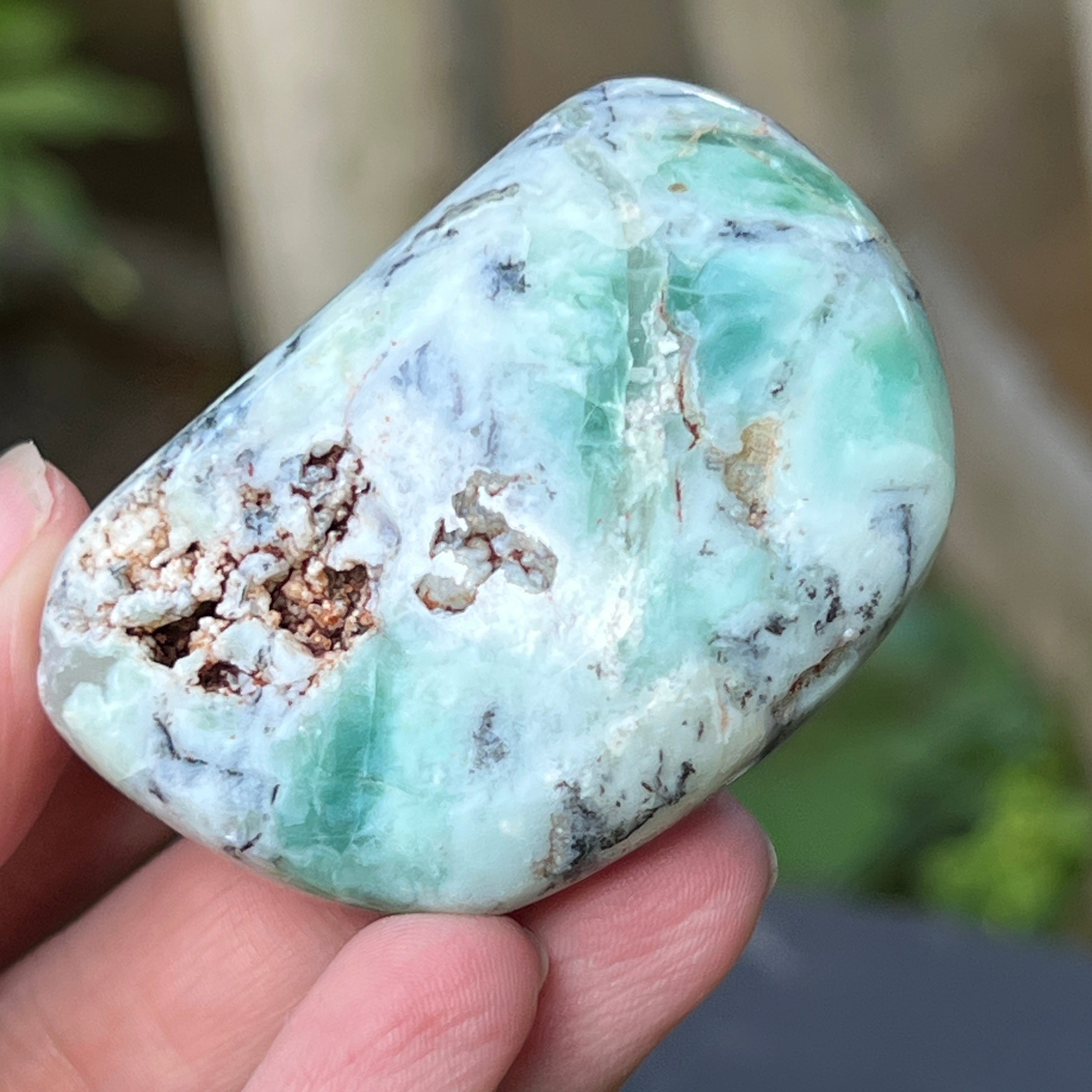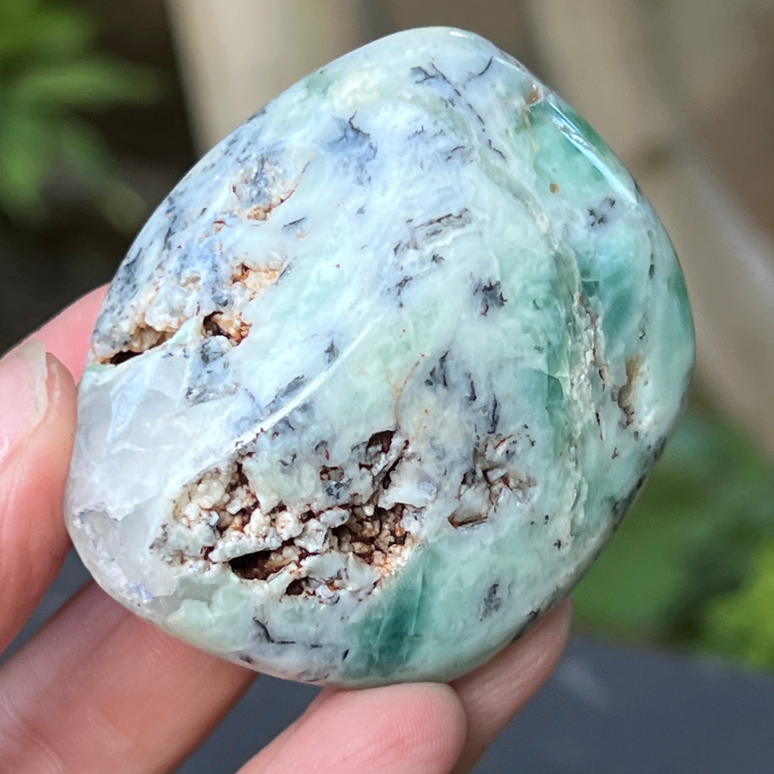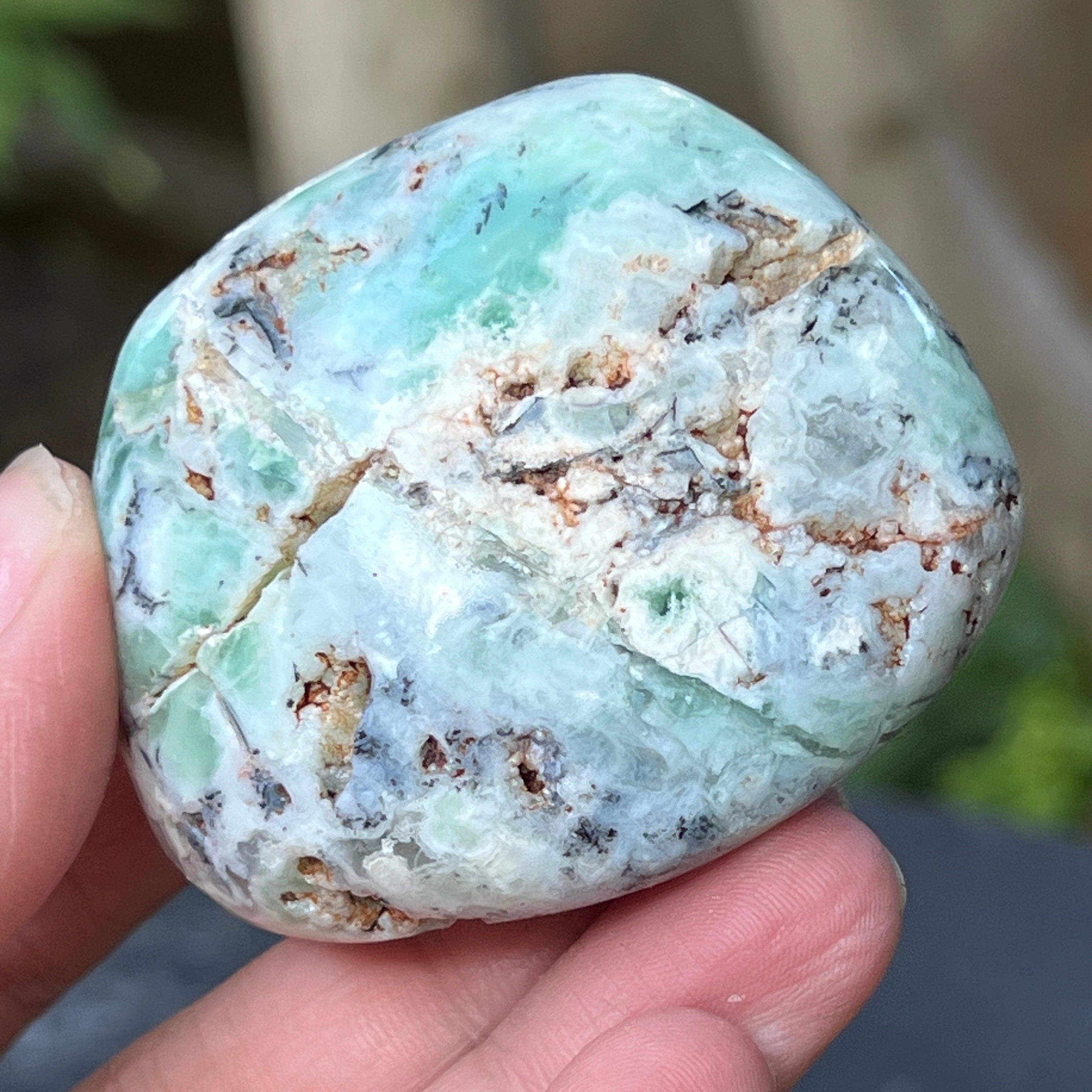 Това е естествена, неизменена форма на хромов калцедон – минерал, който е труден за намиране, добиван изключително в Зимбабве и ценен заради живия си цвят, който не произлиза от никел (както при хризопраз), а от хрома, който пулсира дълбоко в кристалната му структура. В тази специална разновидност, включванията на синьо и зелено създават завладяваща цветна игра с плавни преходи между полупрозрачно и непрозрачно, между плътно и ефирно.