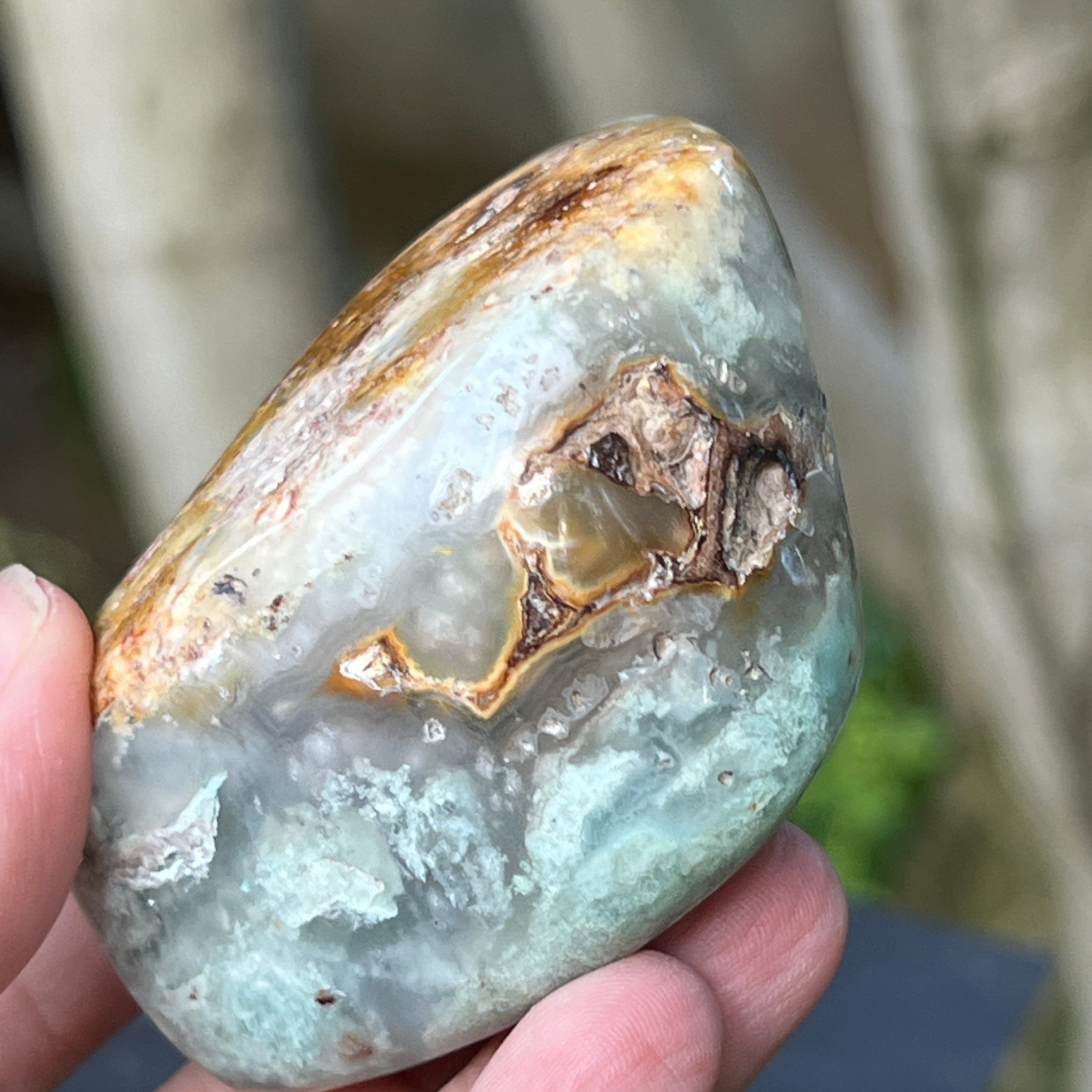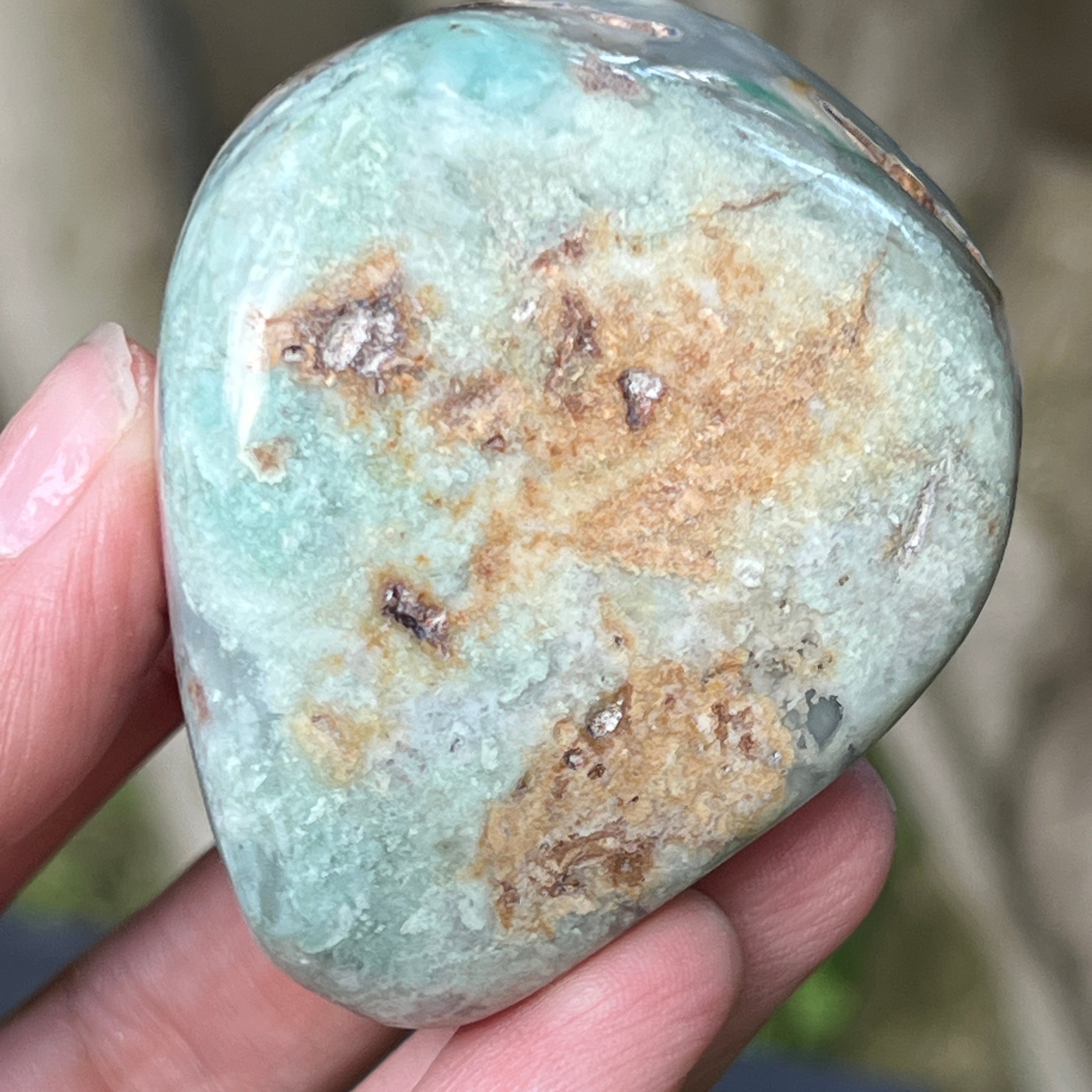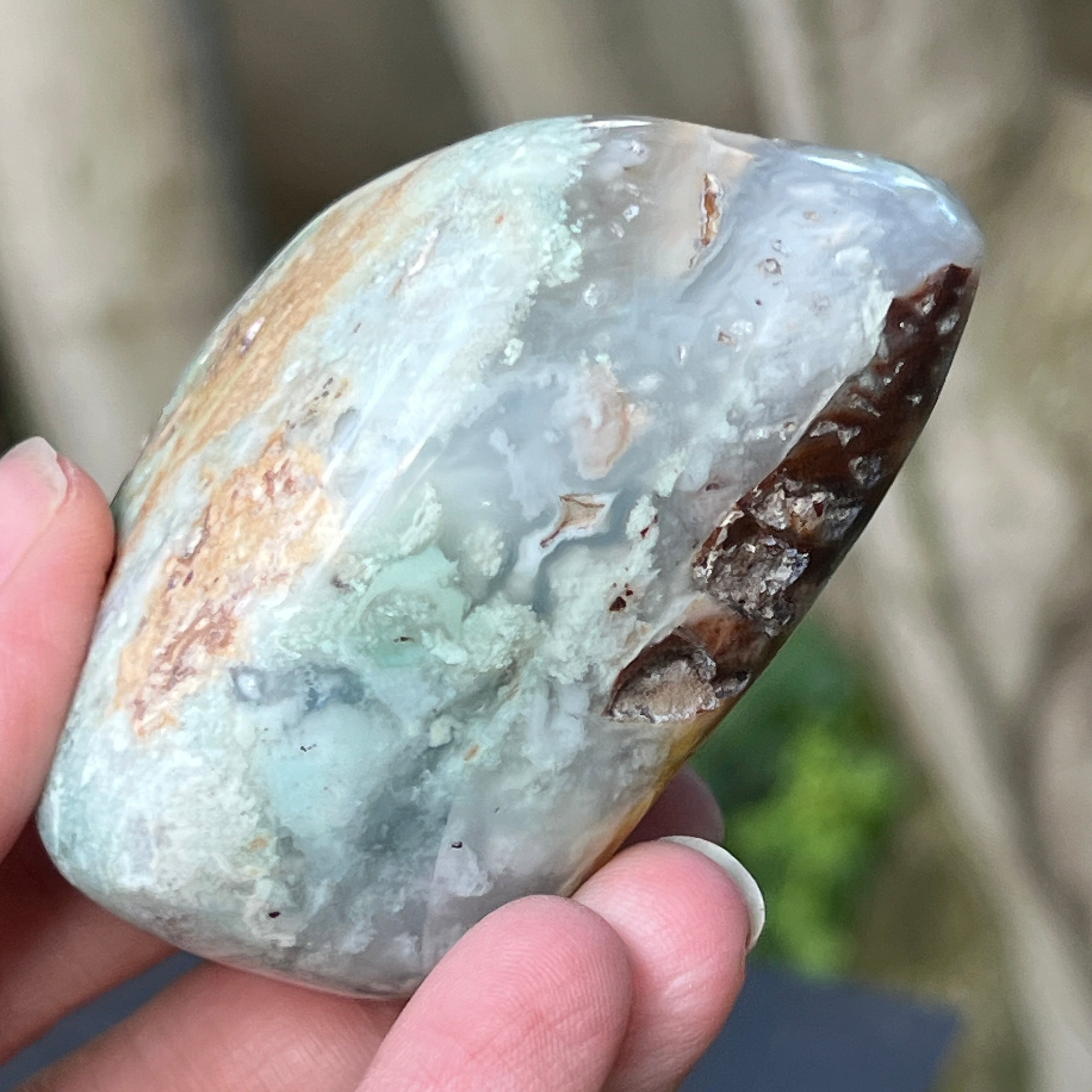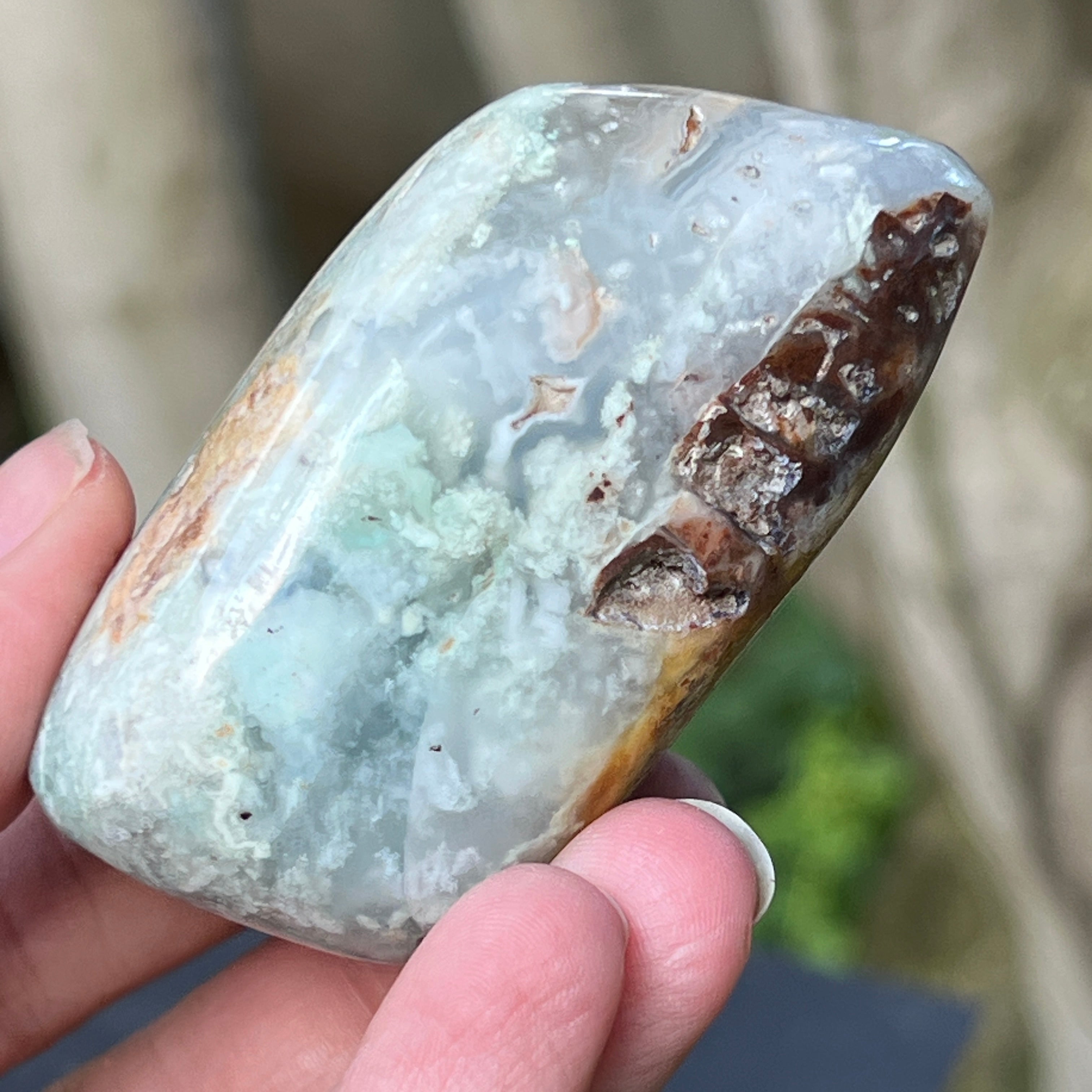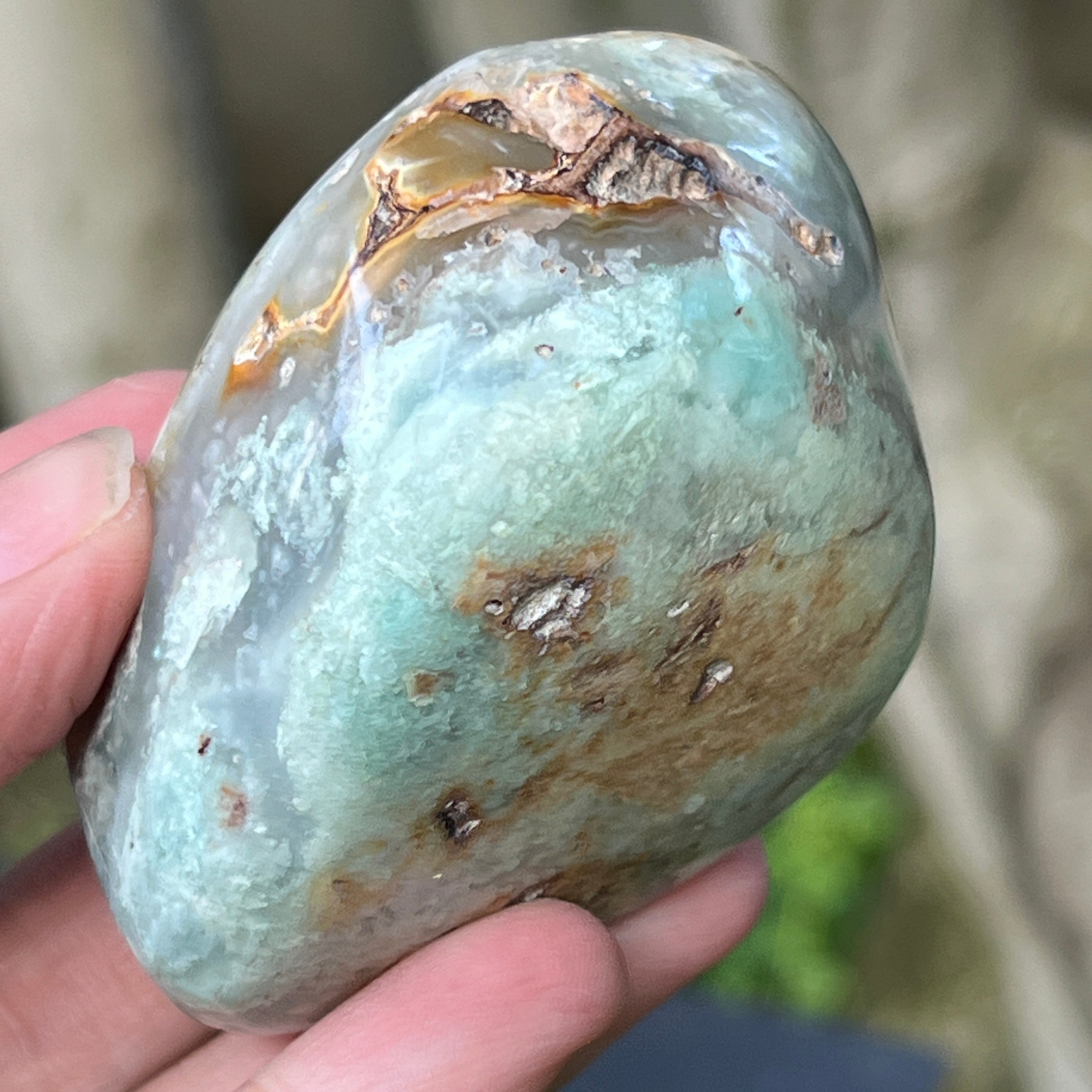 Това е естествена, неизменена форма на хромов калцедон – минерал, който е труден за намиране, добиван изключително в Зимбабве и ценен заради живия си цвят, който не произлиза от никел (както при хризопраз), а от хрома, който пулсира дълбоко в кристалната му структура. В тази специална разновидност, включванията на синьо и зелено създават завладяваща цветна игра с плавни преходи между полупрозрачно и непрозрачно, между плътно и ефирно.