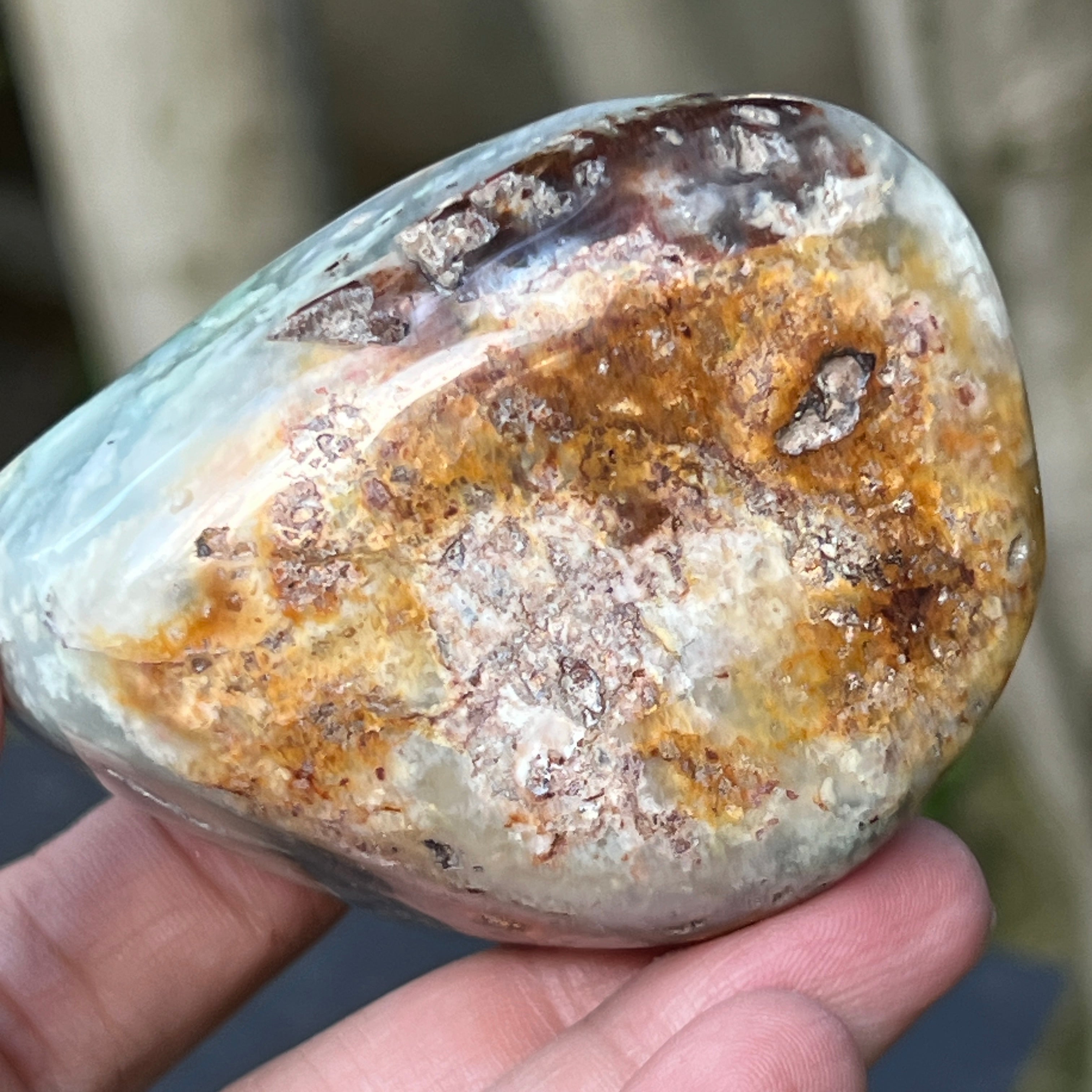Неговата текстура е жива – с жилки от млечно халцедон, дискретни кварцови цепнатини и ръждиви петна от матрикс – всички свидетелства за бавно образуване в сложна и напрегната геоложка среда.