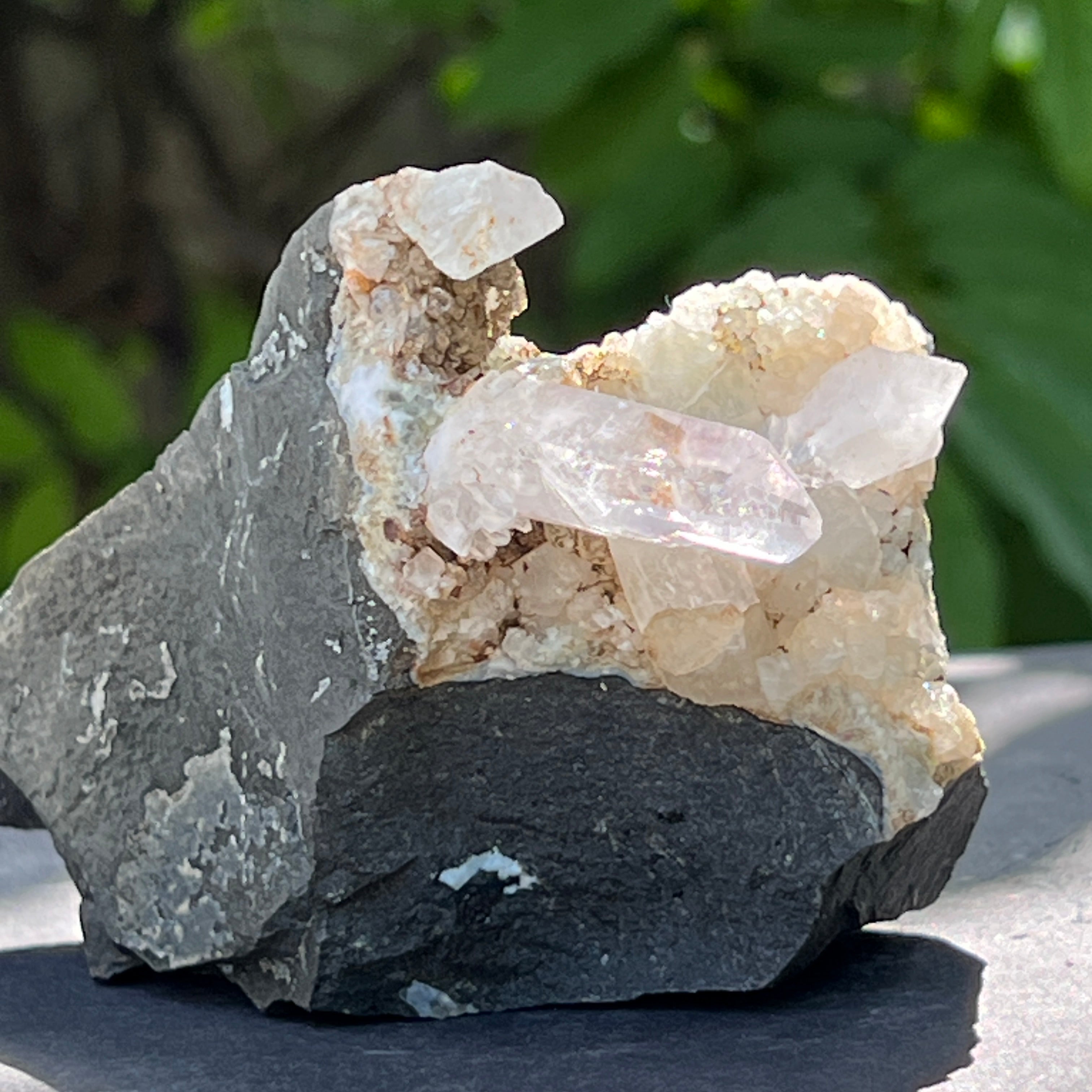 Кристализирайки в тригонална система, този образец на SiO₂ (диоксид на силиция) се отличава със своята отлична прозрачност и естествените си шестоъгълни форми. Някои парчета включват „призраци“ – вътрешни контури, отразяващи предишни етапи на растеж – или показват подвижни мехурчета от хидротермална течност, хематит или гетит, всички уловени вътре в кристала преди милиони години.