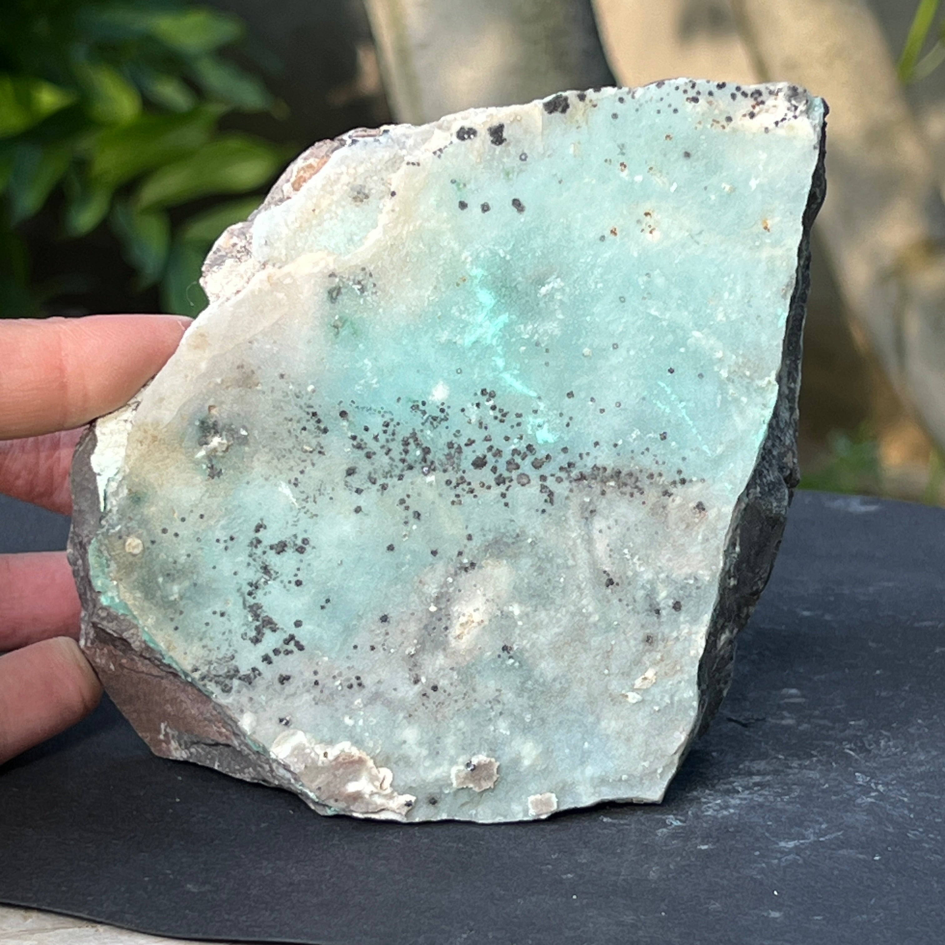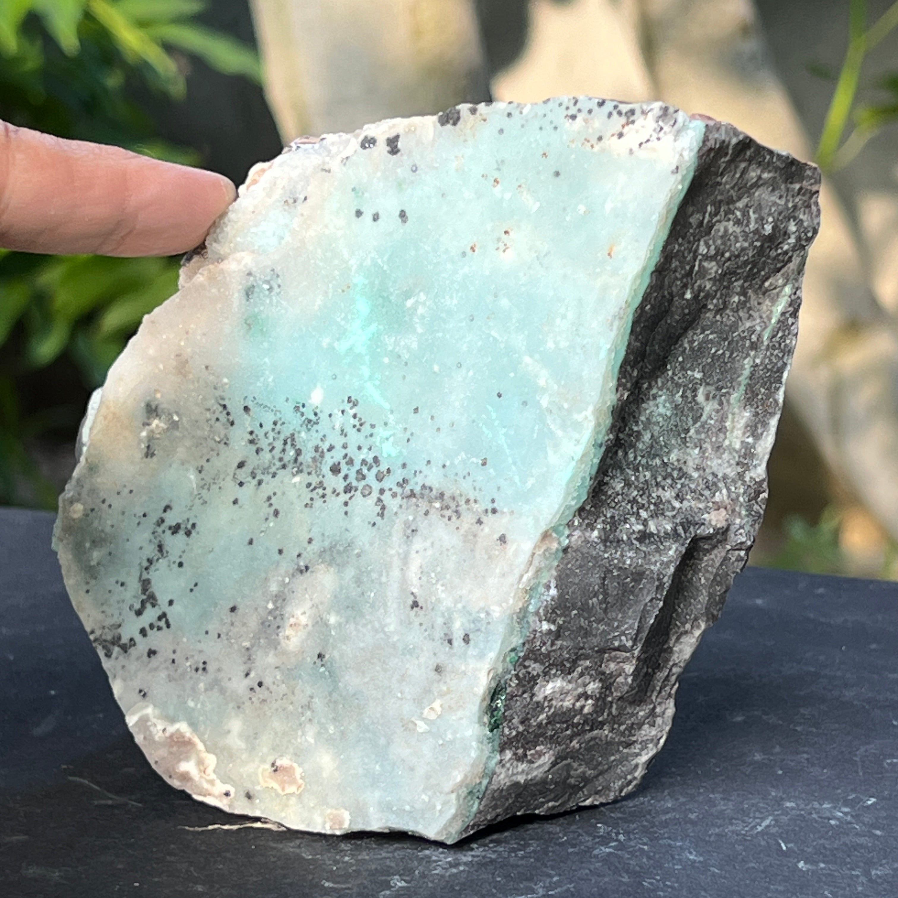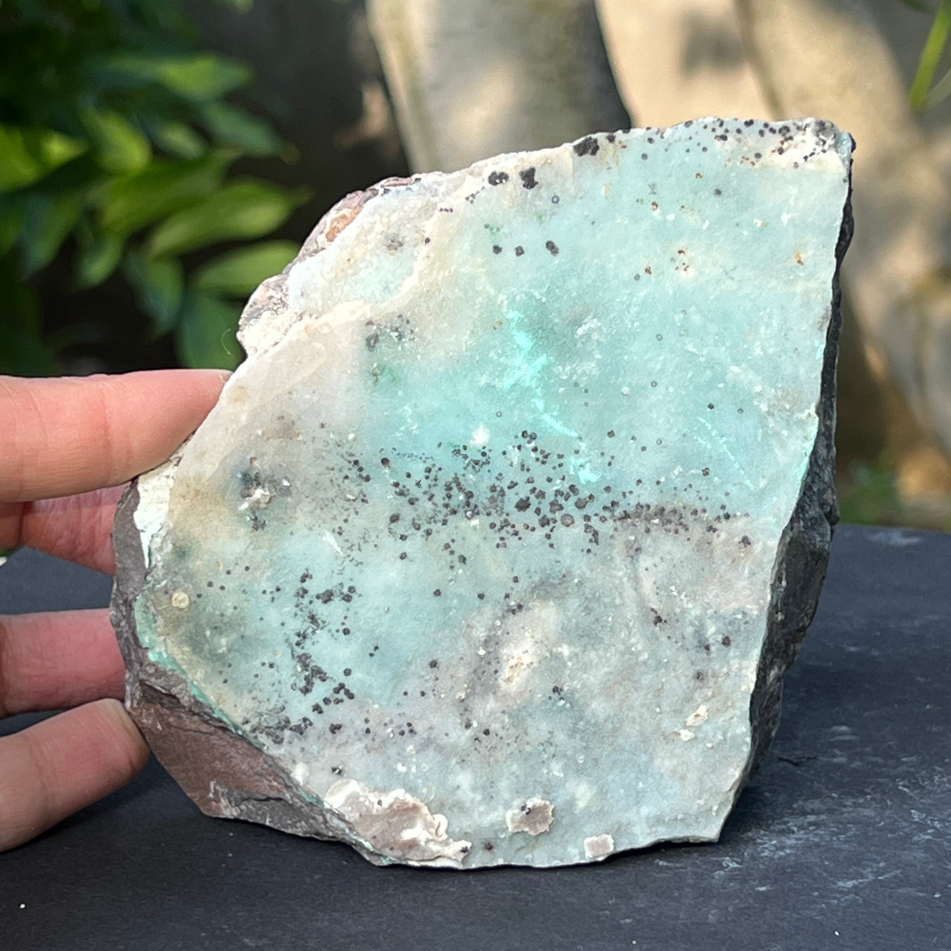 Това е естествена, ненарушена форма на хромов халцедон – трудно намиращ се минерал, извличан изключително от Зимбабве и ценен заради яркия си цвят, който не произхожда от никел (както при хризопраза), а от хрома, който пулсира дълбоко в кристалната му структура. В този особен вариант, сините и зелените включвания създават впечатляваща цветова игра с плавни преходи между прозрачно и непрозрачно, между плътно и въздушно.