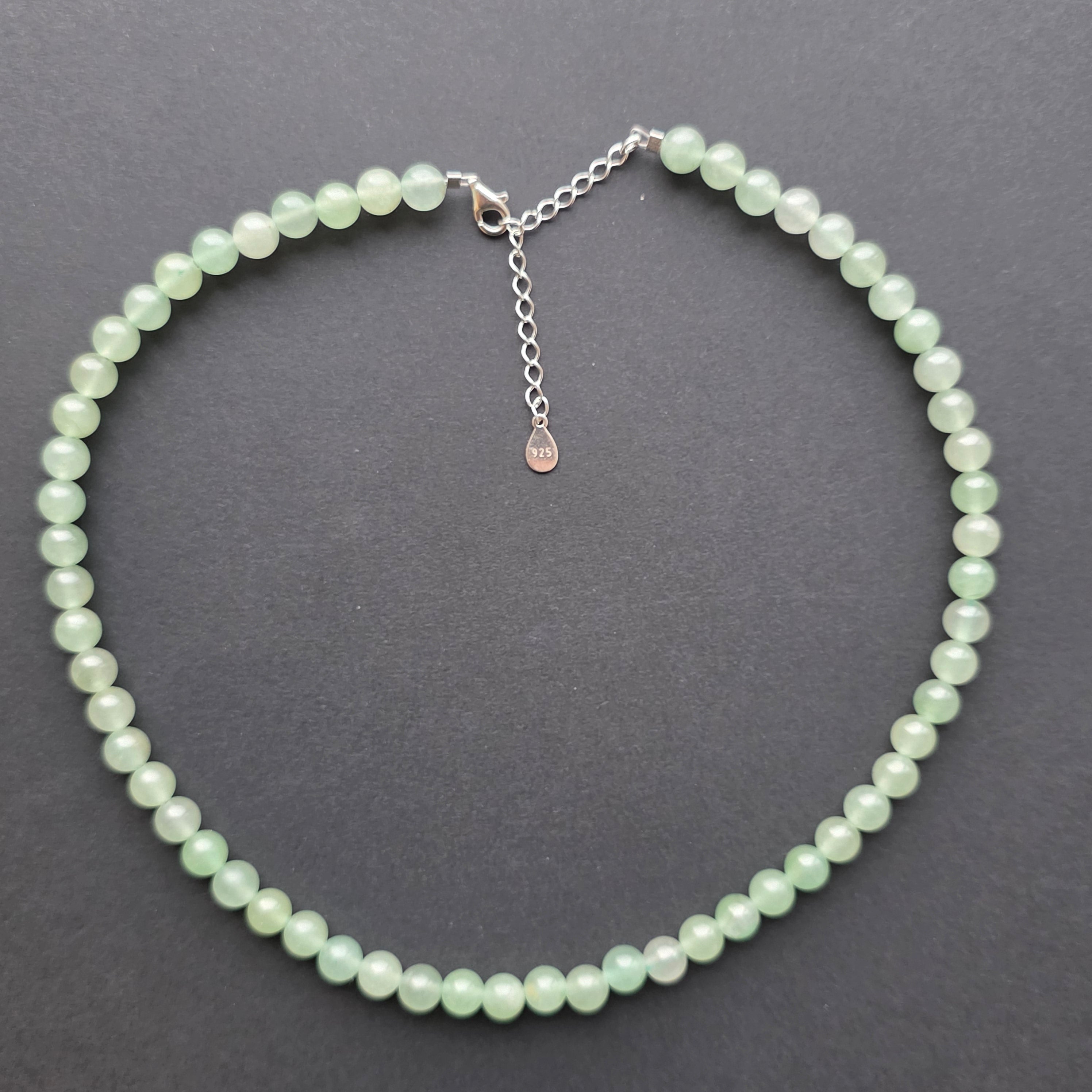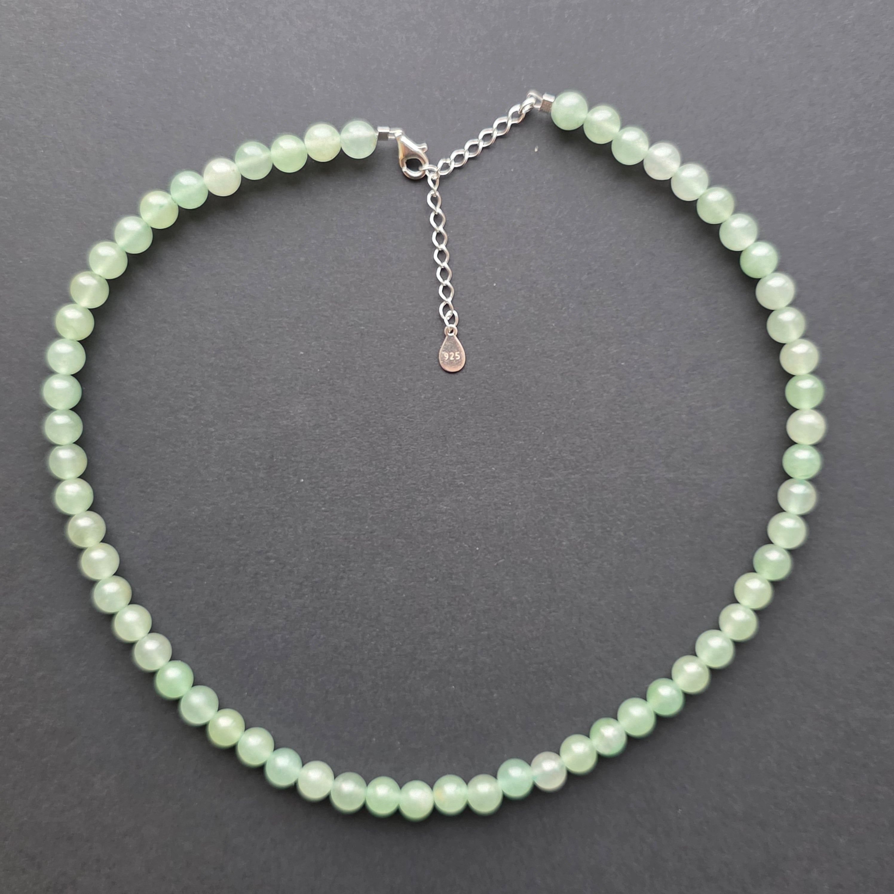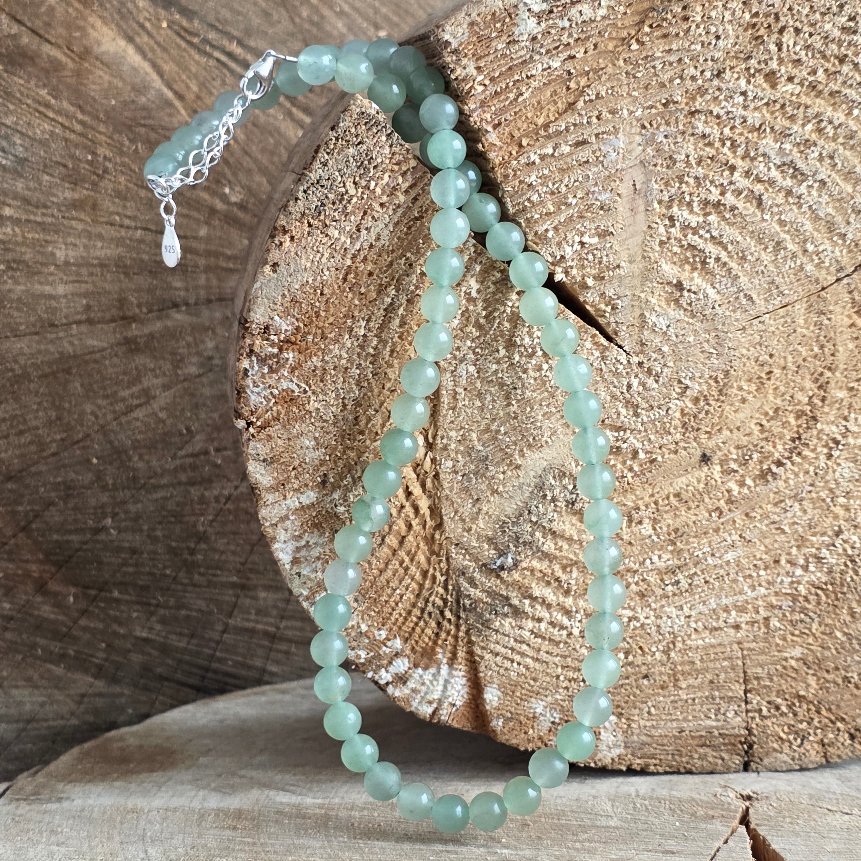 Колие, което носи енергията на свежестта и лек късмет. Естественият зелен авантюрин 6 мм излъчва спокойна и уравновесена светлина, напомняйки за младите листа и тишината на природата след дъжд. Гладката и блестяща повърхност на камъните предлага усещане за визуална хармония, а среброто 925 завършва перфектно дизайна с елегантен щрих.