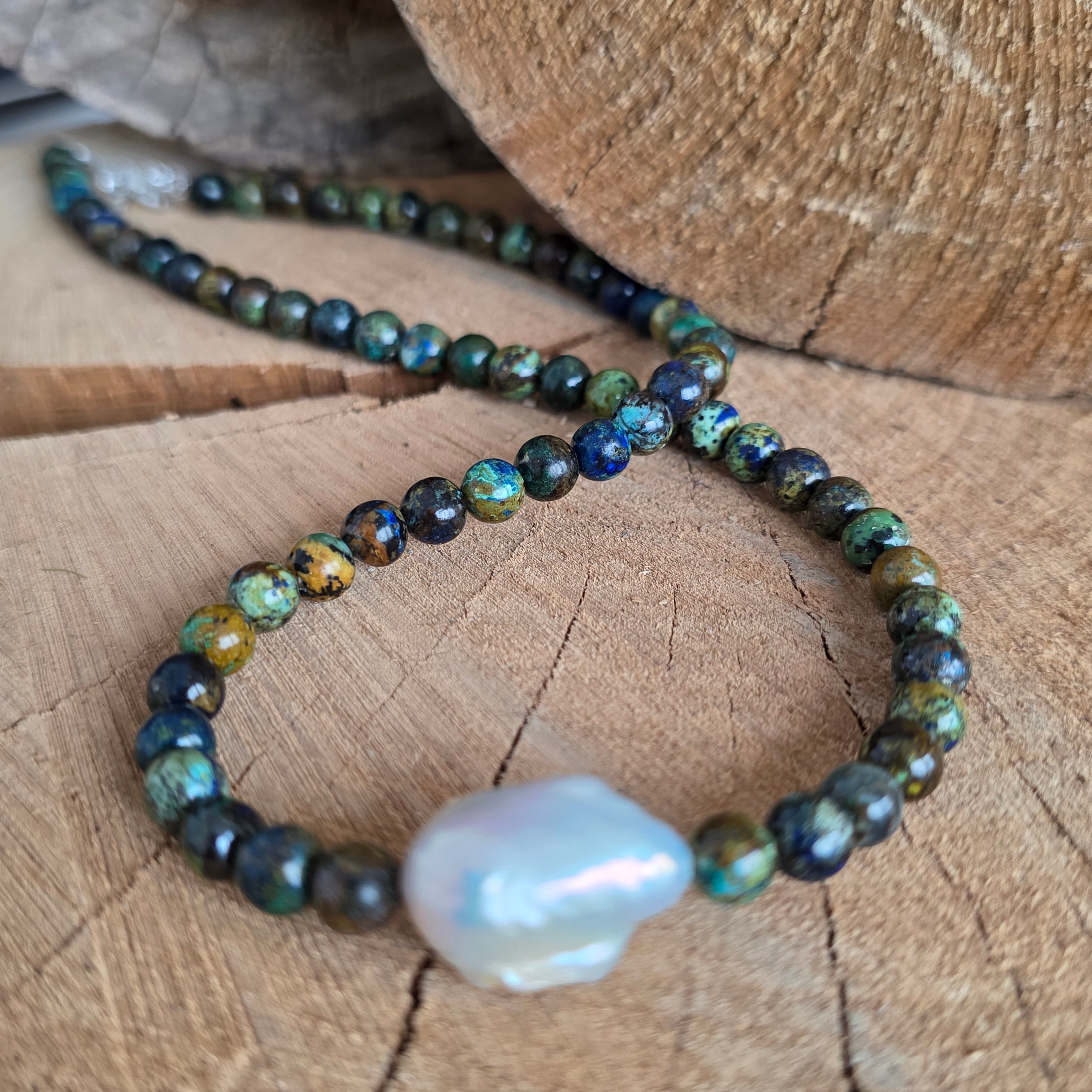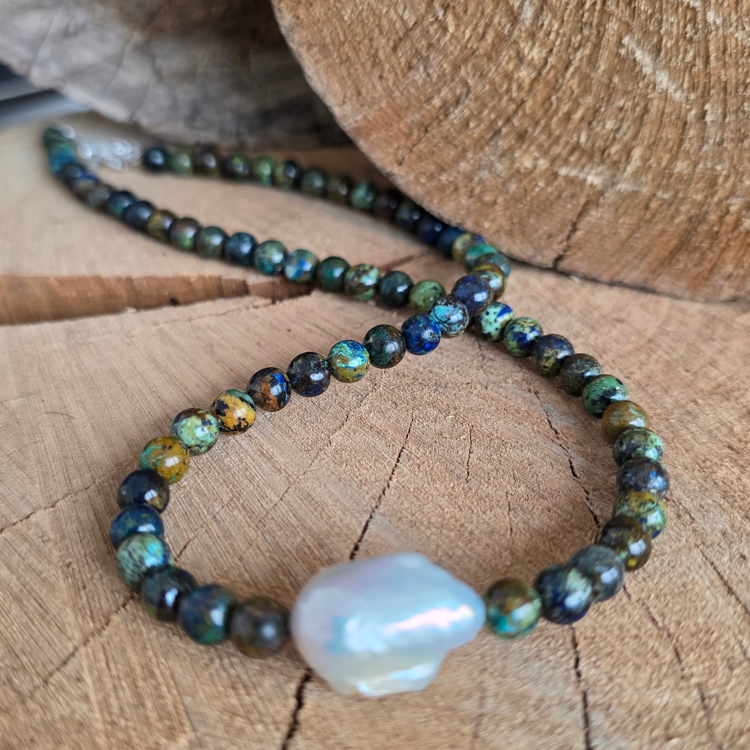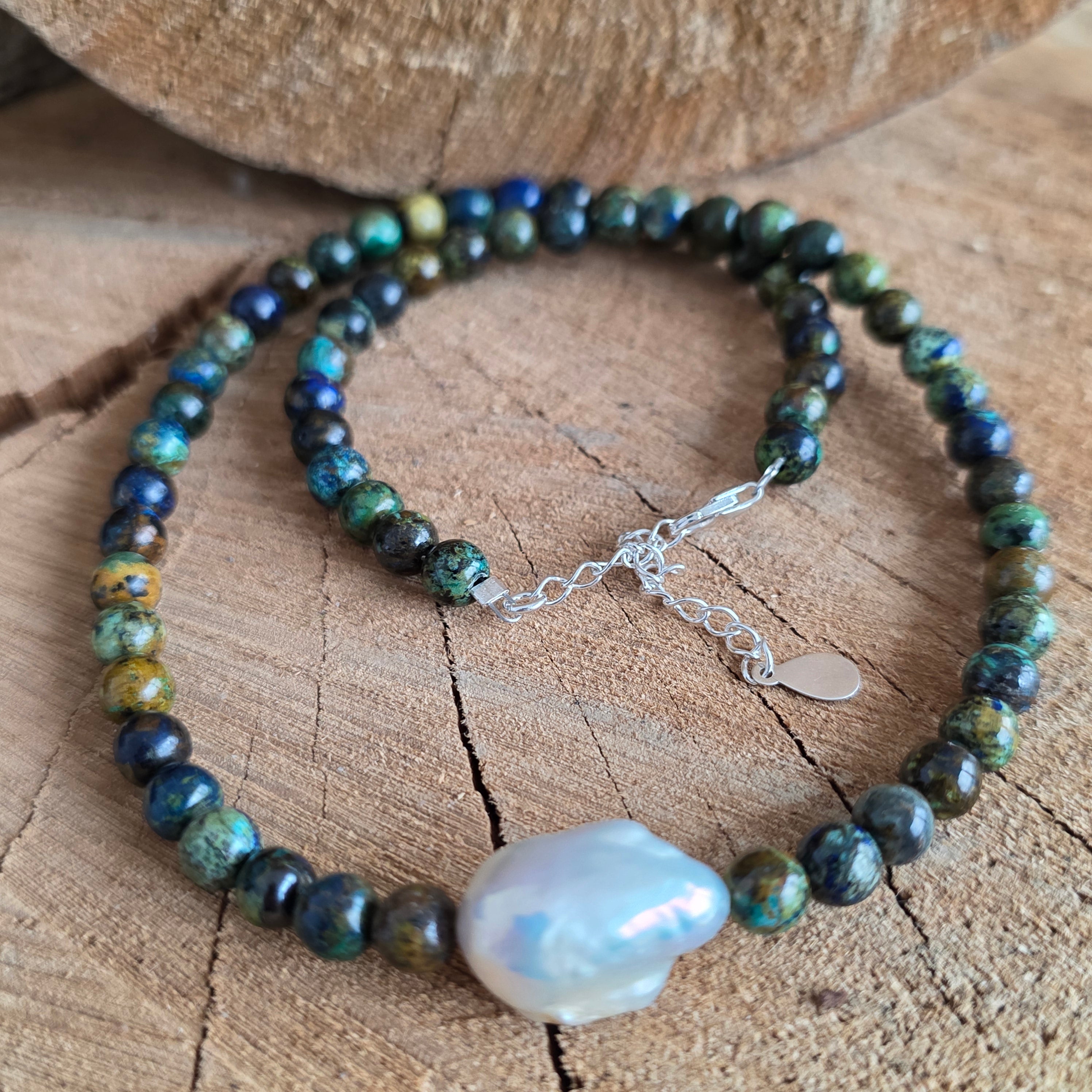Централният елемент е естествена перла с диаметър около 1 см, която добавя елегантен и светъл акцент, създавайки хармоничен контраст с студените и успокояващи тонове на целистита. Заедно тези елементи формират балансирана бижутерия с изтънчен дизайн, подходяща както за ежедневно носене, така и за специални моменти.