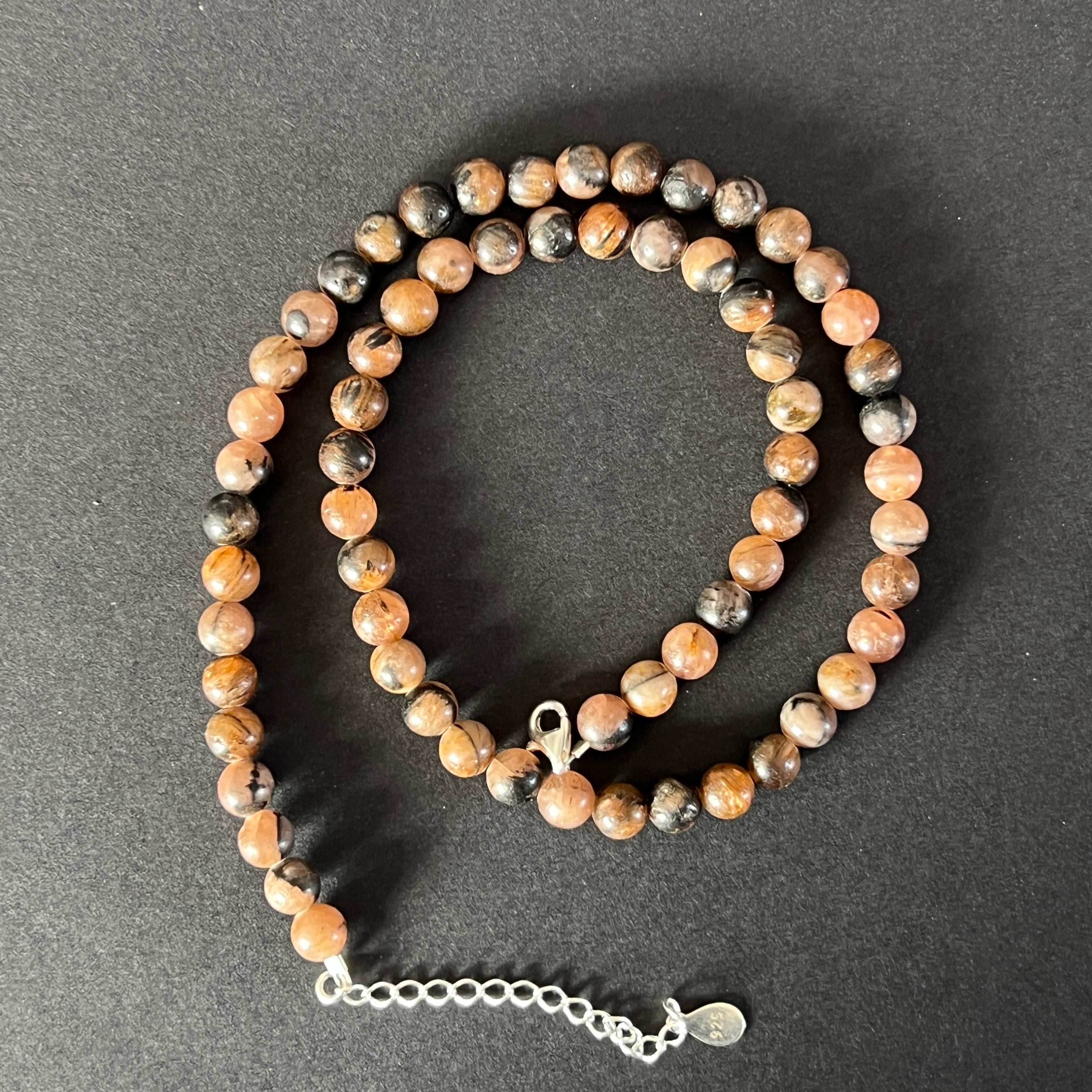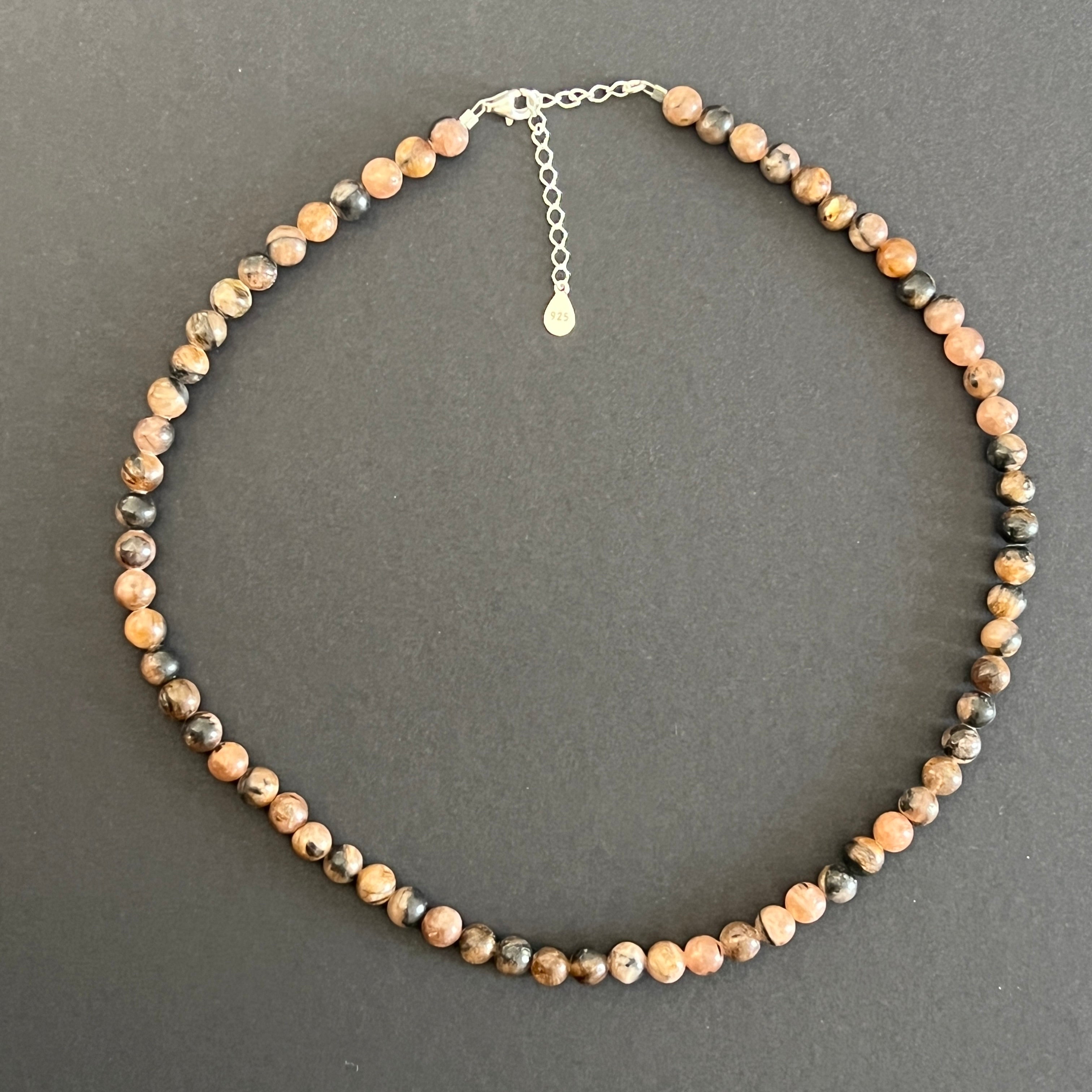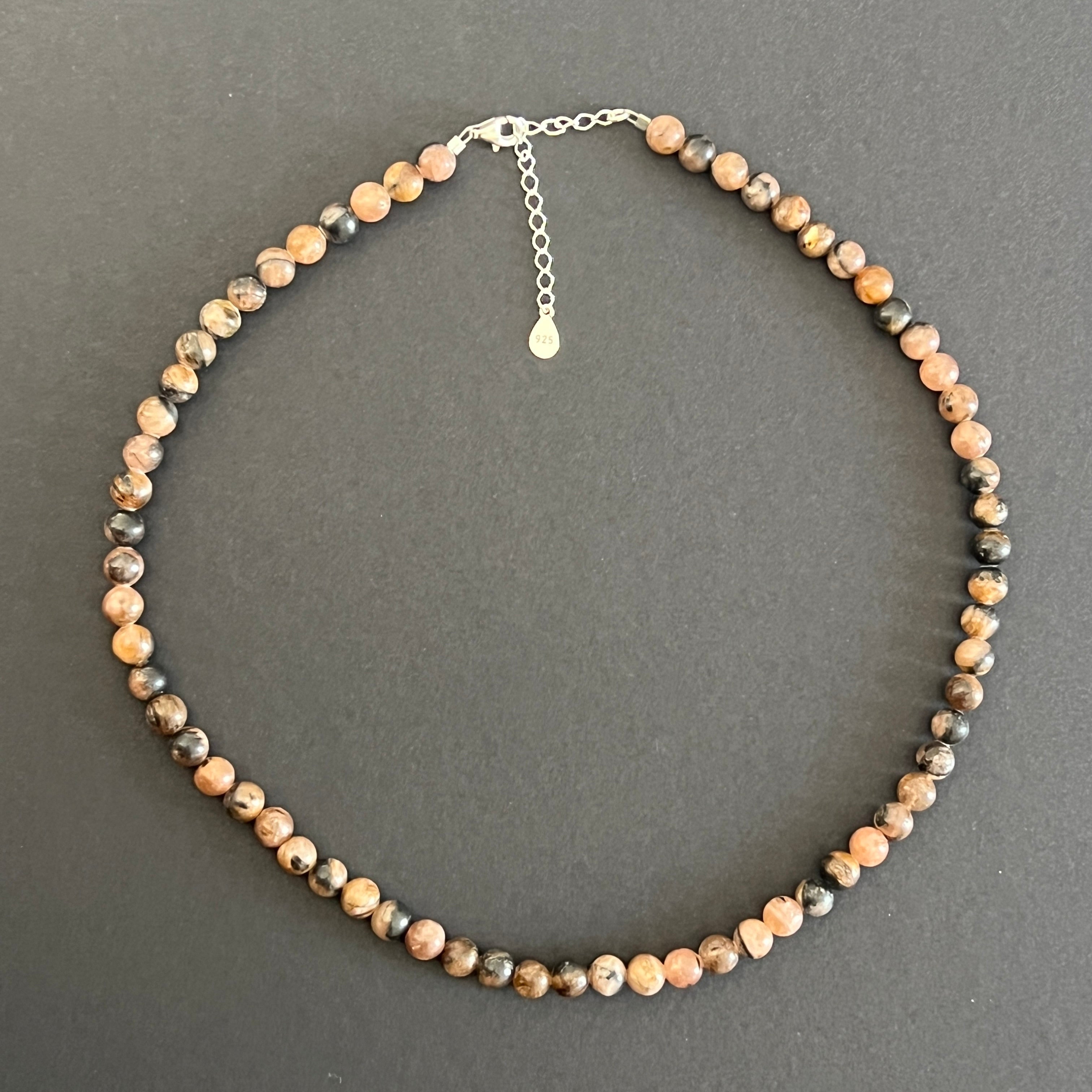 Колието носи в себе си печата на свещеното и мистерията. Хиастолитът, известен още като „камъкът на кръста“, разкрива в своята естествена структура древен символ на защита и връзка с божественото. Мънистата от 6 мм преплитат топли тонове на кафяво, сиво и охра, като всяко носи кръста, скрит в сърцевината на камъка, като печат на равновесието между светлина и тъмнина.