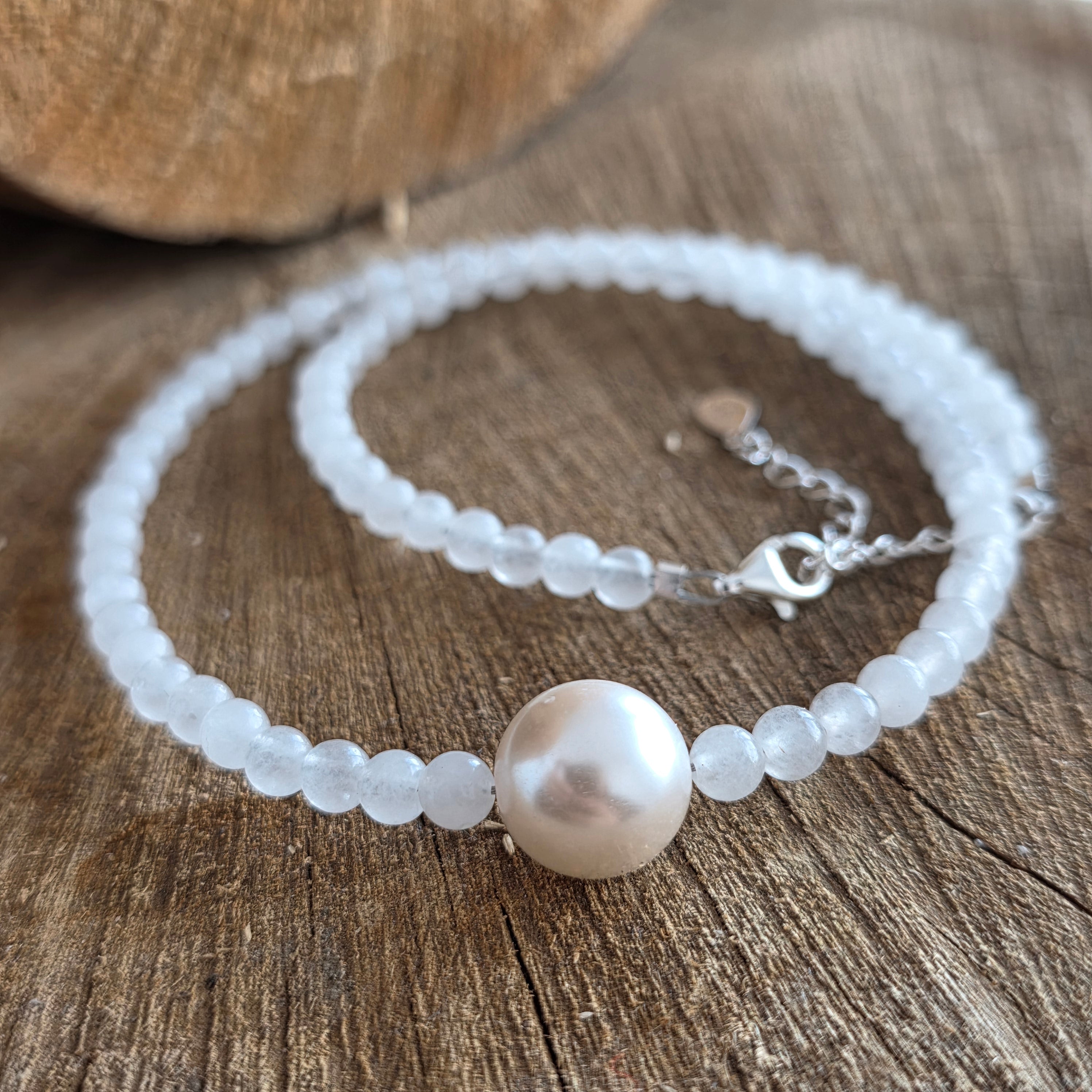 Колие с присъствие, спокойно и изискано, изработено от фасетирани топчета бял жад 10 мм, които се подреждат хармонично около шията, създавайки балансирана и светла линия. Млечнобелият цвят, понякога леко прозрачен, придава на камъка чисто и подредено изражение, а фината фасета добавя дискретни отражения, които подчертават естествената текстура, без да натоварват визуално бижуто. Дизайнът е чист и временно неутрален, подходящ за ежедневно носене или за елегантни акценти.