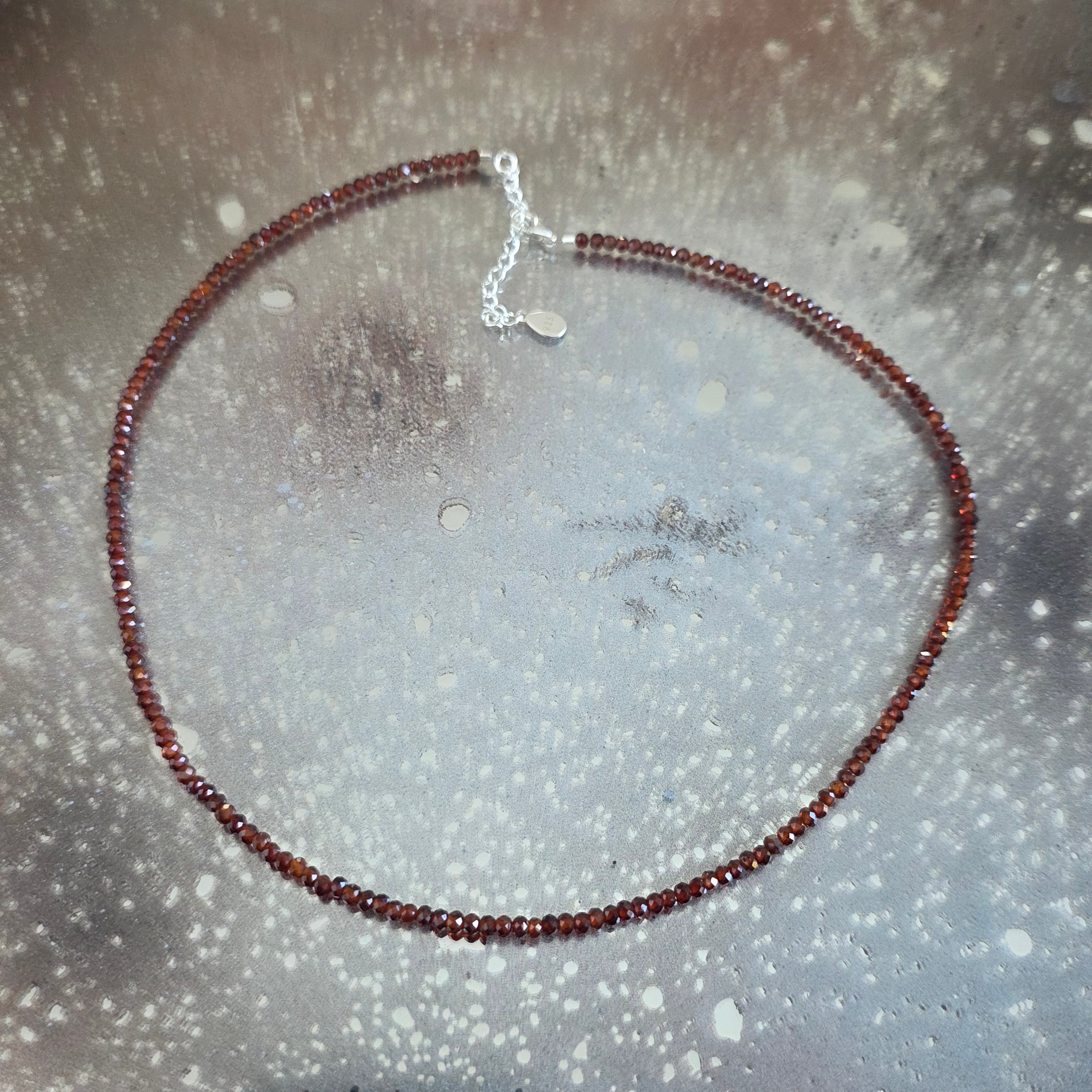 Колие с дълбочина и топлина, изработено от фасетирани мъниста тъмен оранжев гранат 3 мм, които очертават фин, но интензивен контур около врата. Богатите тонове, с оттенъци на изгорял кехлибар и дискретни червеникави отблясъци, създават елегантна и зряла цветова игра, а деликатната фасетировка добавя контролирани блясъци, без да претоварва визуално бижуто. Дизайнът е балансиран, подходящ както за ежедневно носене, така и за по-рафинирани акценти.