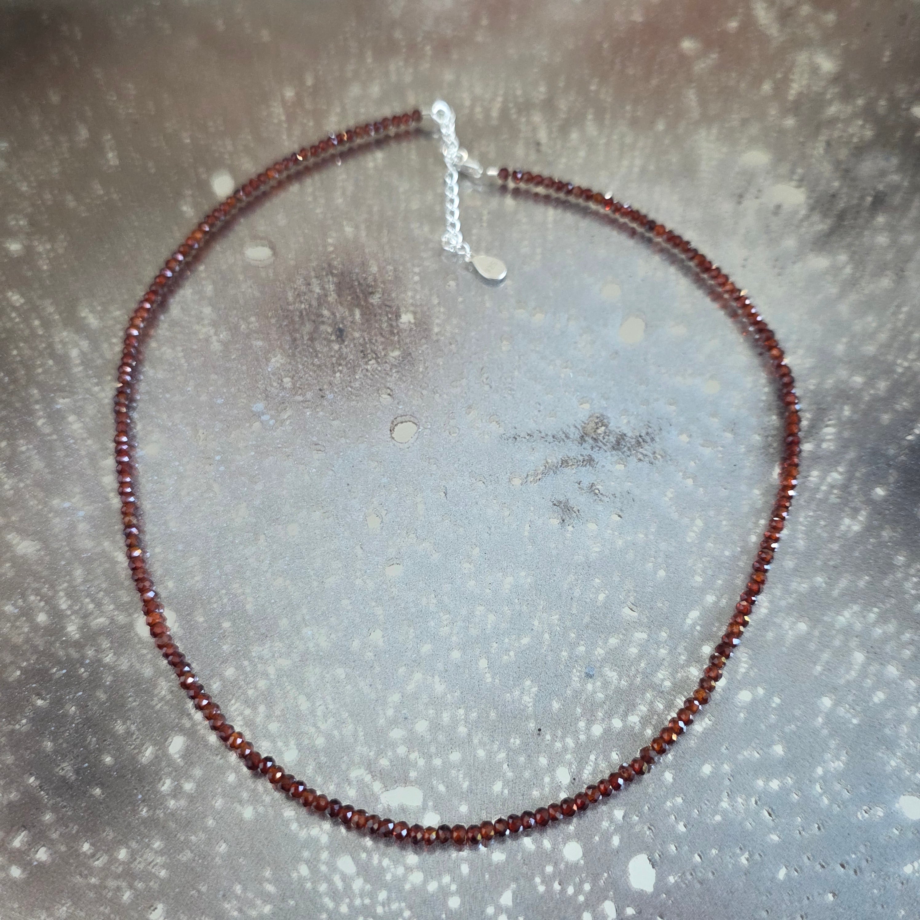 Материали: тъмен оранжев гранат, фасетирани мъниста 3 мм, сребро 925