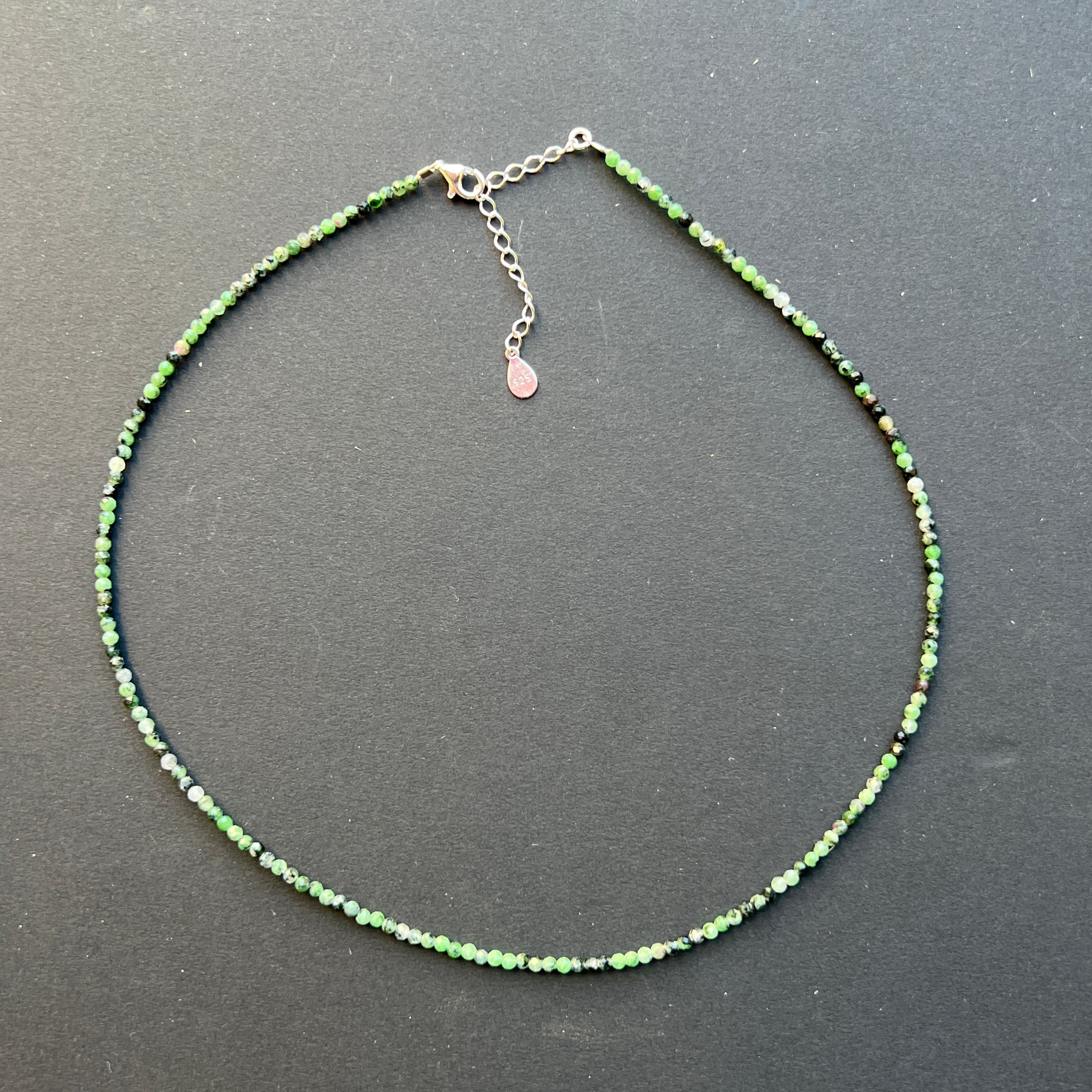 Бижу, което шепне в нюанси на свежо зелено и тъмни сенки – като тайна градина, останала непокътната от времето. Това финно колие от естествен зоисит, съставено от фасетирани топчета с диаметър 2,5 мм, се поставя грациозно в основата на шията, като нишка мистерия, която деликатно обгръща.