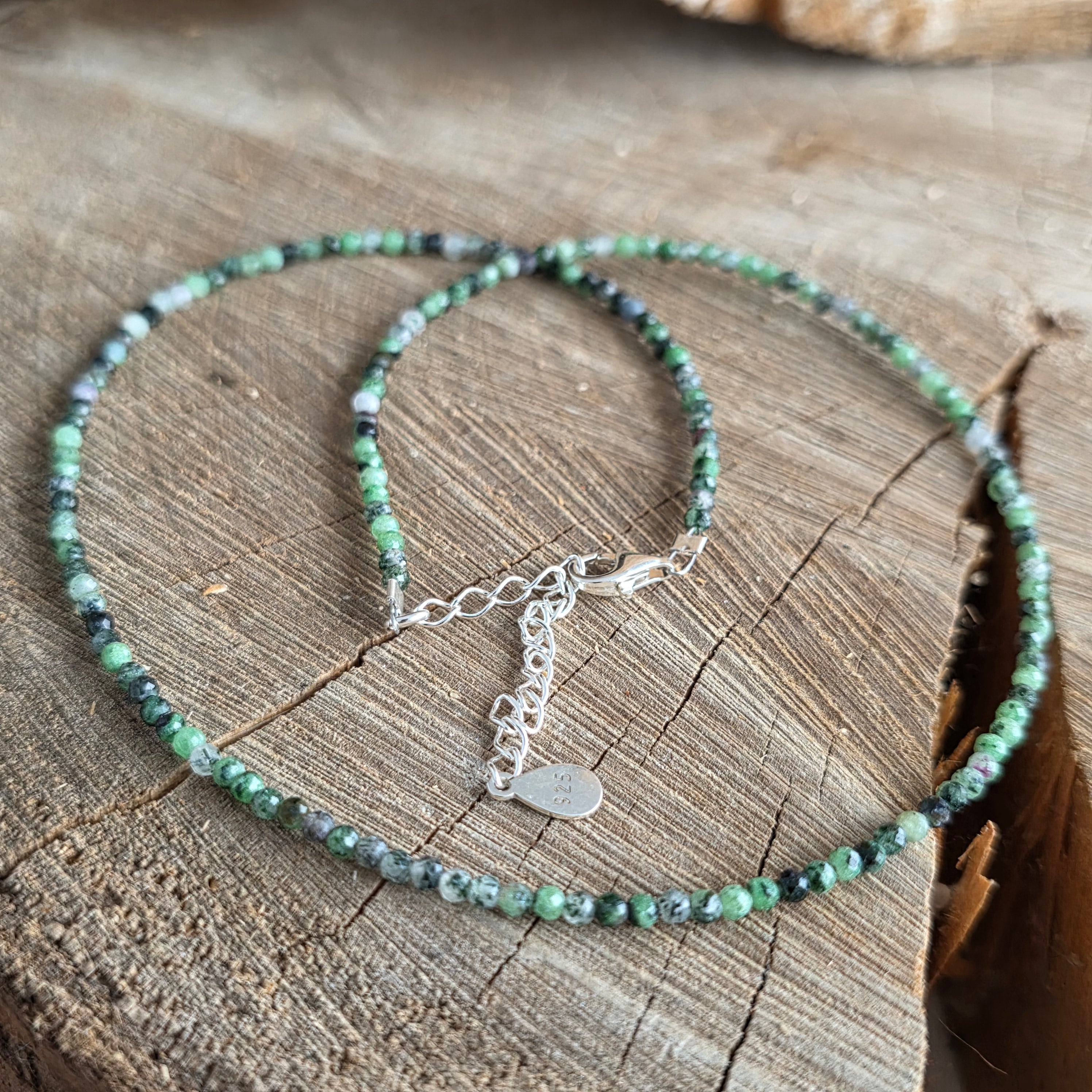 Зоиситът е камък на прераждането и приемането, тих съюзник в моментите, когато искаш да се обърнеш към себе си. Неговото жизнено зелено подпомага жизнеността и обновлението, докато по-тъмните тонове добавят дълбочина – като сенки, които разкриват светлината отвътре. Това колие е за баланс, за спокойствието, което идва от силата да продължиш напред.