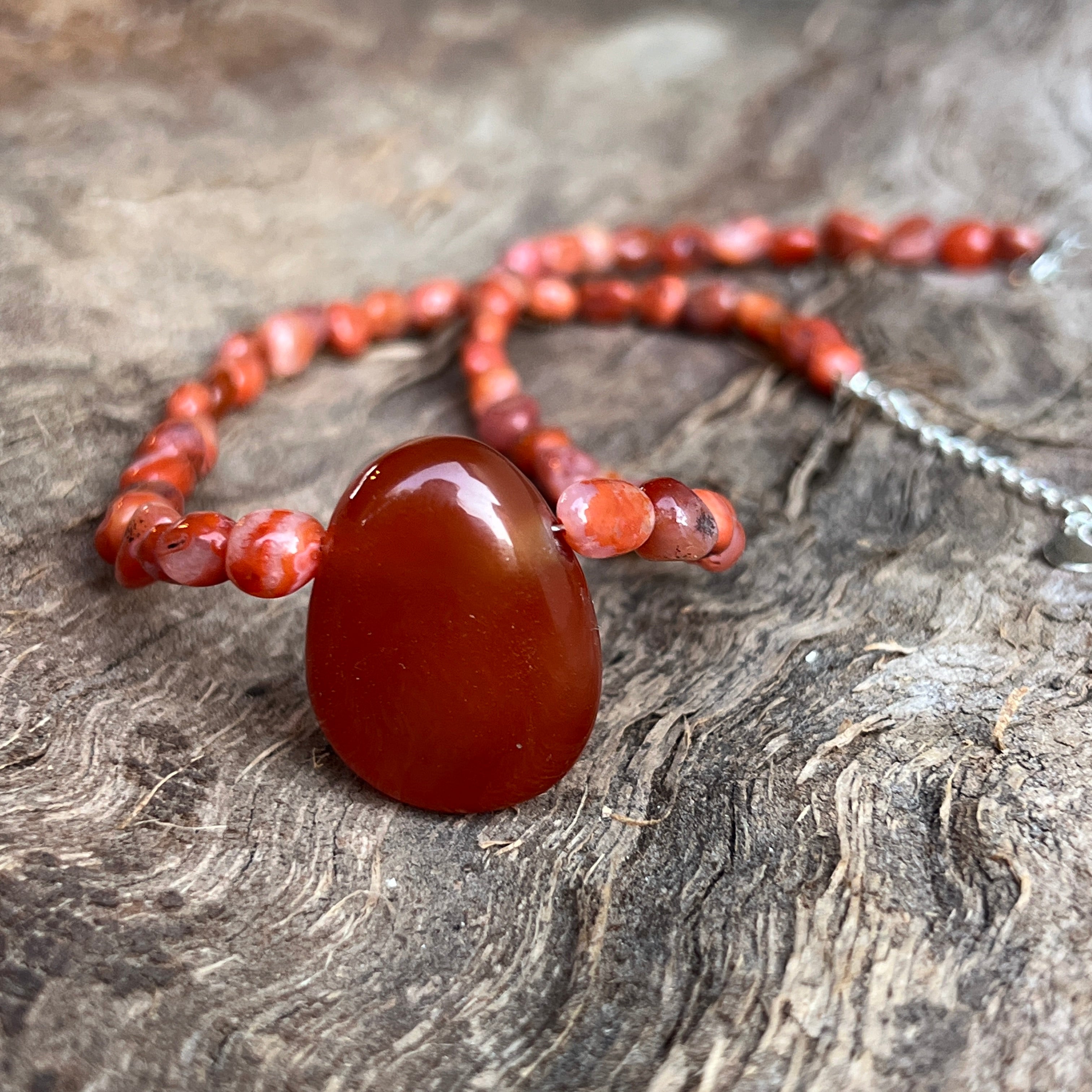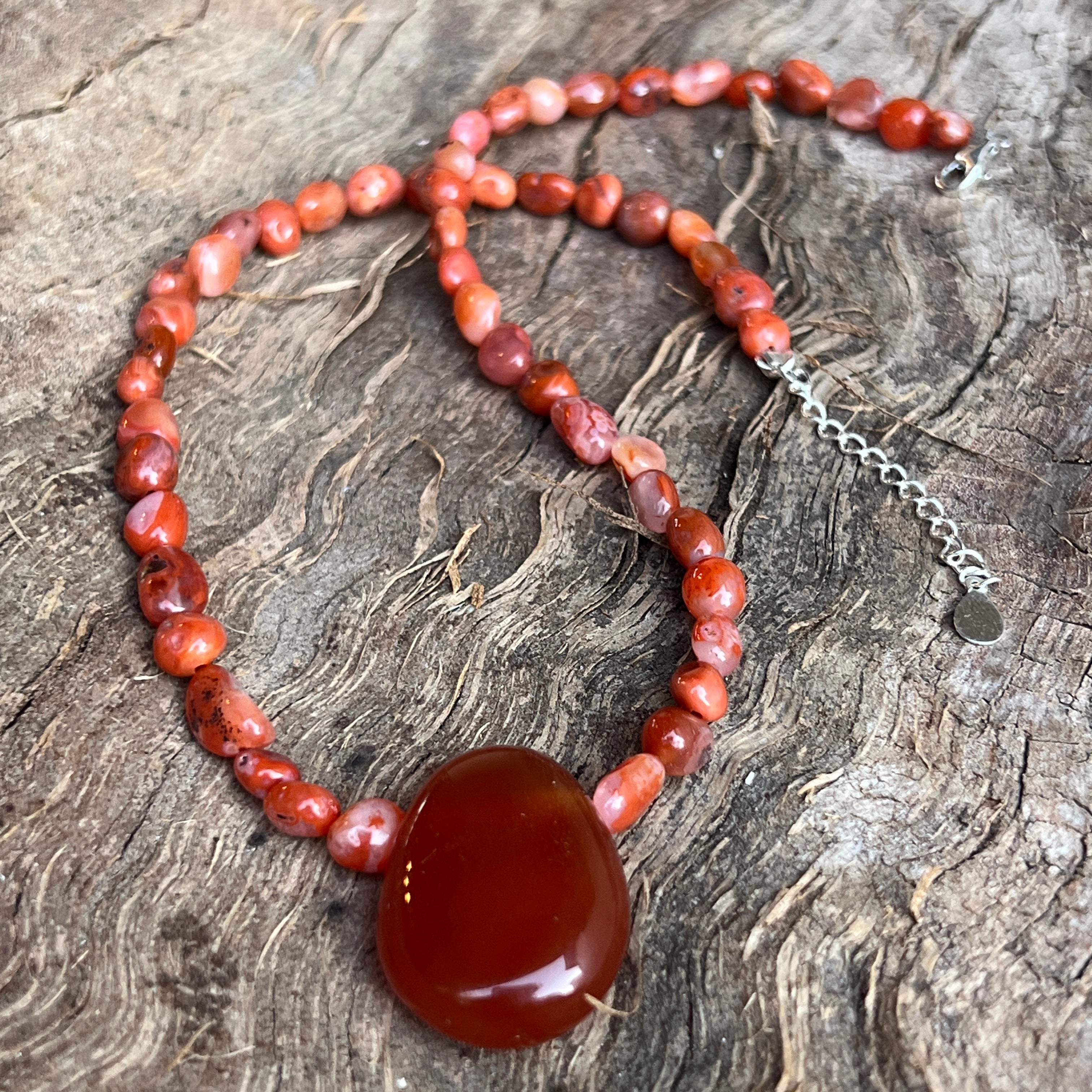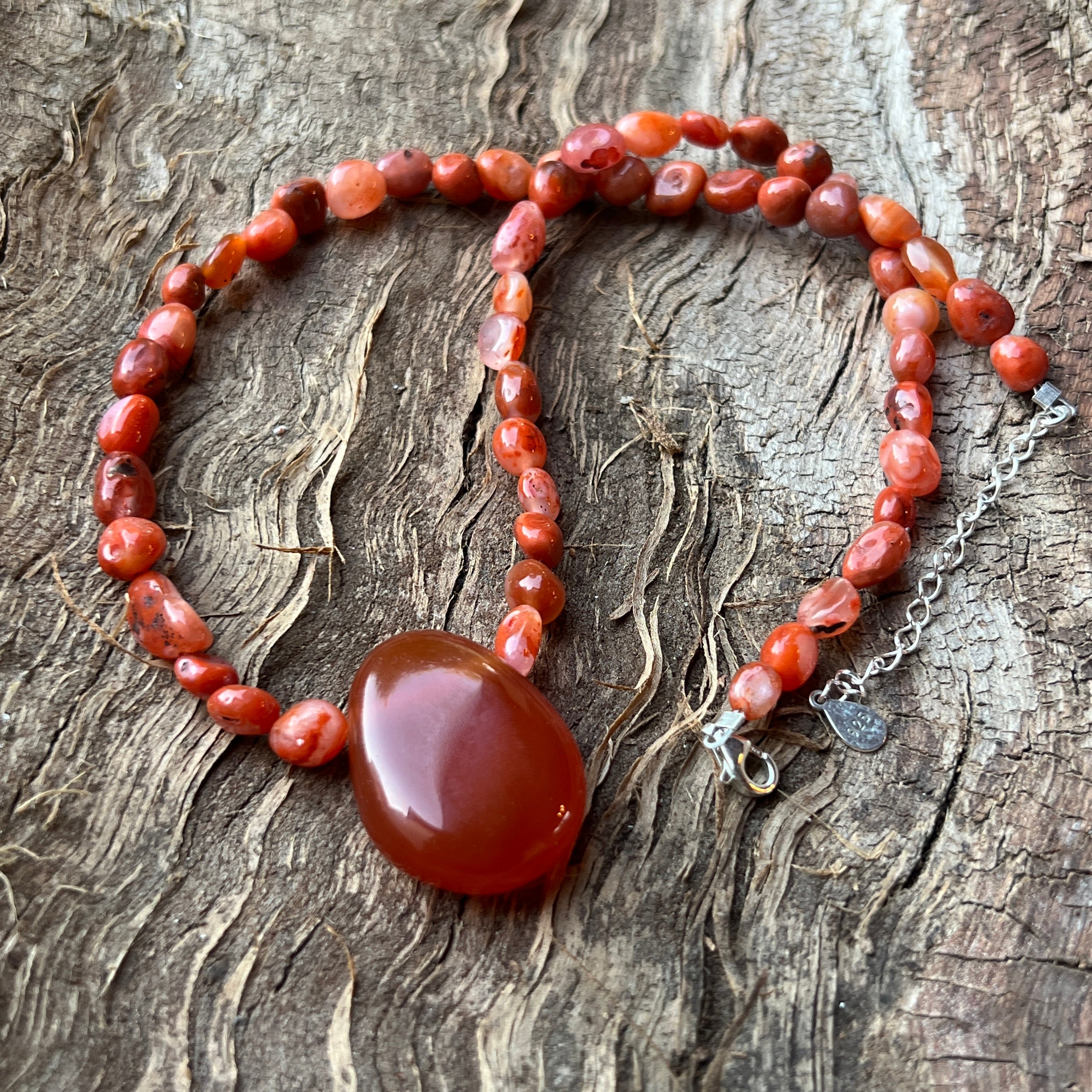 Материали: натурален карнеол 6–8 мм, капковиден карнеол ~3 см, сребро 925