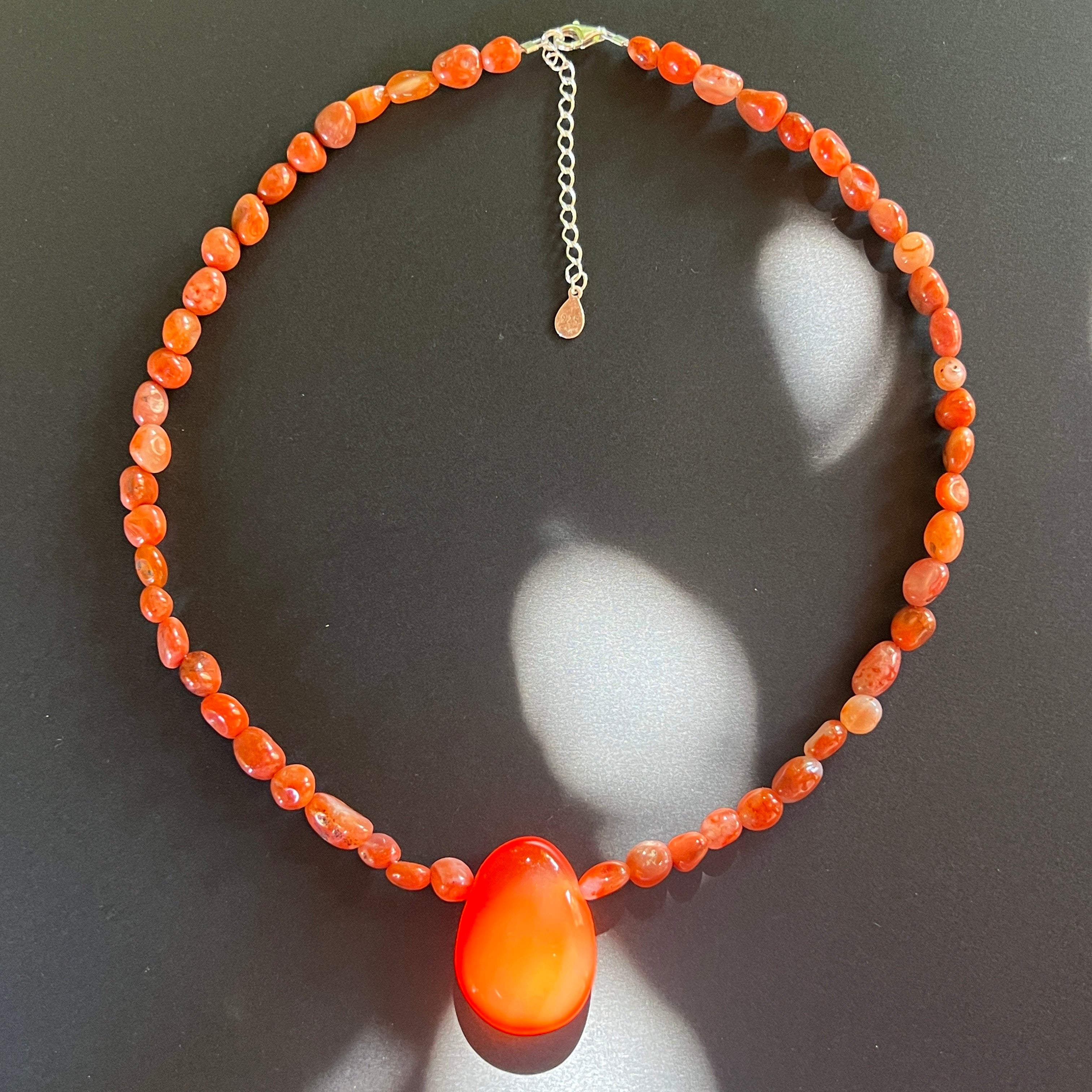 Колие като укротен пламък – топло, живо и изпълнено с нежна сила. Гладките мъниста от карнеол с размери между 6 и 8 мм излъчват в ярки тонове на оранжево, червено и кехлибар, като светлина от сърцето на Земята, която е придобила форма и цвят.